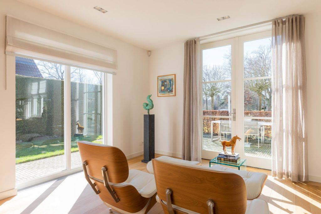 • woonkamer met tuindeuren naar het terras aan de voorzijde van de woning;
