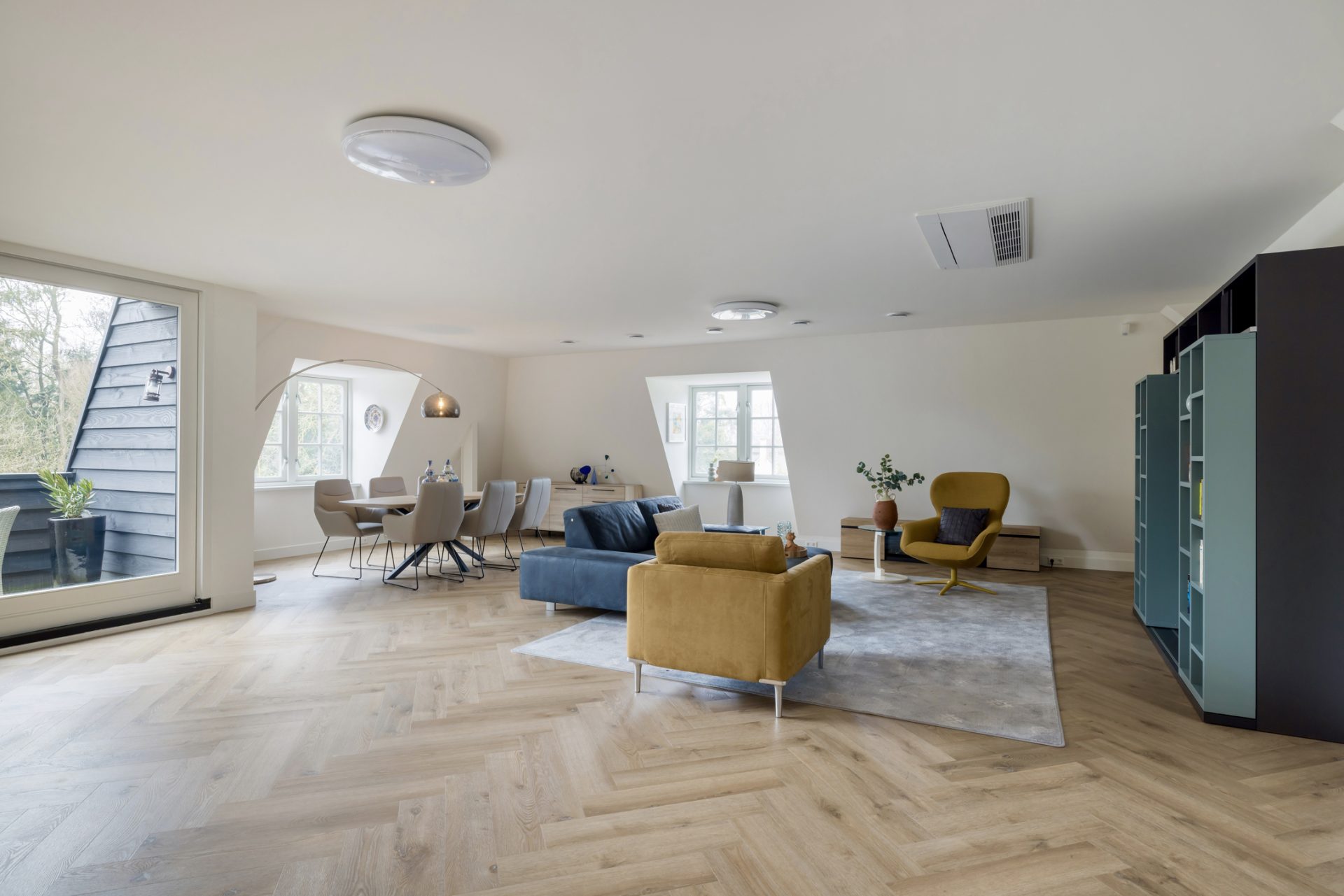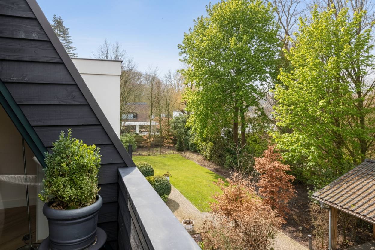 De woonkamer is ruim en licht, met een aangename verbinding naar het balkon. Grote raampartijen zorgen voor een prettige relatie met de groene omgeving en versterken het gevoel van rust en privacy.