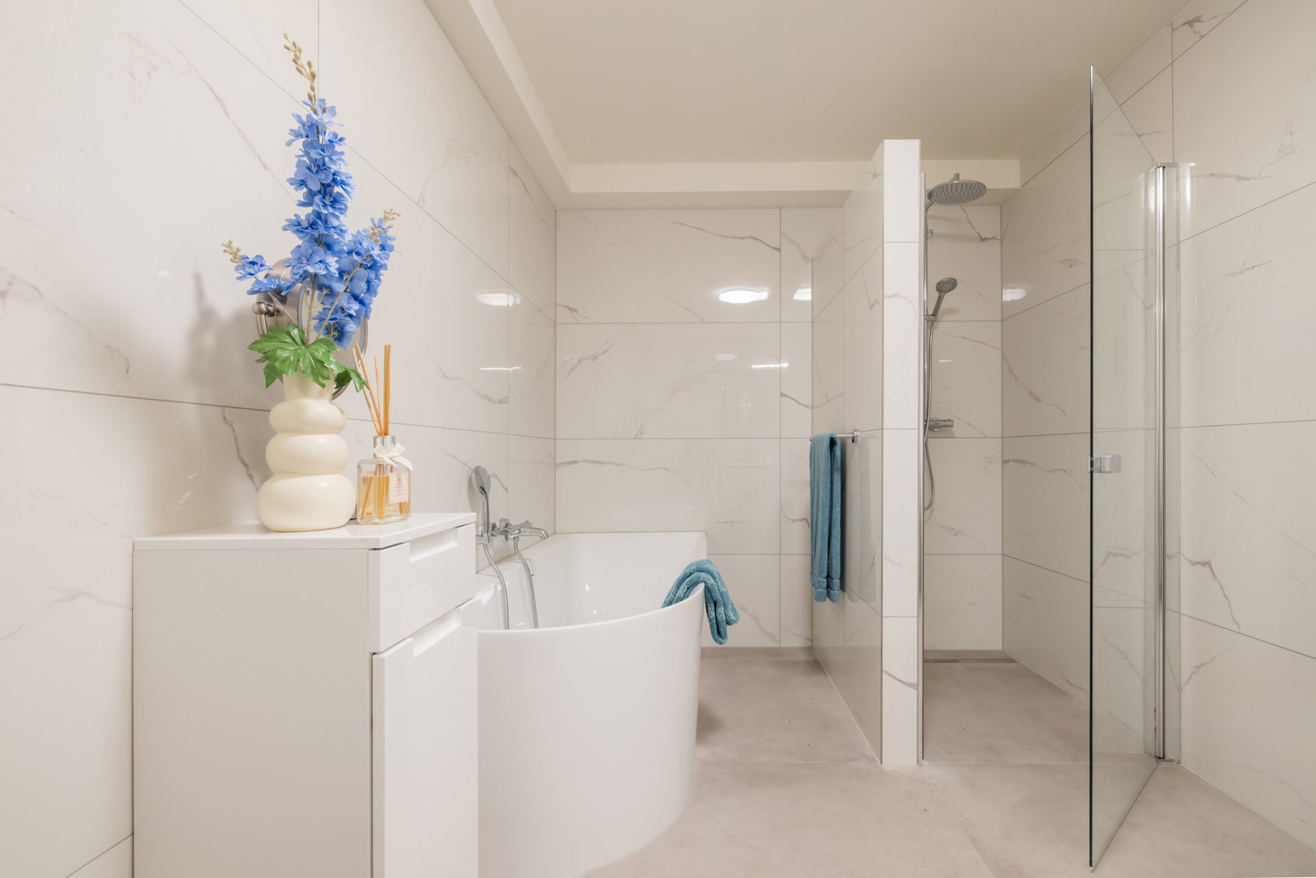 Het appartement beschikt over twee comfortabele slaapkamers, beide van goed formaat en flexibel in te richten. De luxe afgewerkte badkamer is uitgevoerd met hoogwaardige materialen en voorzien van moderne sanitaire voorzieningen, wat bijdraagt aan het verzorgde en exclusieve karakter van de woning.