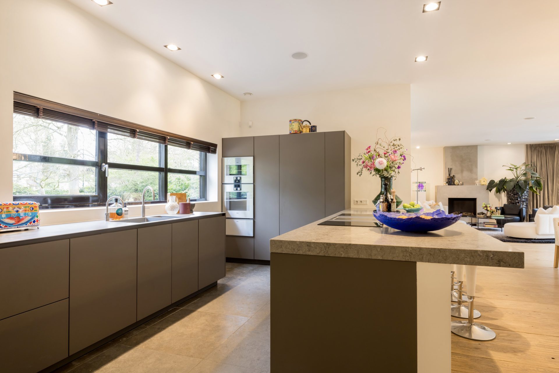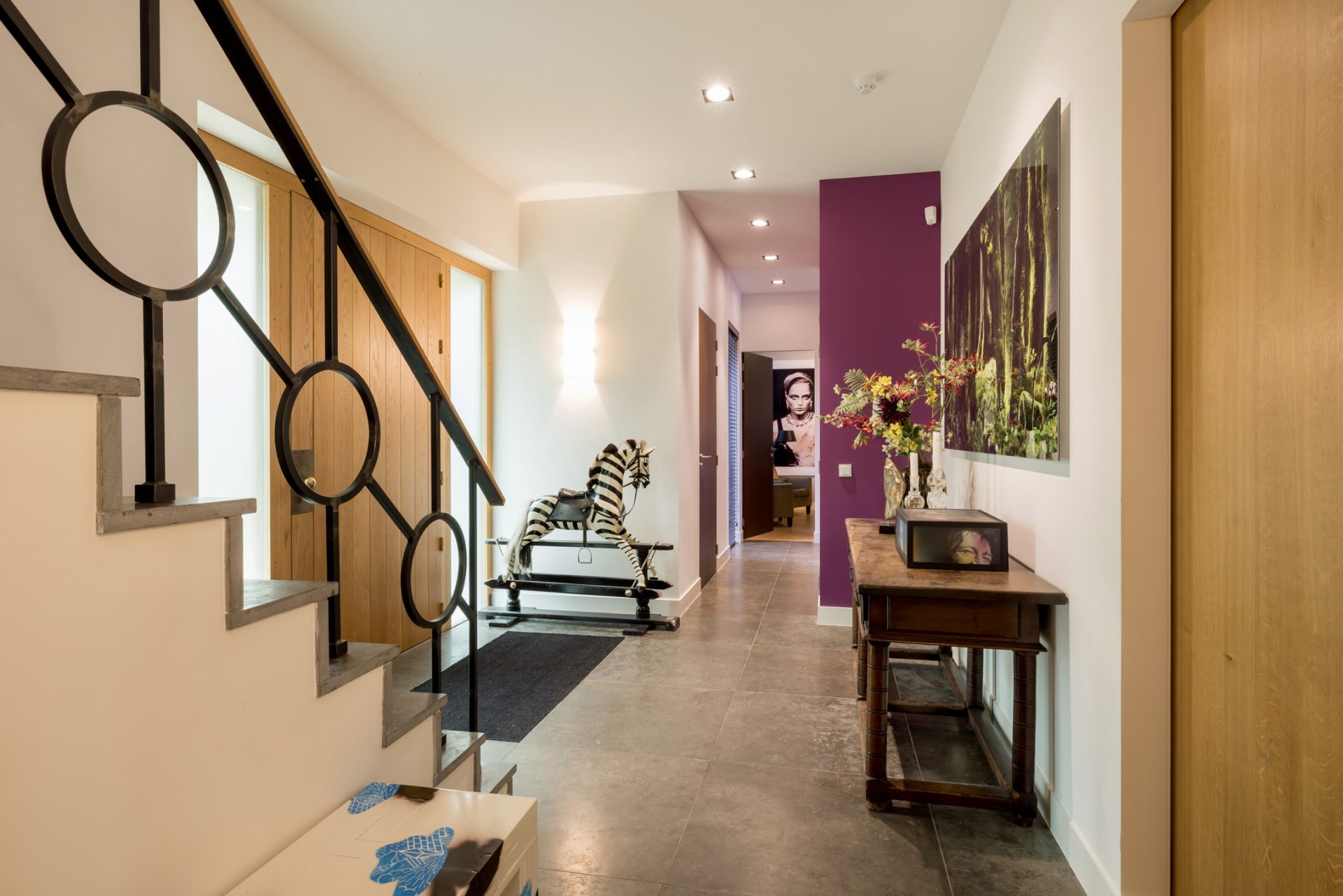 Wat een overweldigende entree heeft deze villa! In de royale ontvangsthal valt direct de speciaal ontworpen, handgemaakte stalen trapleuning op – een prachtig designstuk dat perfect samengaat met het strakke stucwerk, de inbouwverlichting, tegelvloer en stijlvolle binnendeuren. Het geheel zorgt voor een indrukwekkend welkom. Links in de hal bevindt zich het gastentoilet en aan de rechterzijde, verscholen achter een deur, leidt een trap naar de wijnkelder.