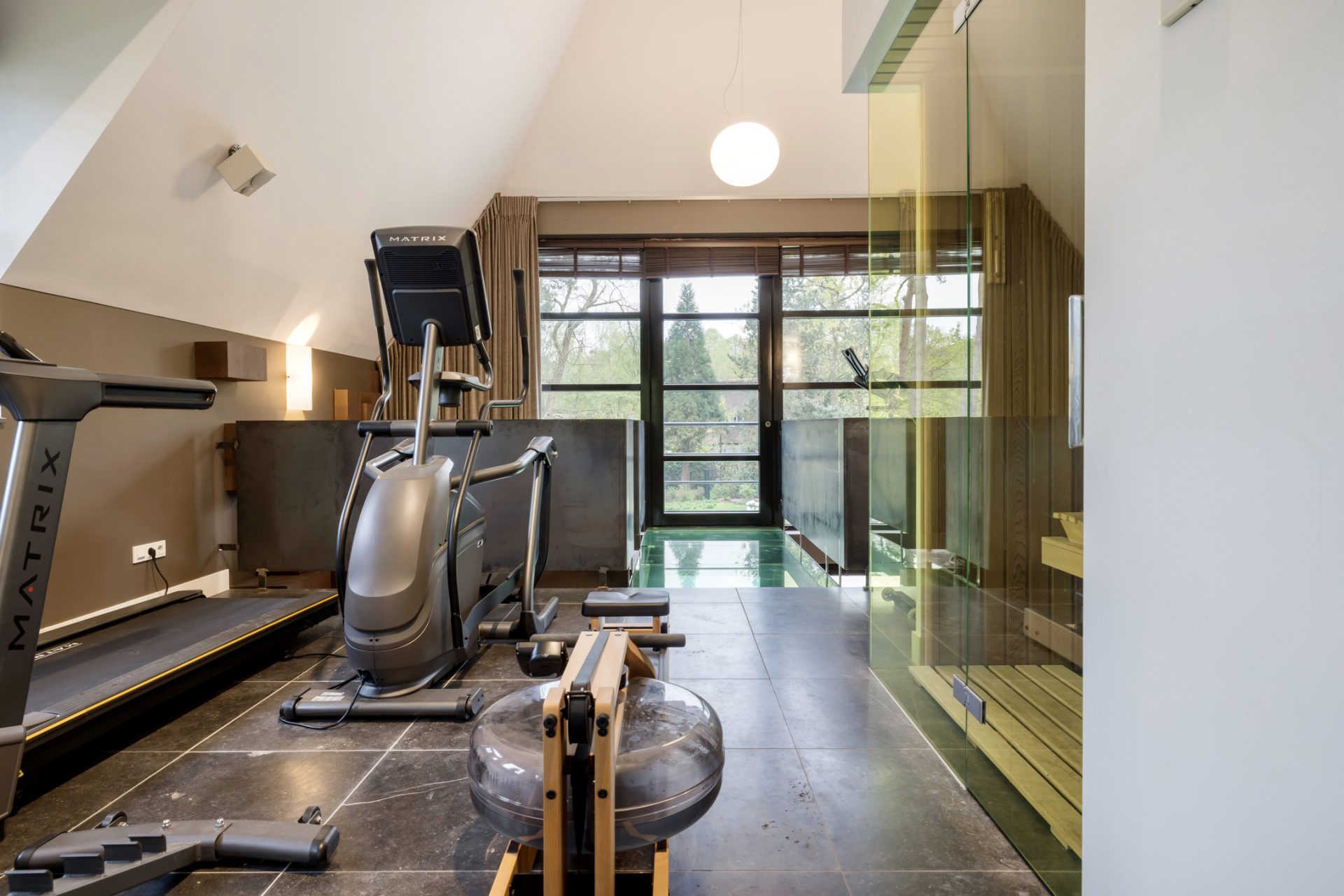 Aan de andere zijde van de villa, te bereiken via de hal, zijn de functies werk en ontspanning aanwezig. De kantoorruimte aan de voorzijde, met een maatwerk interieur, is de perfecte plek om te werken en de bar, aan de achterzijde, heeft een uitstekende ligging ten opzichte van het zwembad. Ook bevindt zich hier een badkamer en een sierlijke trap naar de bovengelegen gym met sauna.