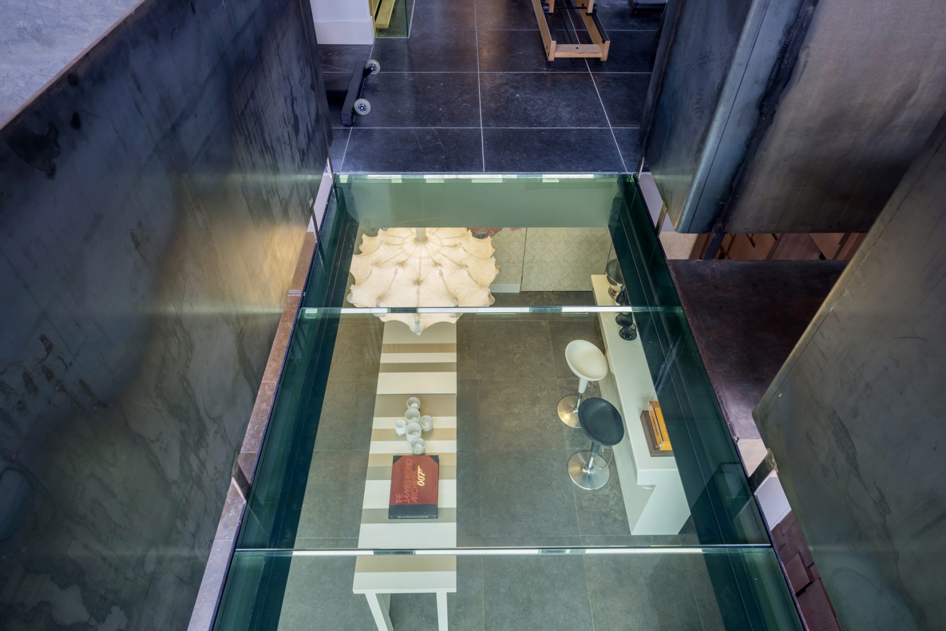 In het achterste deel van de villa, rechts van het overdekte terras, is de tv-kamer met een en-suite werk-/studeergedeelte. Deze ruimte, met een speels niveauverschil en hoog plafond, wordt gekenmerkt door fraai lichtinval en een haast intieme sfeer.