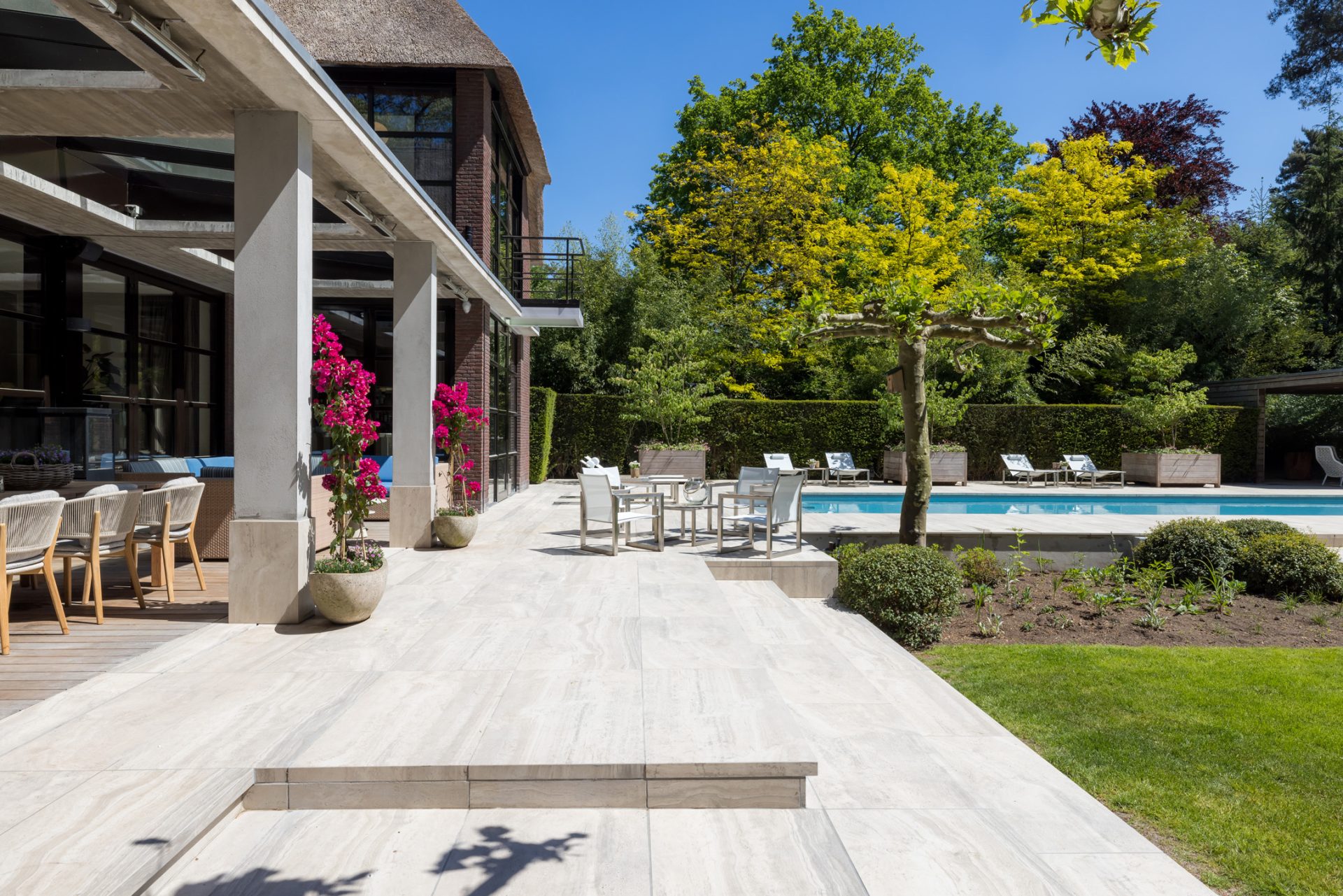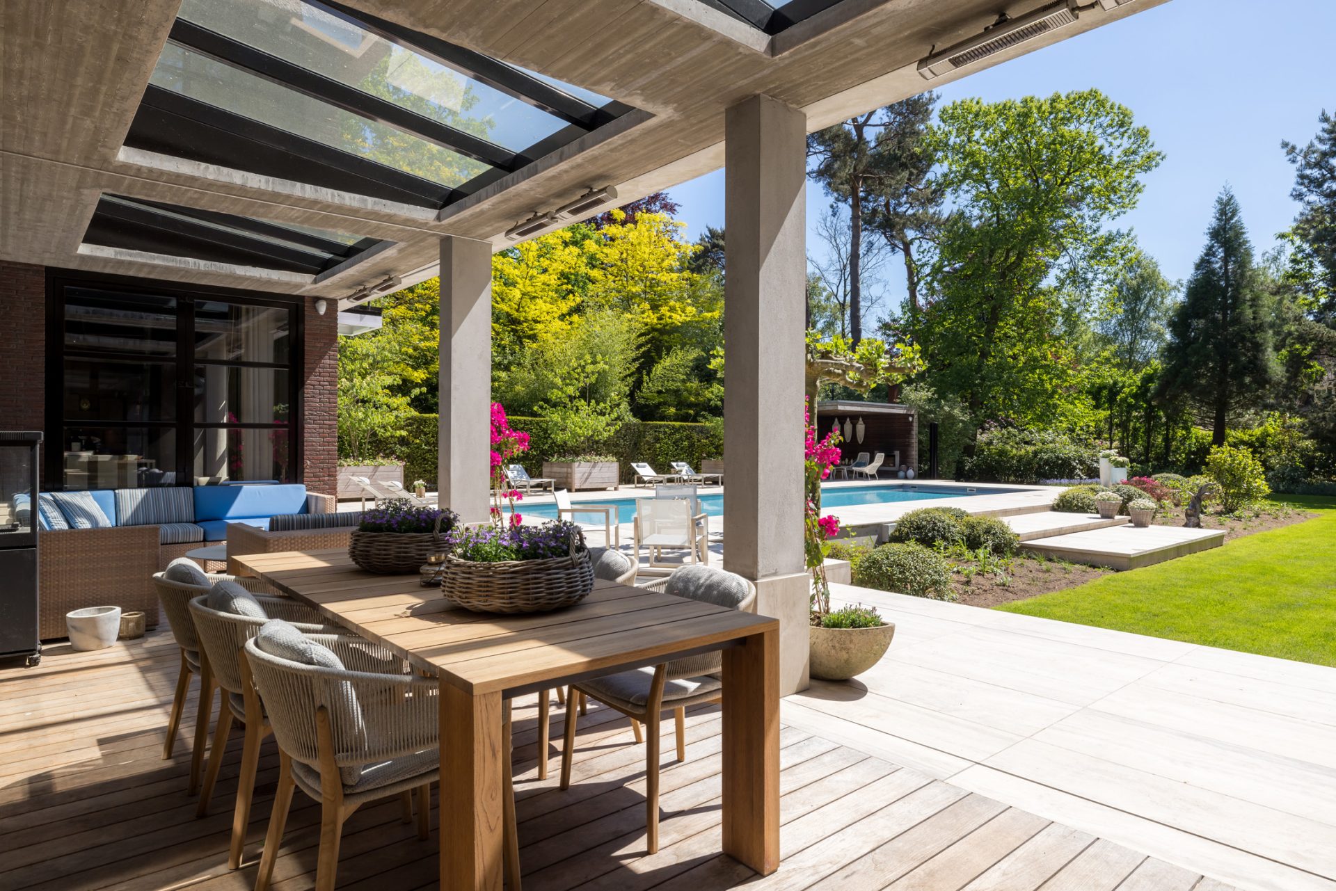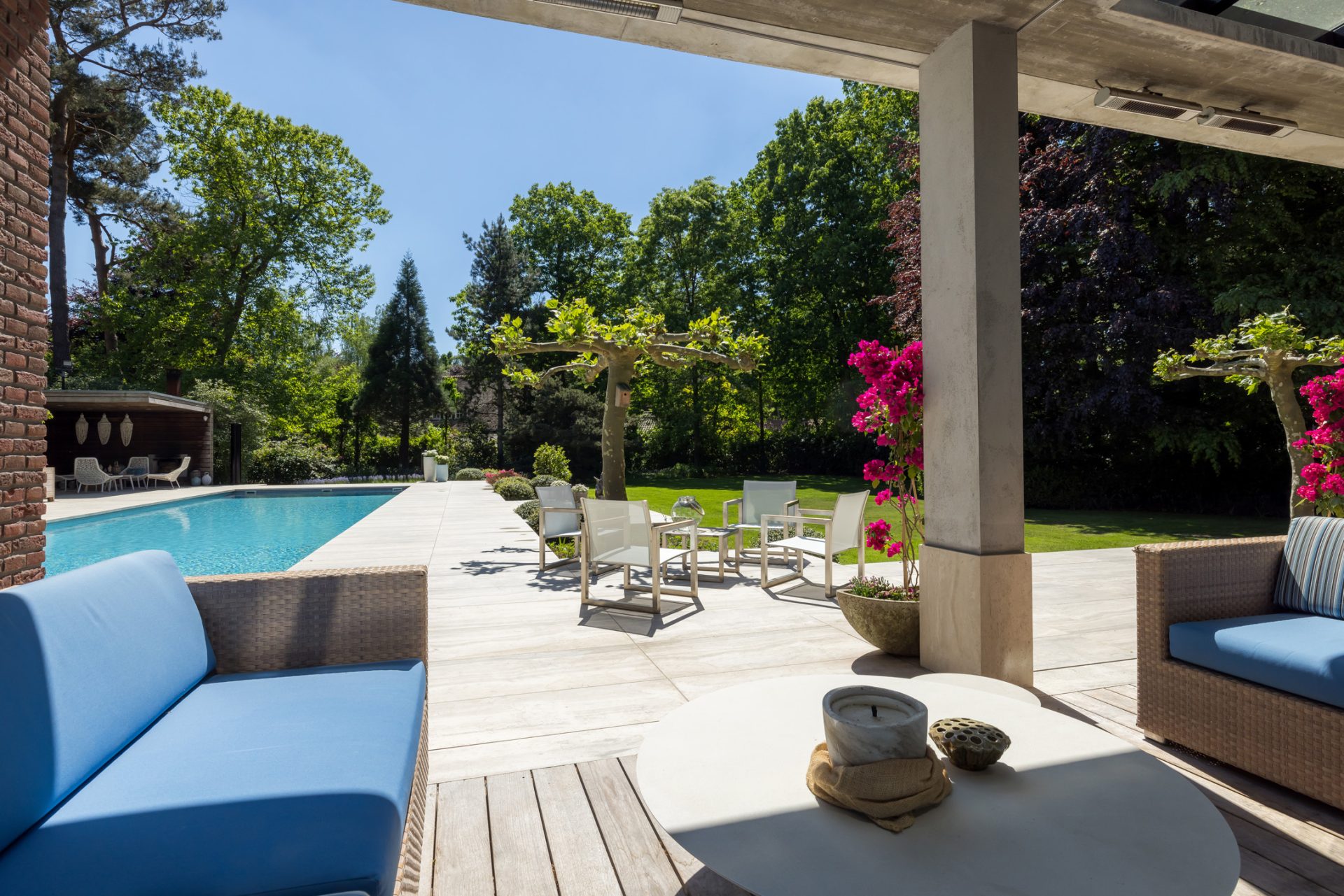Rondom de villa ontvouwt zich een tuin van royaal formaat, met de uitstraling van een park en optimale privacy. Het grote, deels overdekte terras is een geweldige plek om van al het moois te genieten en aan de andere zijde van het zwembad is een sfeervol terras met buitenhaard gebouwd. Verder zie je groene hagen, hoge bomen, brede borders en een frisgroen gazon. Zoals het bij een villa van dit niveau betaamt, is er aan de voorzijde een dubbele oprijlaan met royale parkeergelegenheid op eigen terrein. De vrijstaande garage, aan de linkerzijde van het perceel, maakt deze droomvilla tot een perfecte match.