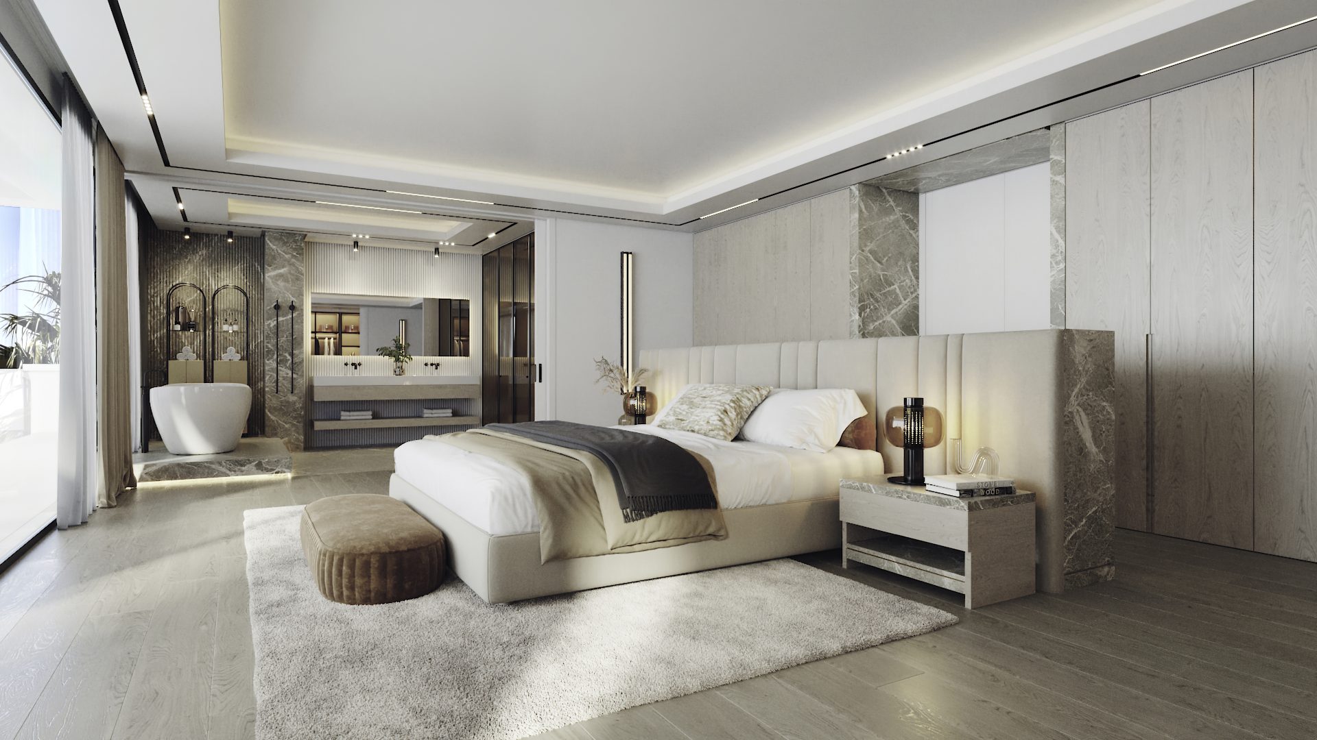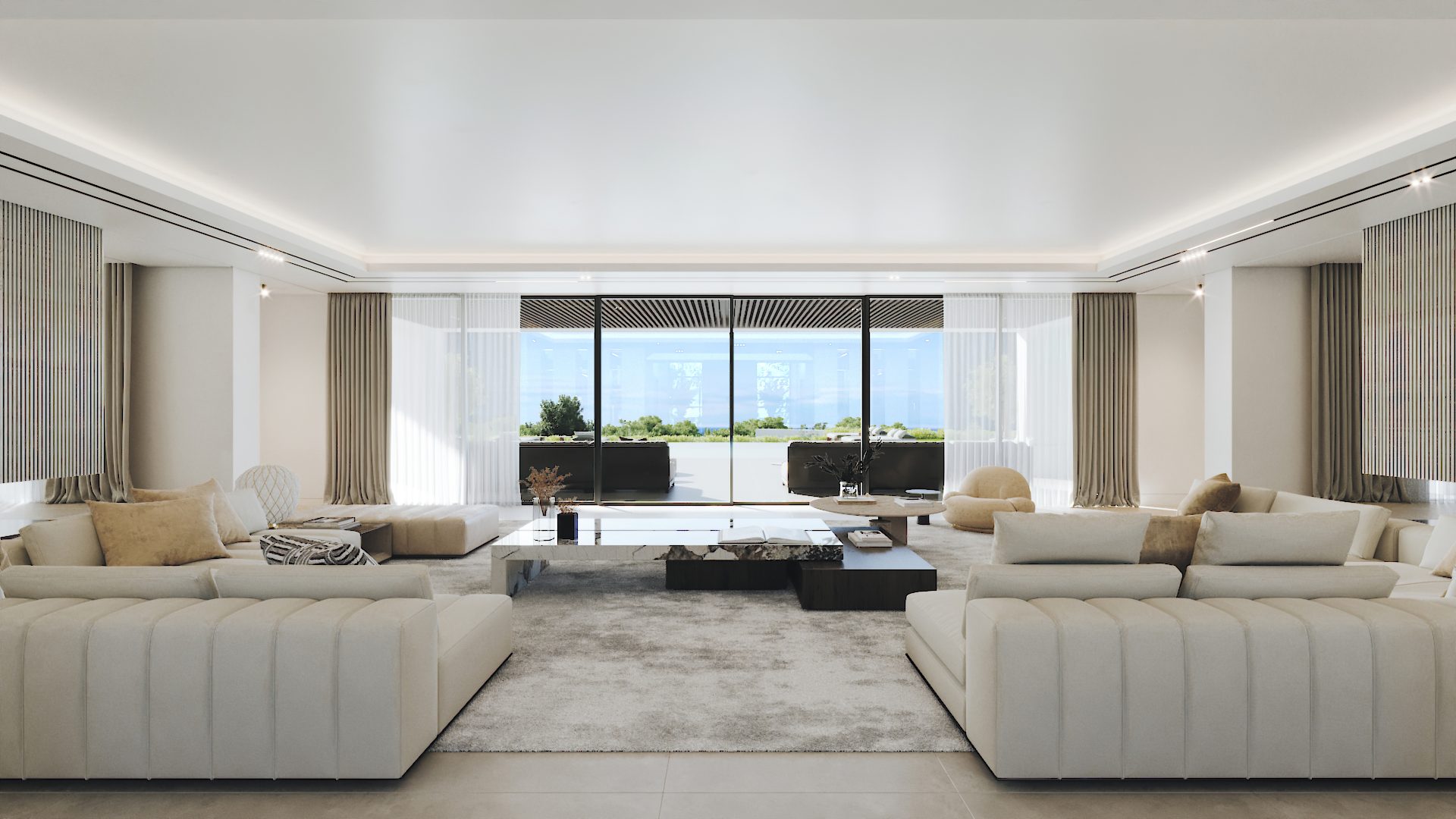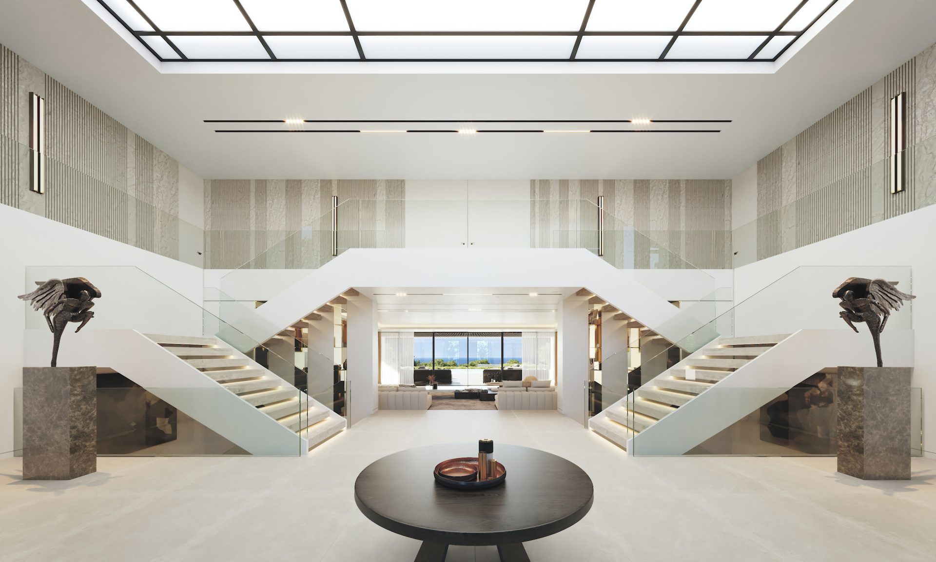 Boven geniet de indrukwekkende hoofdslaapkamer suite van een bevoorrechte positie met een privé open terras en panoramisch uitzicht. Vier extra slaapkamer suites, allemaal met privé terrassen, bieden royale accommodatie.