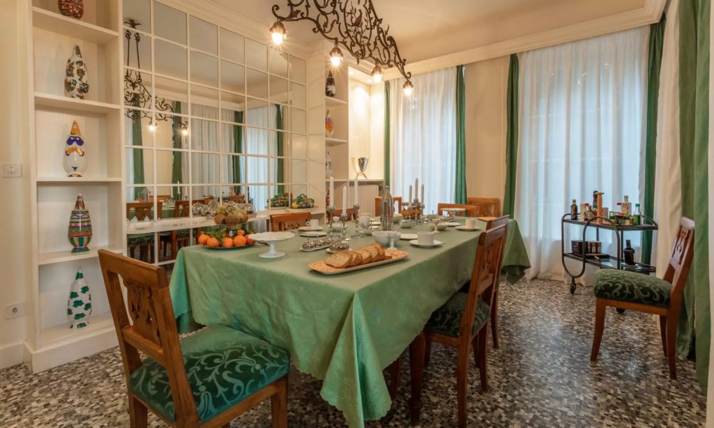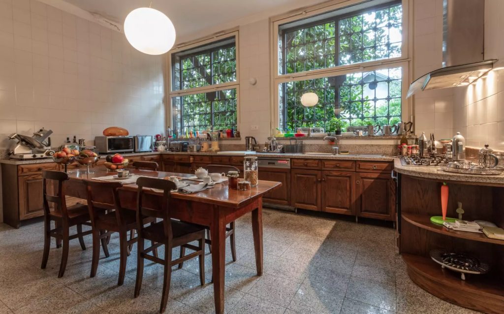 Op de onderste verdieping bevinden zich, zoals gebruikelijk in antieke herenhuizen, de keuken met etenslift, de eetkamer, de bijkeuken, de biljartkamer, een studeerkamer en de spa met sauna. Vanaf deze verdieping kom je uit op het eeuwenoude park, voorafgegaan door een veranda die wordt gebruikt als zomerse eethoek.