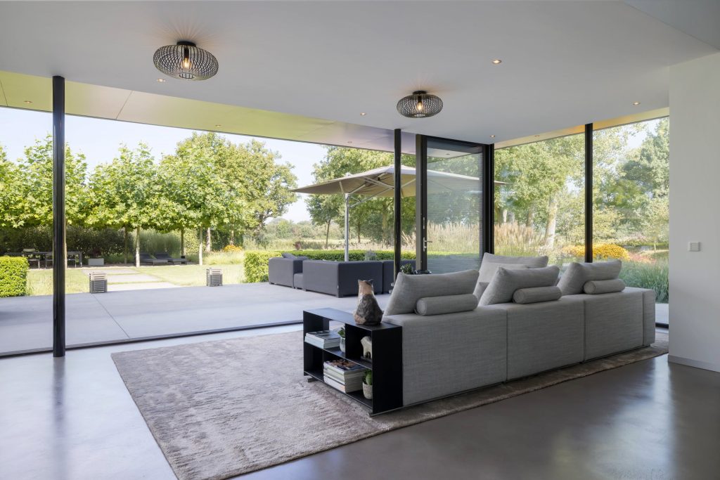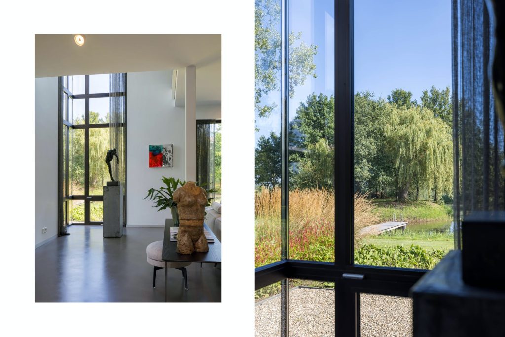 Aan de rechterzijde bevindt zich de woonkamer welke zodanig is gesitueerd dat u aan alle kanten een prachtig uitzicht heeft op uw tuin, het privé-meer en op uw enige buren, namelijk de reeën die hier dagelijks voorbij komen paraderen. Dichter bij de natuur is haast niet mogelijk!
