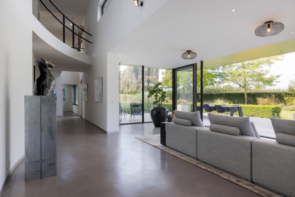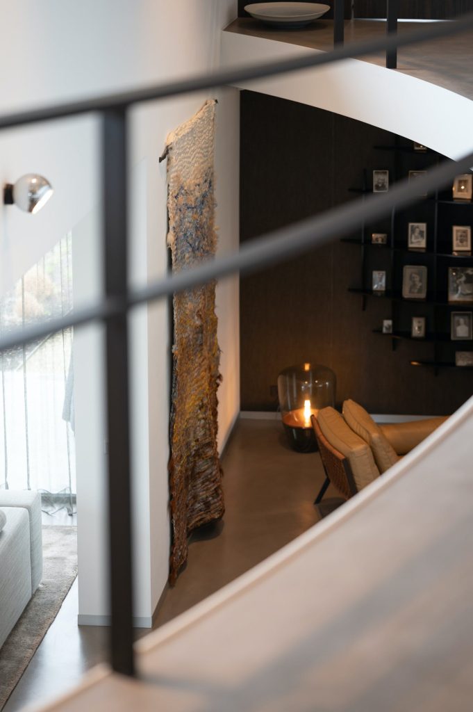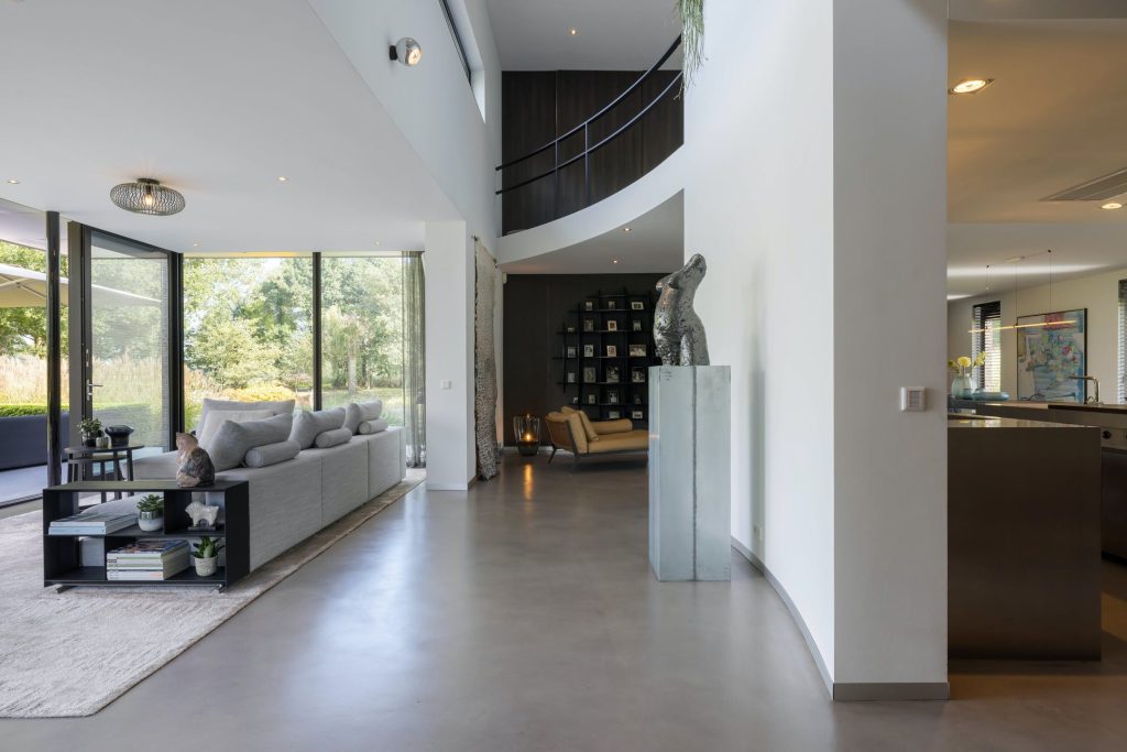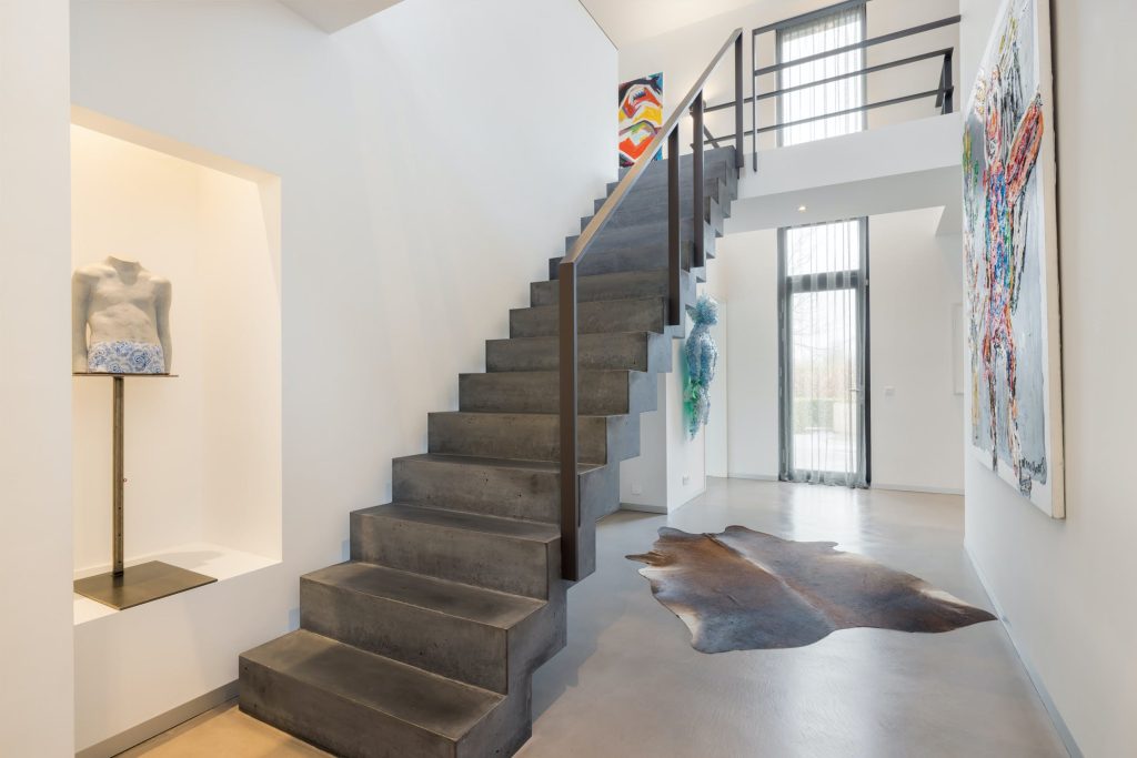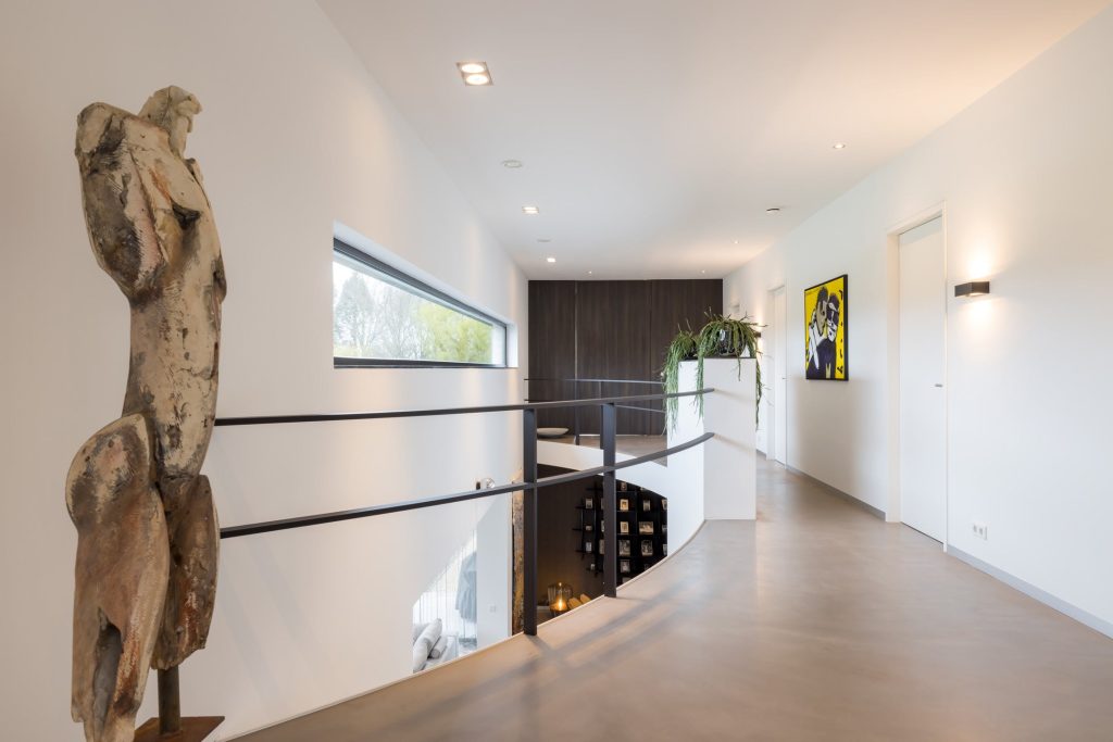 Middels de lift vanuit de bijkeuken of via de zeer strakke, uit beton opgebouwde, trap bereikt u de eerste verdieping. Een overloop van maar liefst 20 meter, een entresol en een 8 meter breed