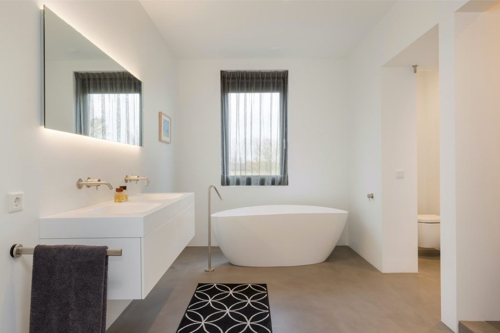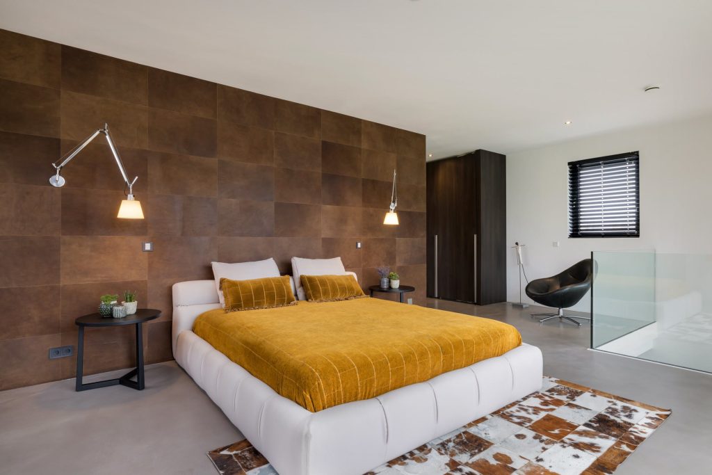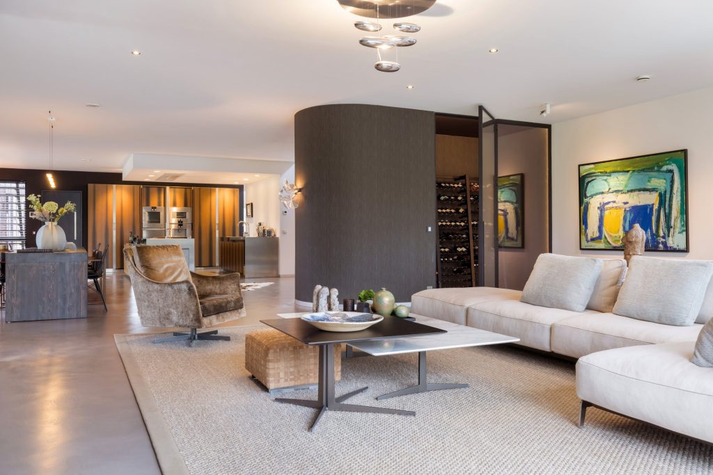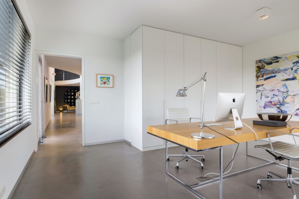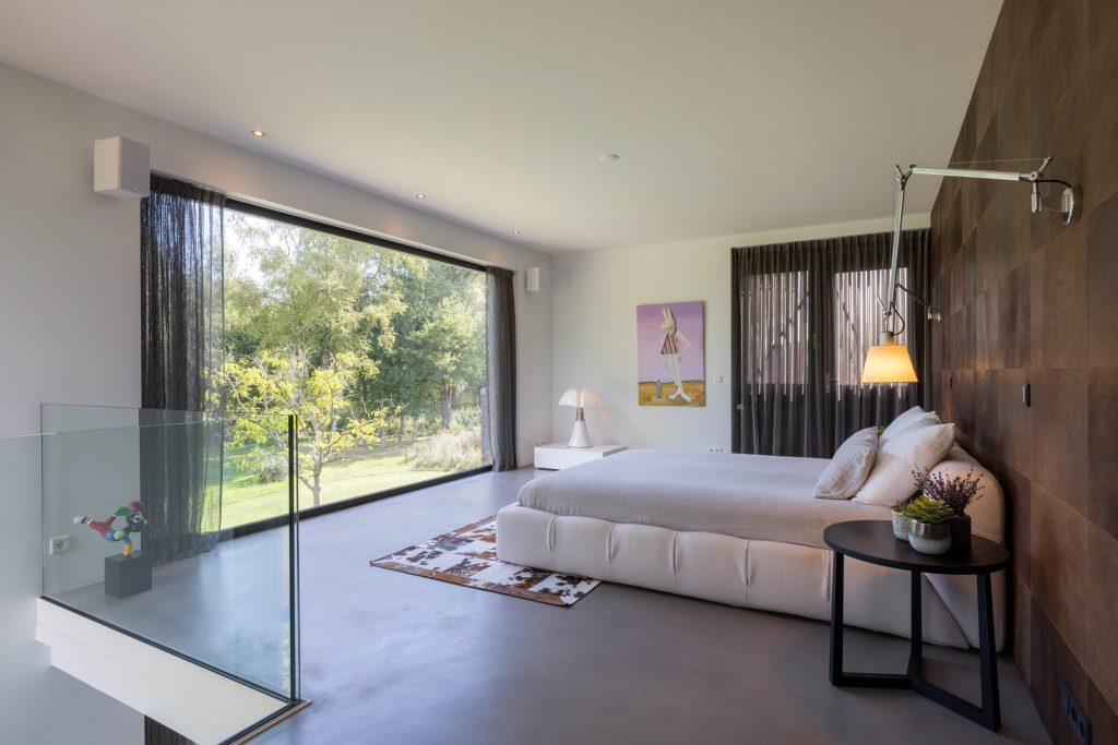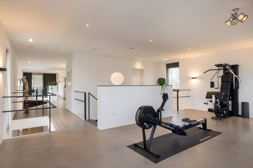 Middels de lift vanuit de bijkeuken of via de zeer strakke, uit beton opgebouwde, trap bereikt u de eerste verdieping. Een overloop van maar liefst 20 meter, een entresol en een 8 meter breed