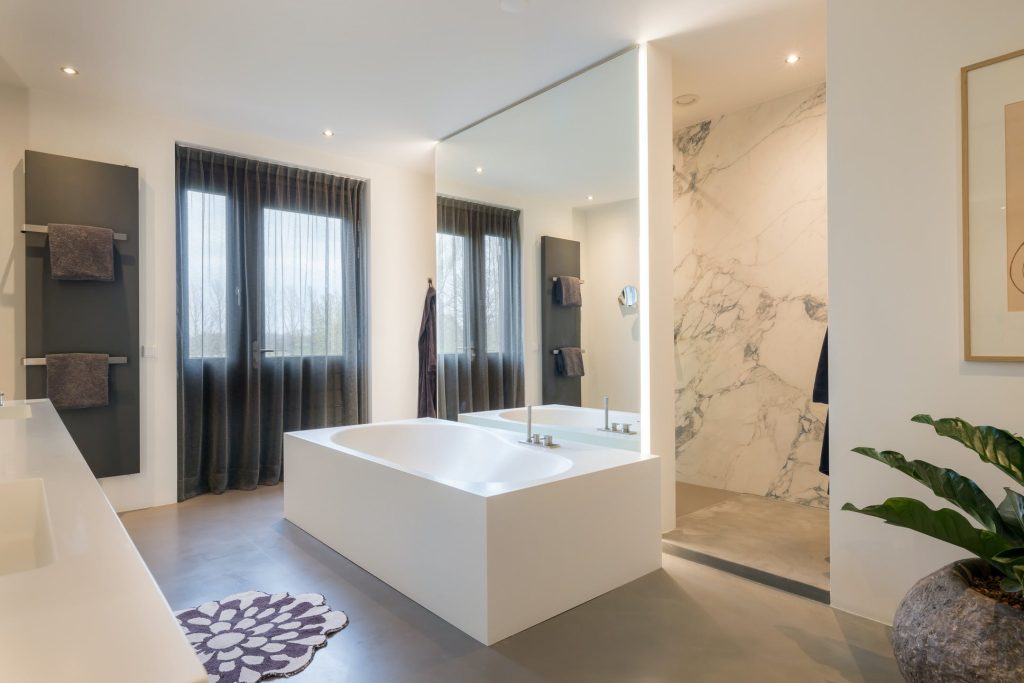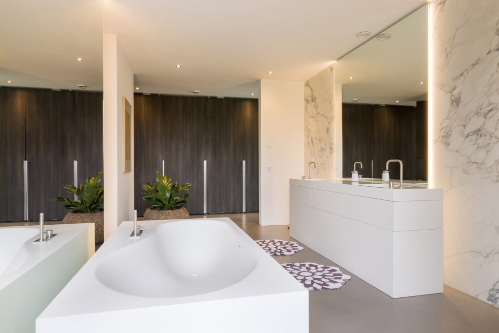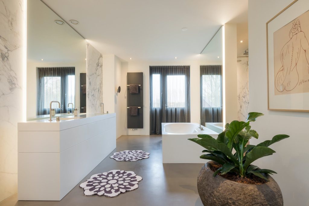panoramisch raam is het eerste wat u zal opvallen. Het luxueuze gevoel van beneden is hier volledig doorgetrokken. Op deze etage zijn 3 slaapkamers, 2 badkamers, fitnessruimte en een linnenkamer gevestigd. De masterbedroom heeft een eigen kast-/kleedruimte en luxueuze badkamer tot zijn beschikking. De badkamer behorend bij de masterbedroom is voorzien van een dubbele wastafel met designmeubel, een ruim vrijstaand bad en uiteraard een dubbele douche. Alle kamers op deze etage hebben directe toegang tot een groot balkon met wederom een prachtig uitzicht over de buitenplaats. Wenst u meer slaapkamers of wellicht een separaat appartement (voor bijvoorbeeld een au-pair) dan is dit op deze verdieping uitstekend te realiseren.