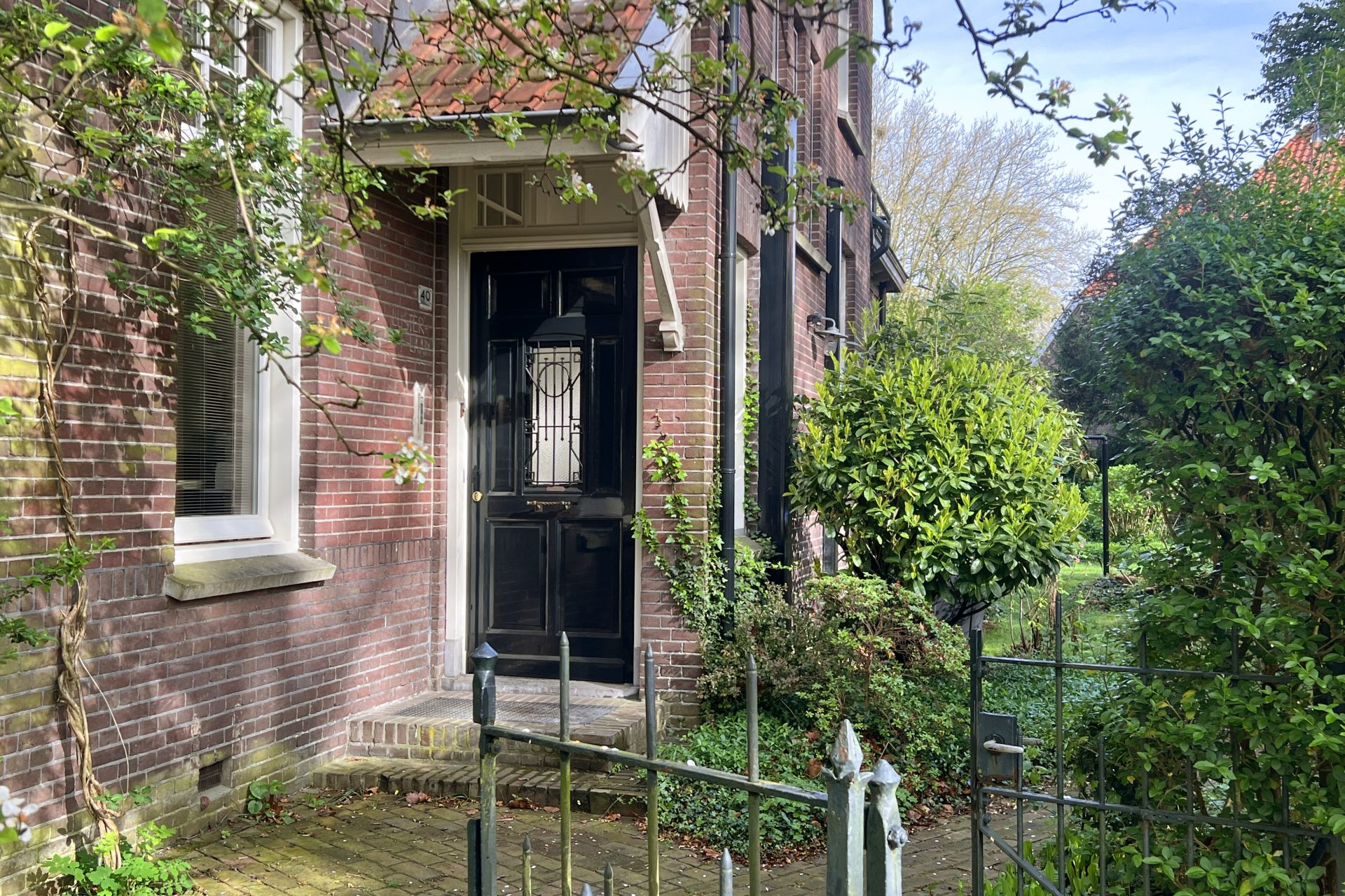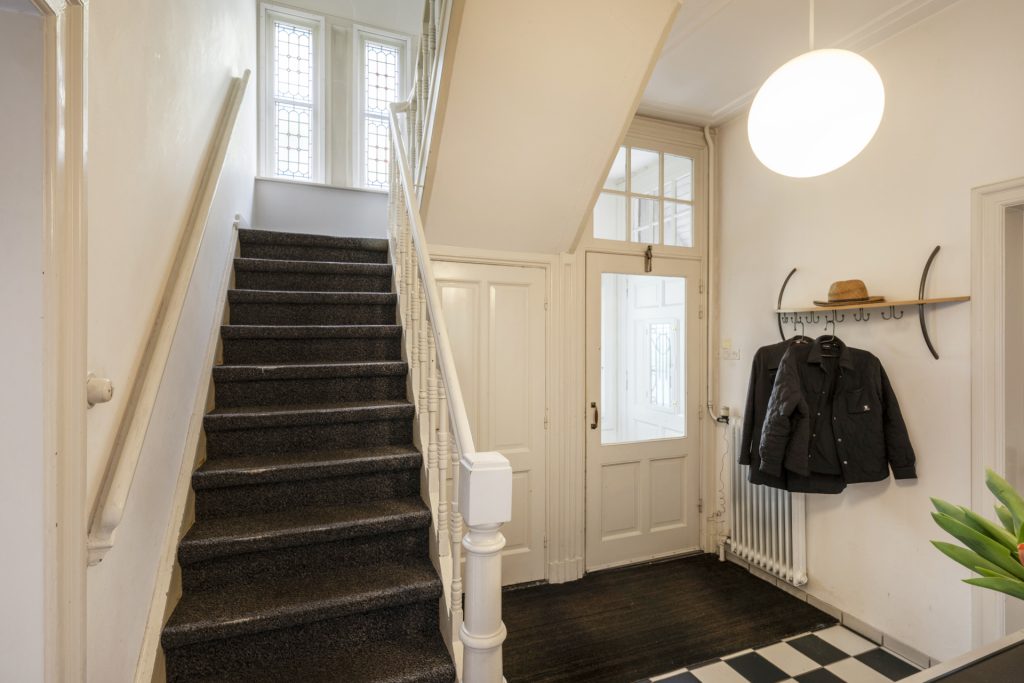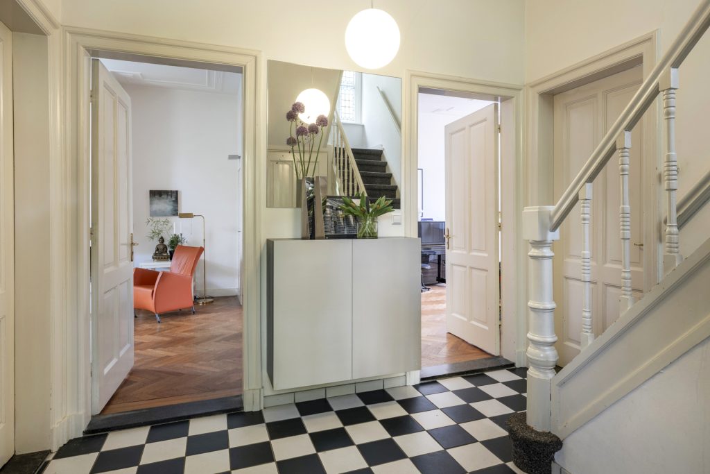 Het smeedijzeren poortje vormt de entree naar de overdekte voordeur. Je komt binnen in het tochtportaal waarna je in de ruime hal komt. De hal is uitgevoerd een zwart wit geblokte tegelvloer en vanuit de hal is er toegang tot het gastentoilet, de werkkamer, woonkamer en keuken.