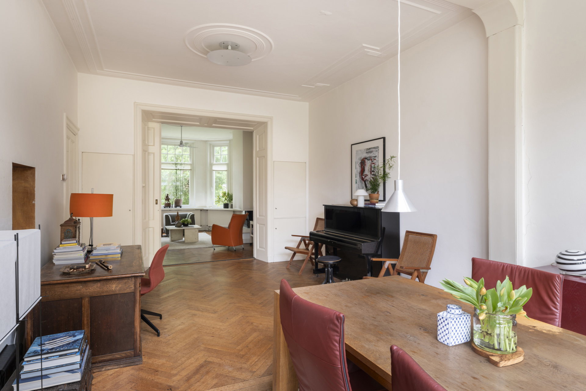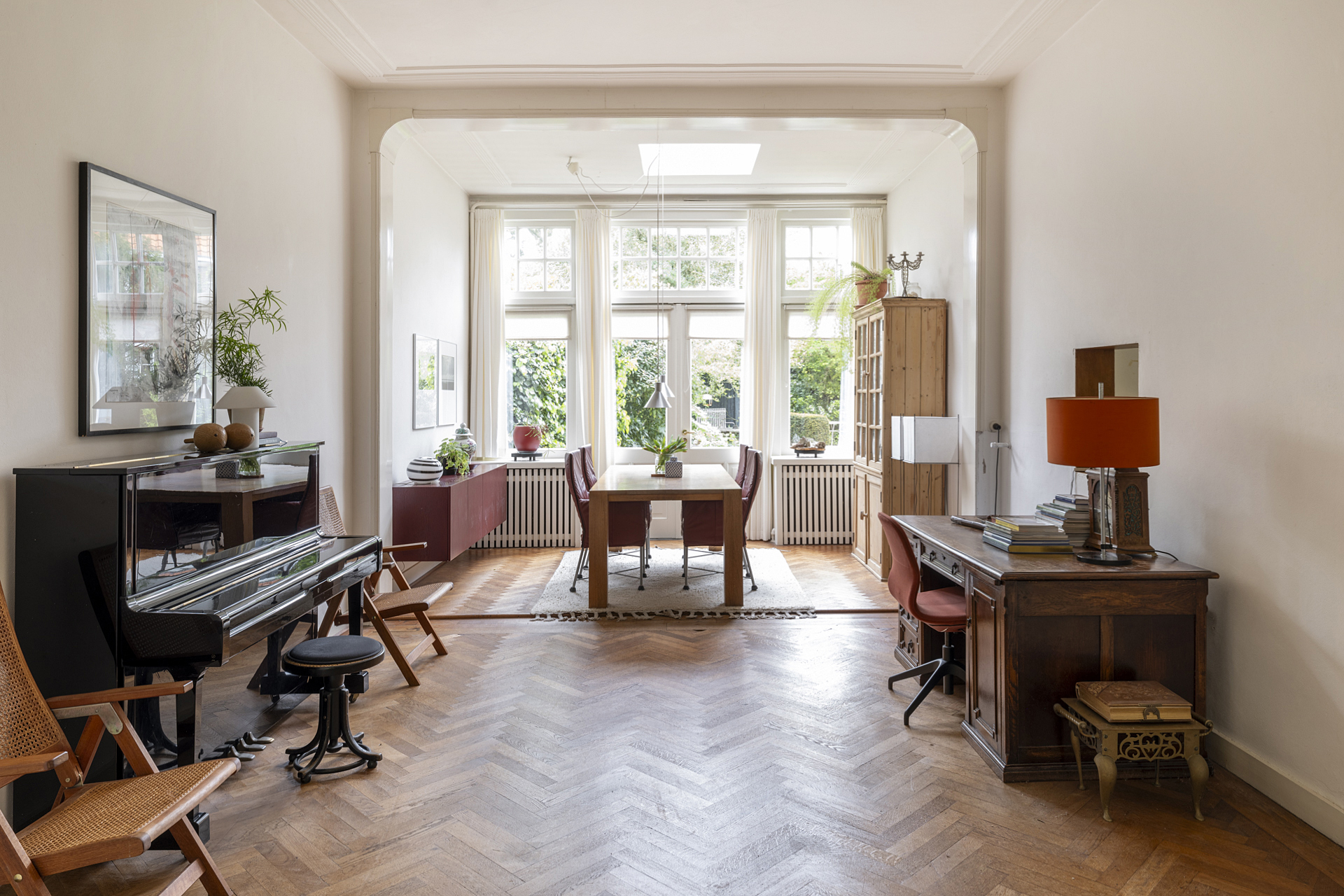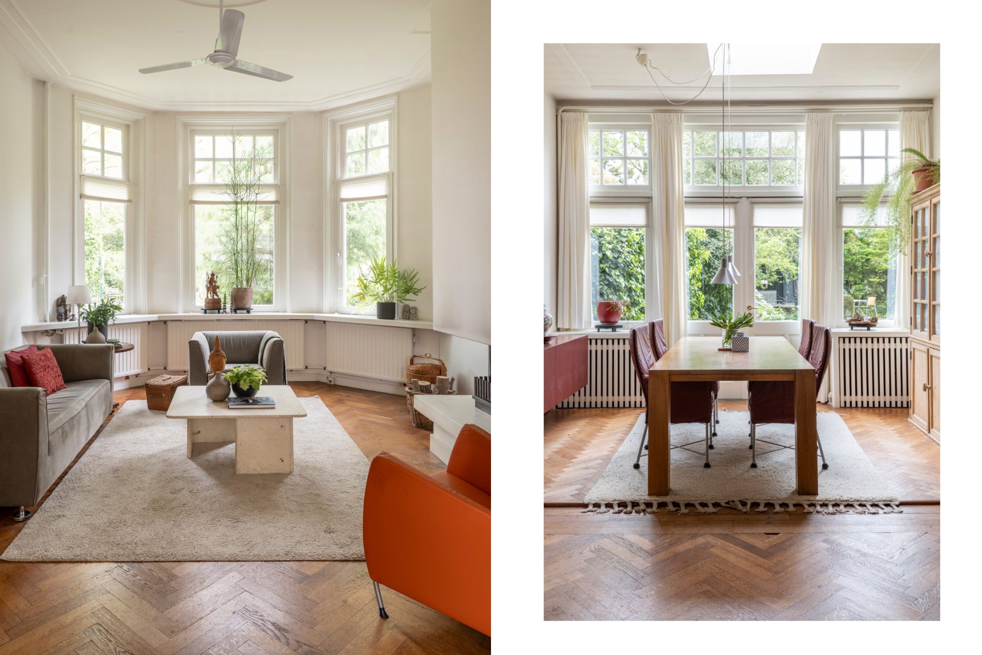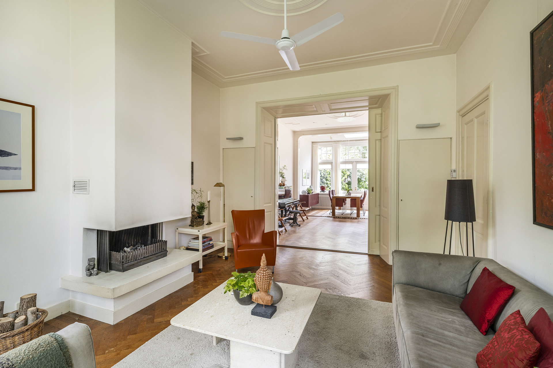 Wanneer je de woonkamer binnen stapt, wordt je direct verrast door de authentieke visgraat parketvloer en het ruimtelijk effect wat de hoogte van het plafond geeft. De ruimte is verdeeld in een zithoek aan de voorzijde met prachtige hoge raampartijen en open haard. Middels en-suite deuren is het zitgedeelte gescheiden van de eetkamer aan de achterzijde met openslaande deuren naar de tuin. Het verwijderen van de tussenmuur tussen deze eetkamer en de keuken, maakt het mogelijk om, indien gewenst, een riante leef-/woonkeuken te creëeren.