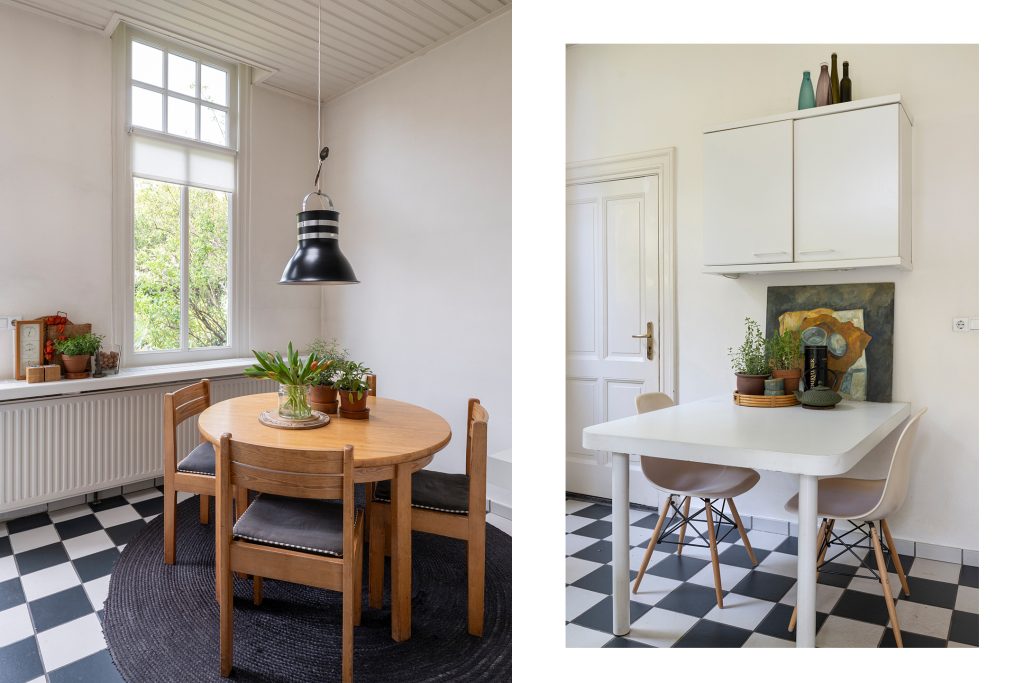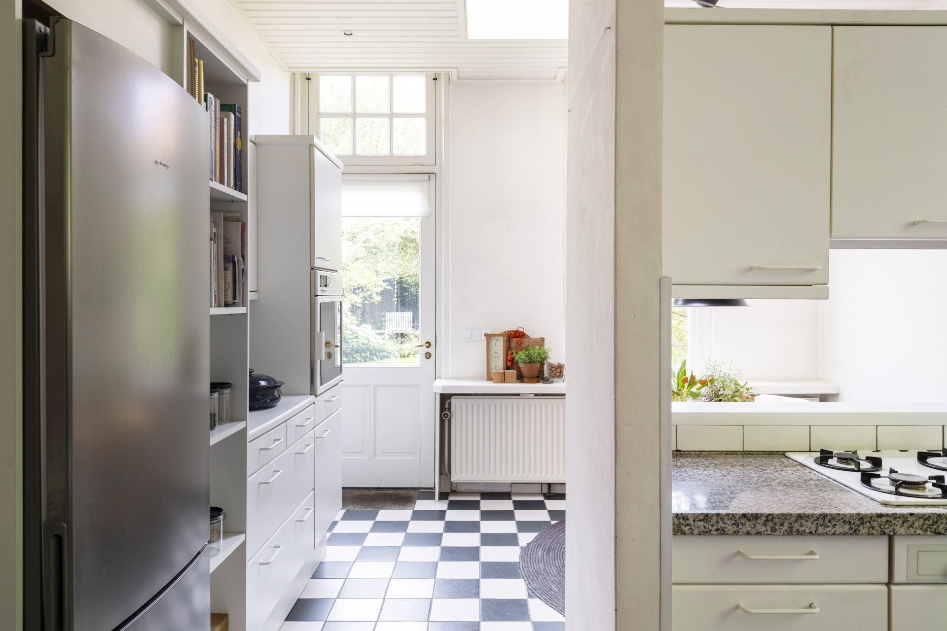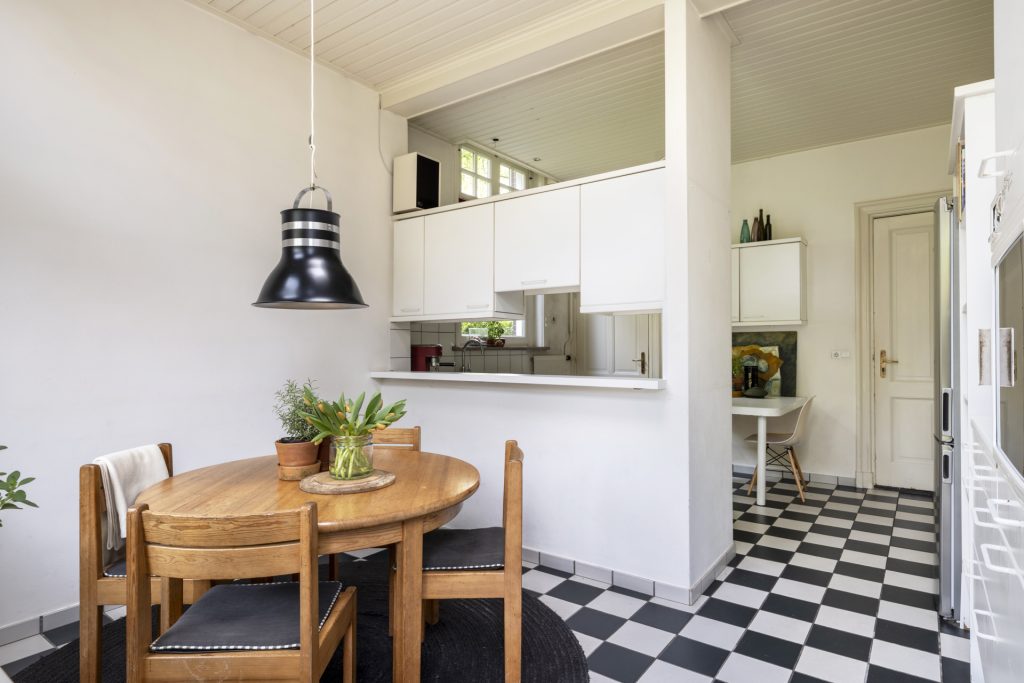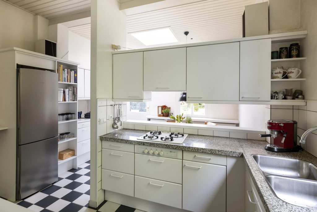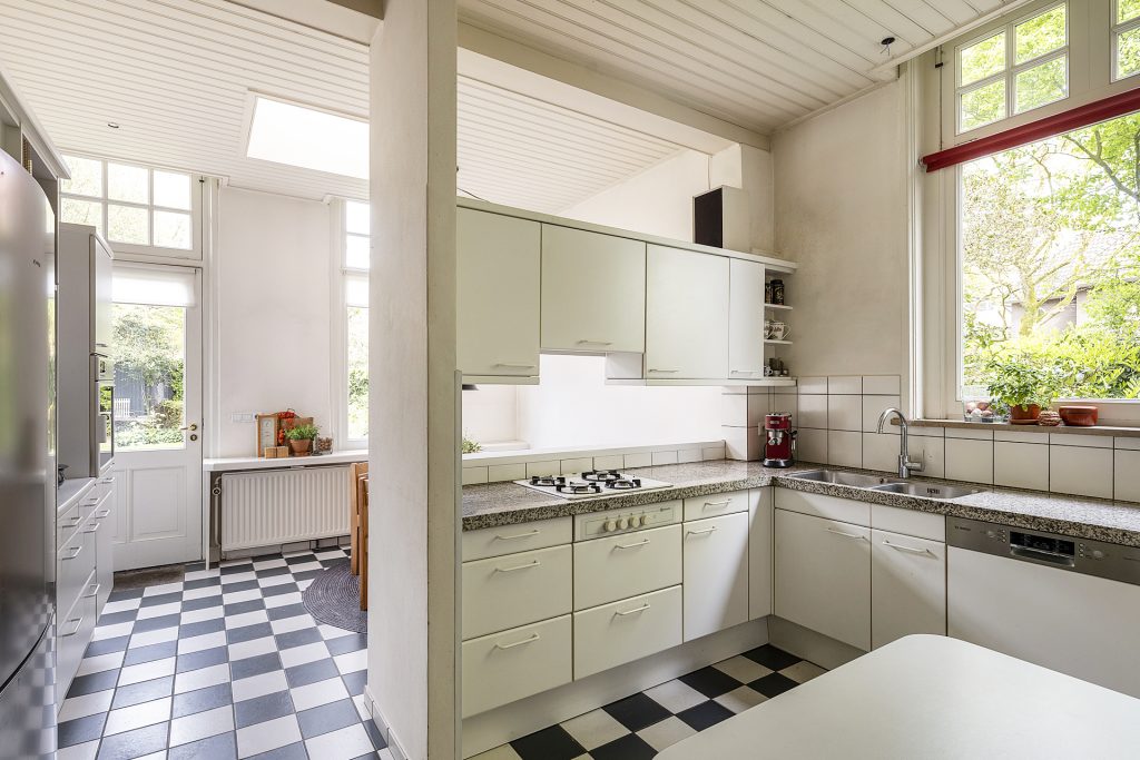 De ruime keuken heeft een mooie lichtinval door de hoge ramen en is voorzien van een eenvoudige keukenopstelling en biedt daarnaast ruimte aan een (ronde) ontbijttafel. Vanuit de keuken is er toegang tot de provisie (-/wijn)kelder en er is een deur naar de tuin.