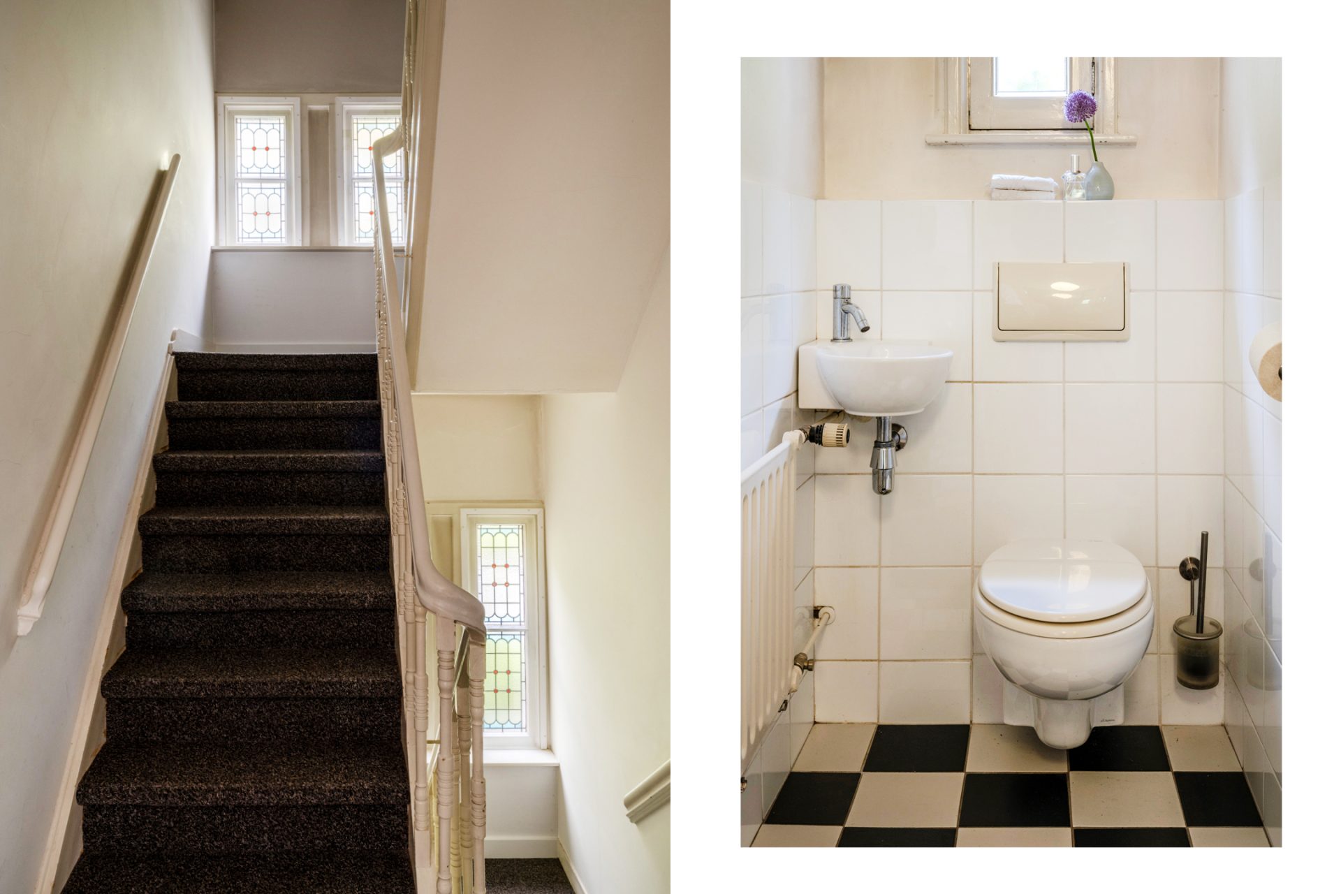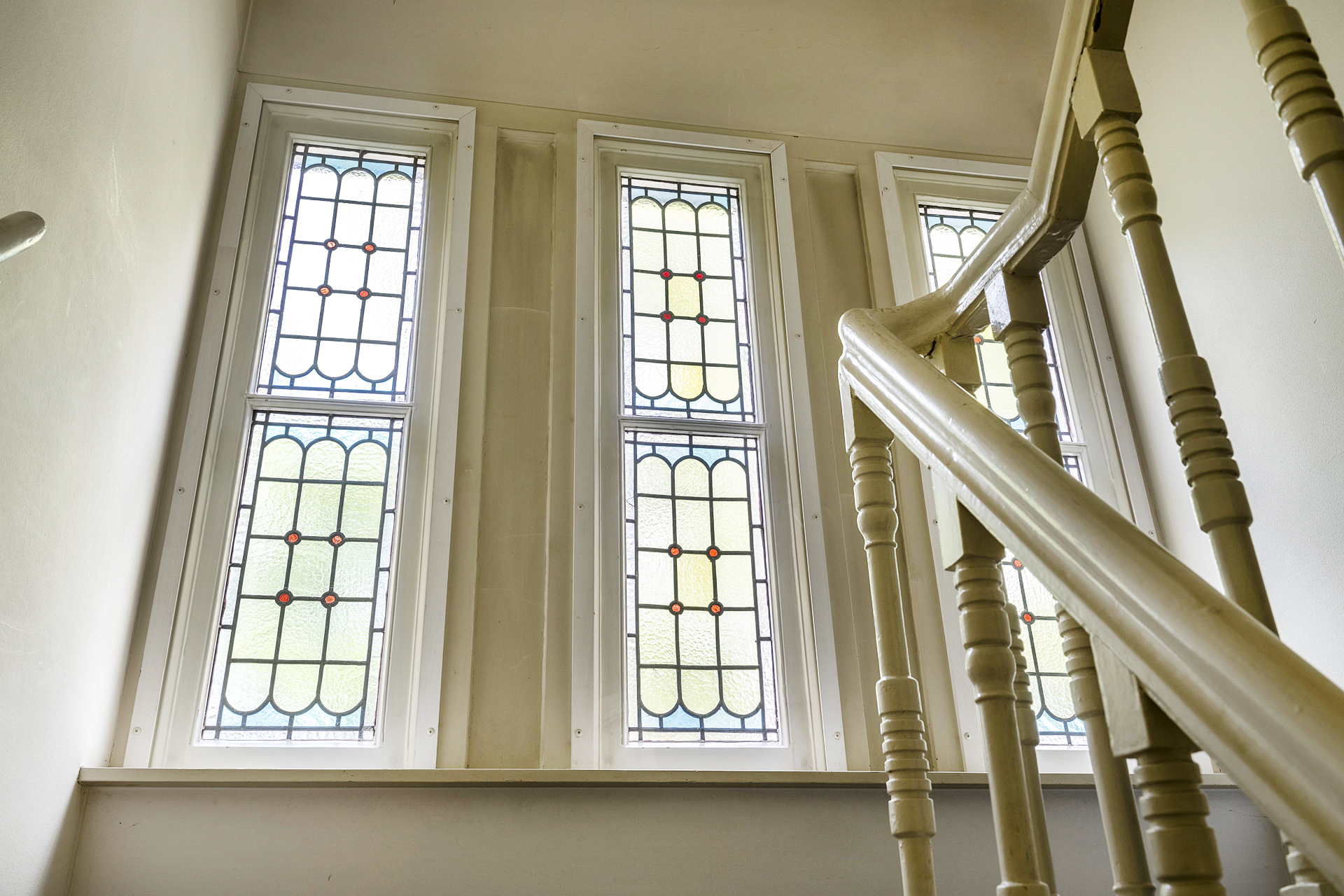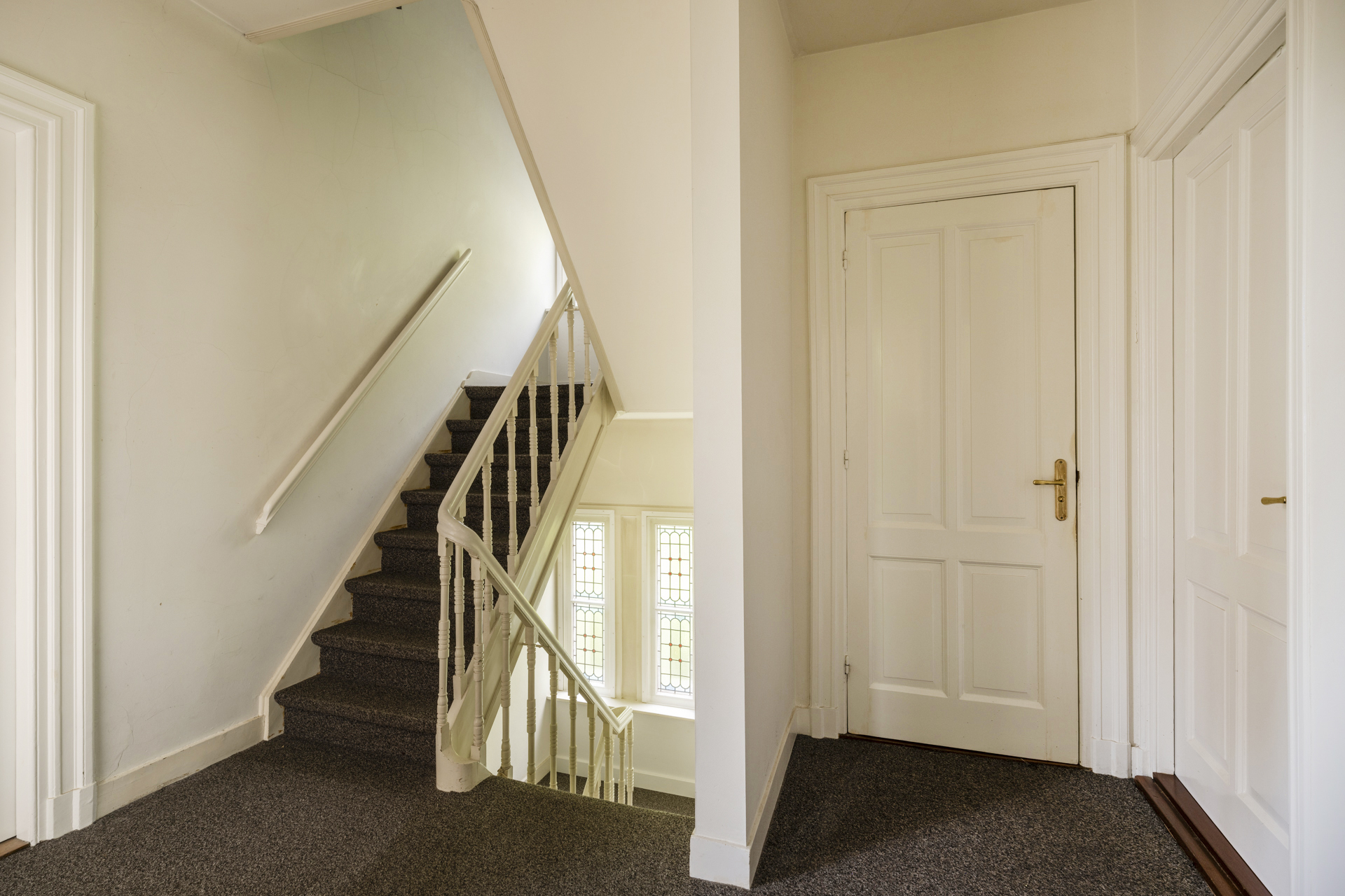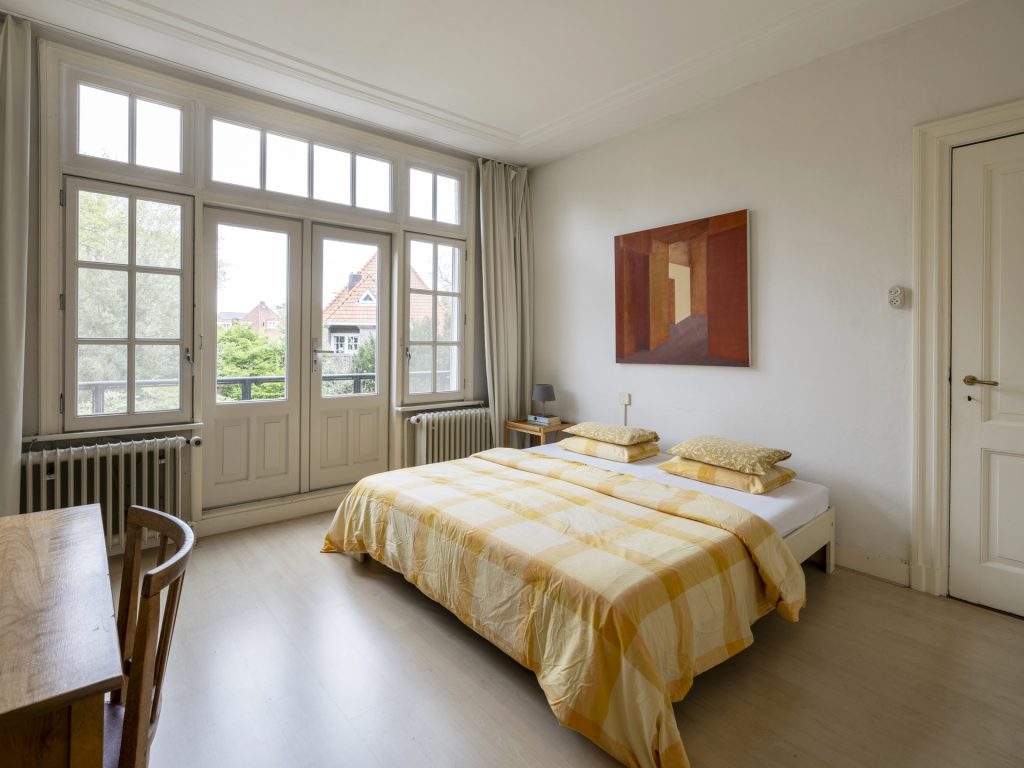 De bordestrap met sfeervolle glas-in-loodraampartij is de opgang naar de overloop op de eerste verdieping. De overloop biedt toegang tot 3 ruime slaapkamers met inbouwkasten, de ruime badkamer en tweede toiletruimte. De masterbedroom aan de voorzijde heeft openslaande deuren naar het Frans balkon en de tweede slaapkamer heeft openslaande deuren naar het dakterras aan de achterzijde.