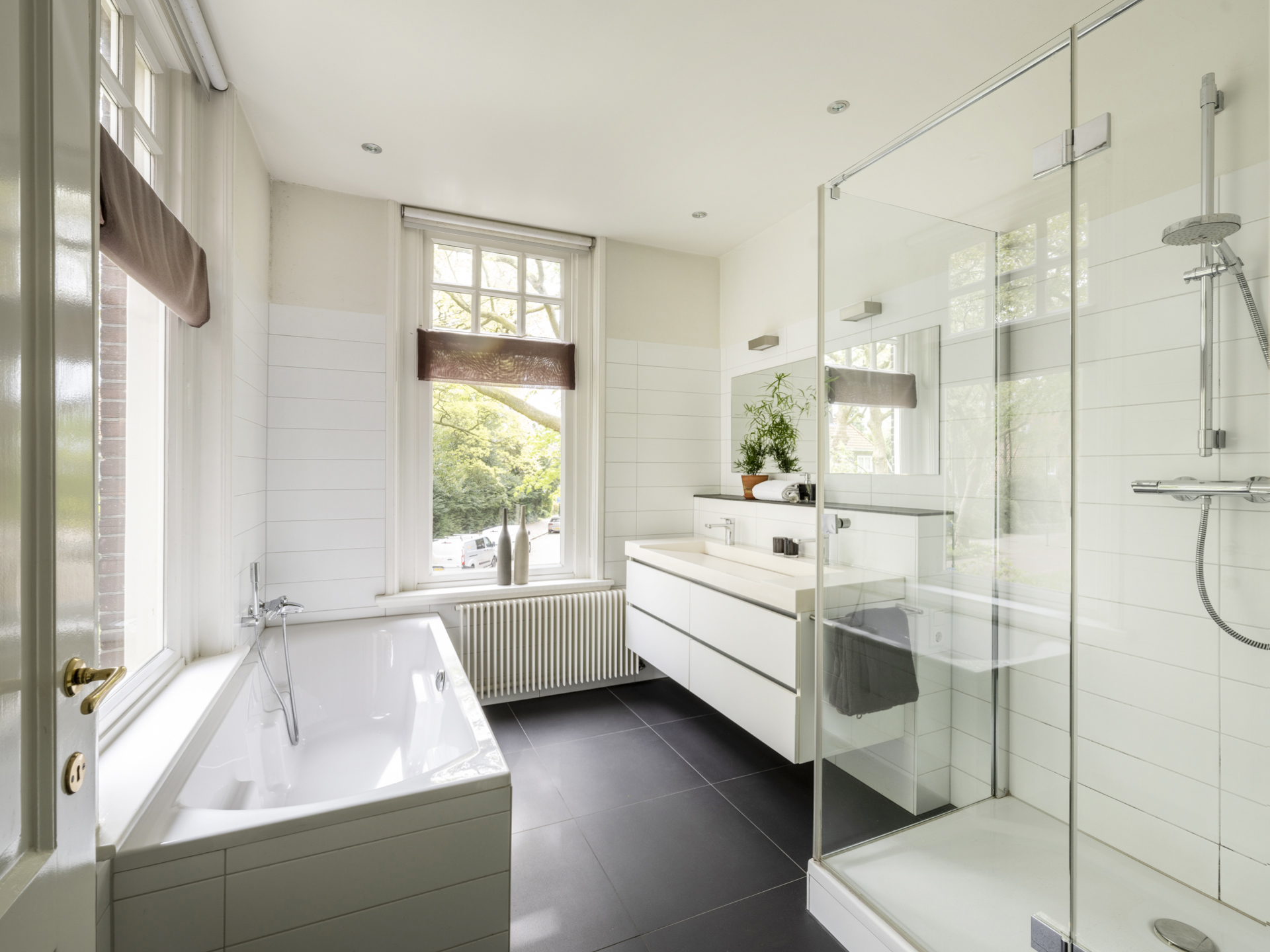 De badkamer is volledig betegeld en biedt ruimte aan een dubbele wastafel, douche en ligbad.