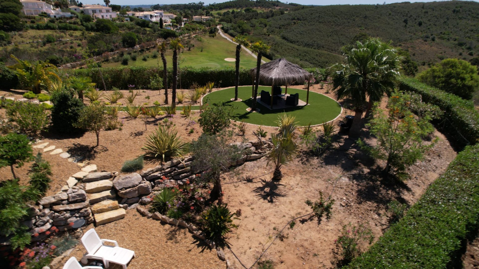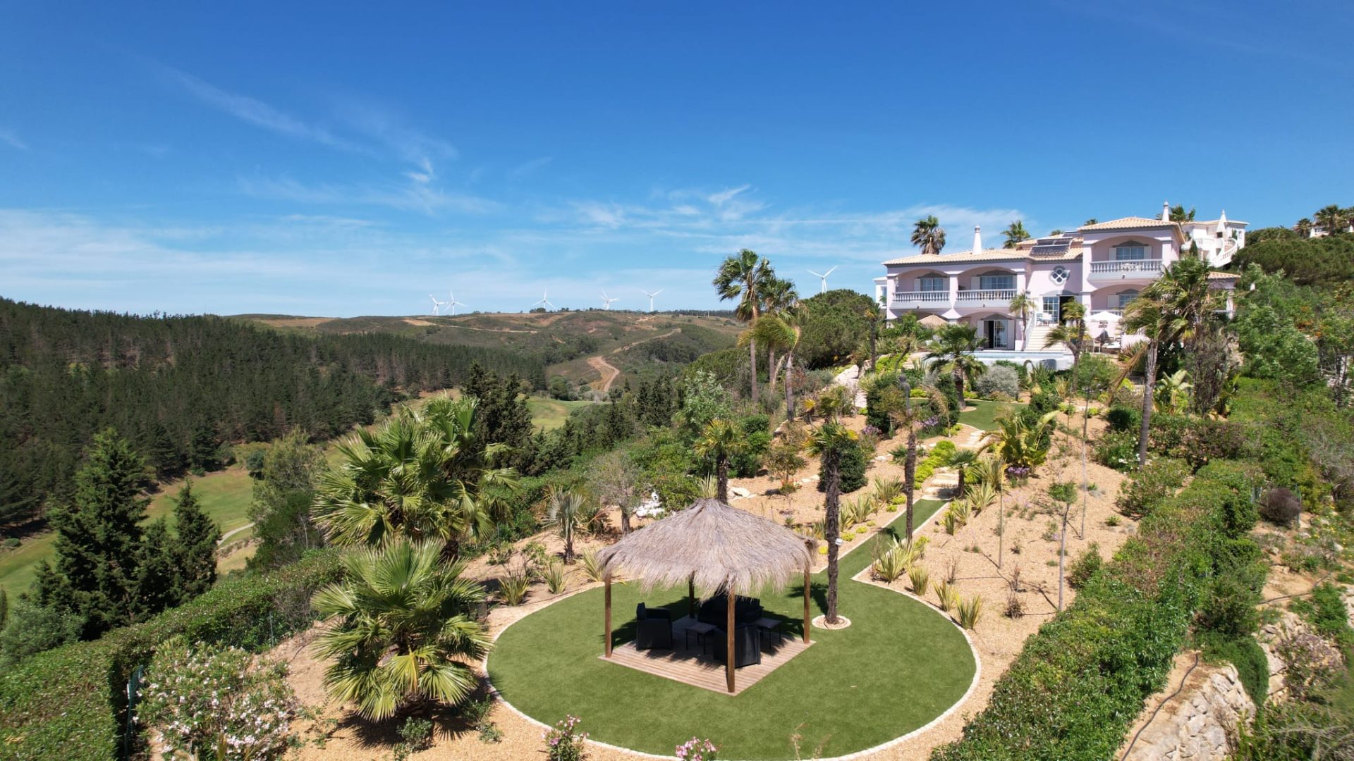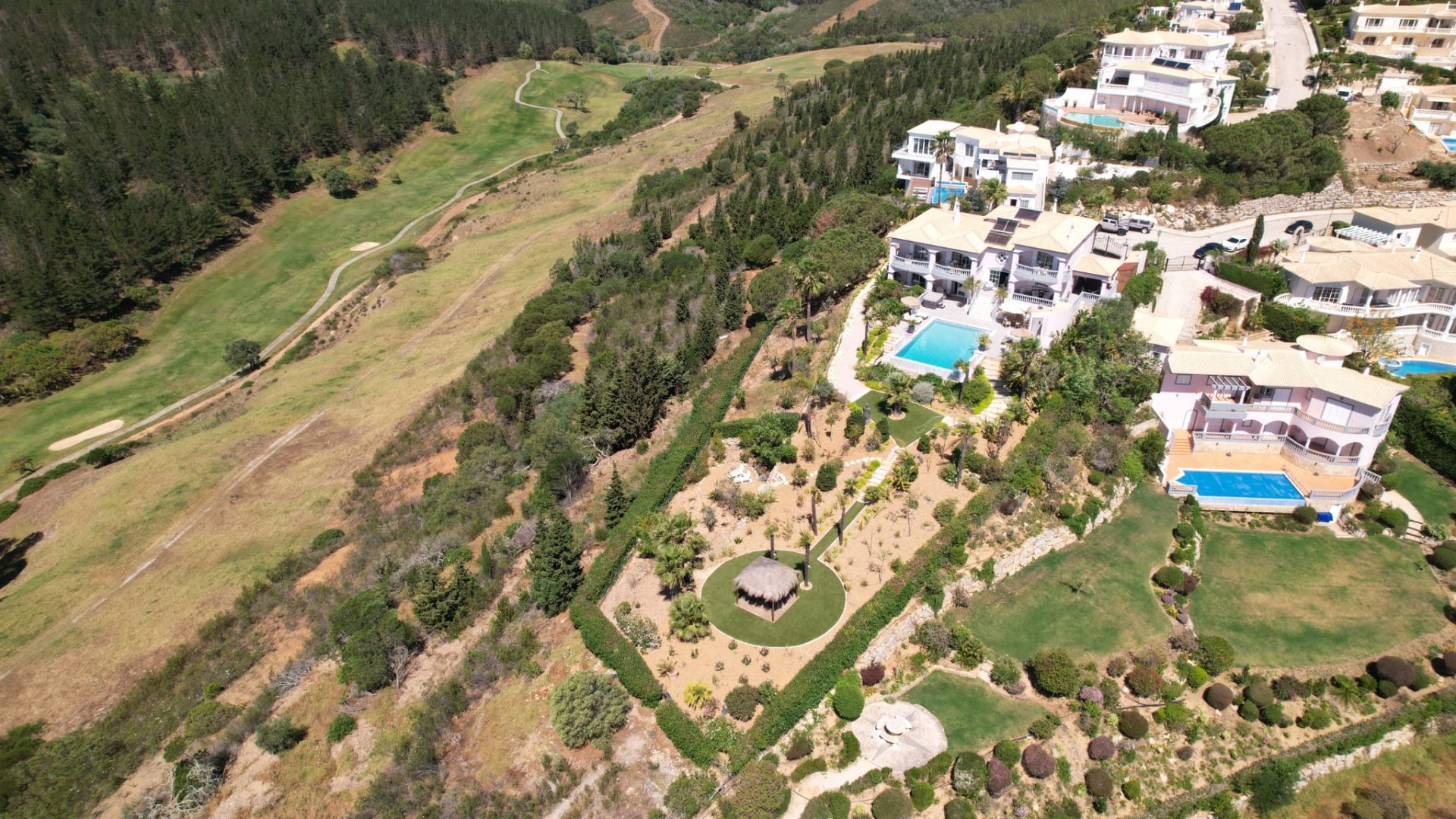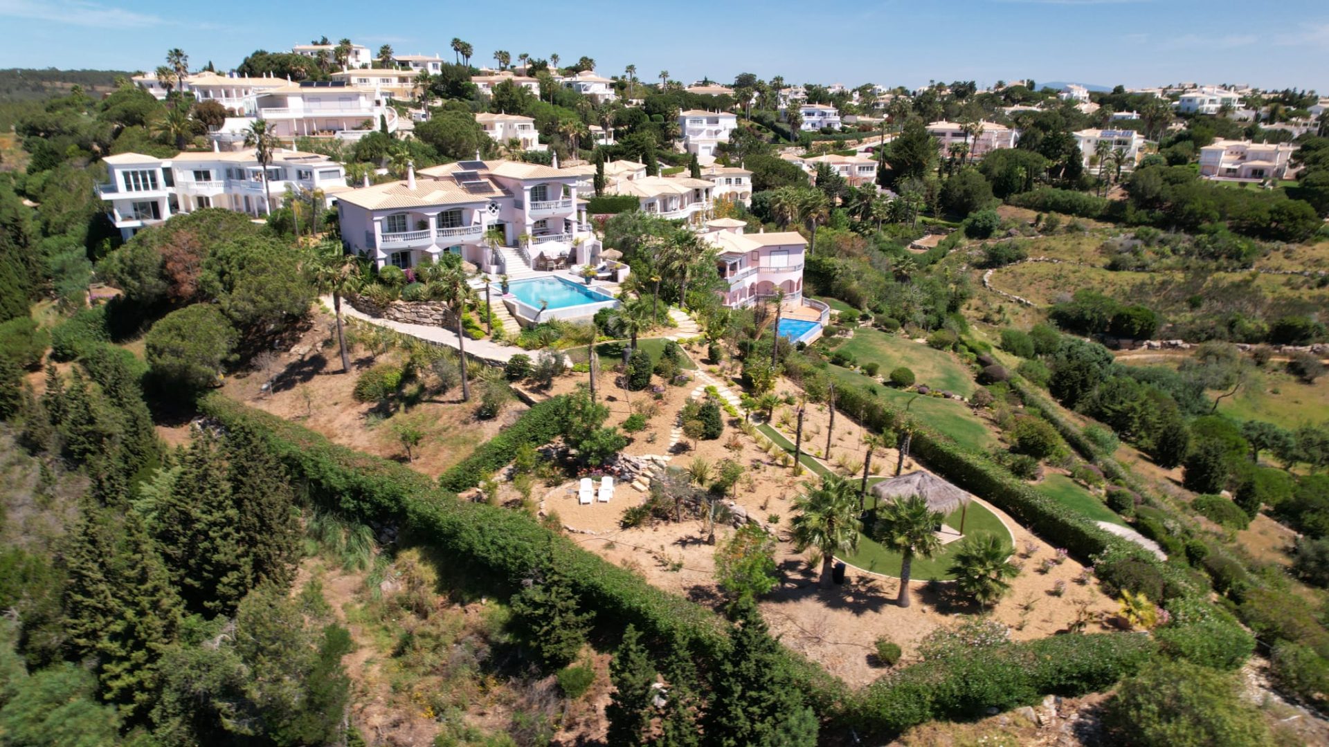 Deze villa is zorgvuldig ontworpen, met prachtige en zeer smaakvolle details die overal in de woning zichtbaar zijn. Opgevat in een open plan, vloeit de ruimte over van een centraal kookeiland naar de loungeruimte met een dubbel houtvuur.  Alle ruimtes en slaapkamers op de eerste verdieping hebben een adembenemend panoramisch uitzicht en zijn zeer privé met elk een eigen en-suite badkamer. Op het lagere niveau bevindt zich het gastengedeelte met 2 extra en-suite slaapkamers met directe toegang tot het zwembadgedeelte. Op het zwembadterras is het mogelijk om 270º te genieten van een prachtig uitzicht op de golfbaan, het landschap en de oceaan. Hier is er een buiten BBQ keuken, zeer goed uitgerust, een jacuzzi, een vuurplaats voor koele avonden, en een buitendouche. Luxueuze en uitgestrekte exotische mediterrane tuinen omringen het pand en bieden optionele meeslepende ruimtes om uit te rusten in volledige privacy.