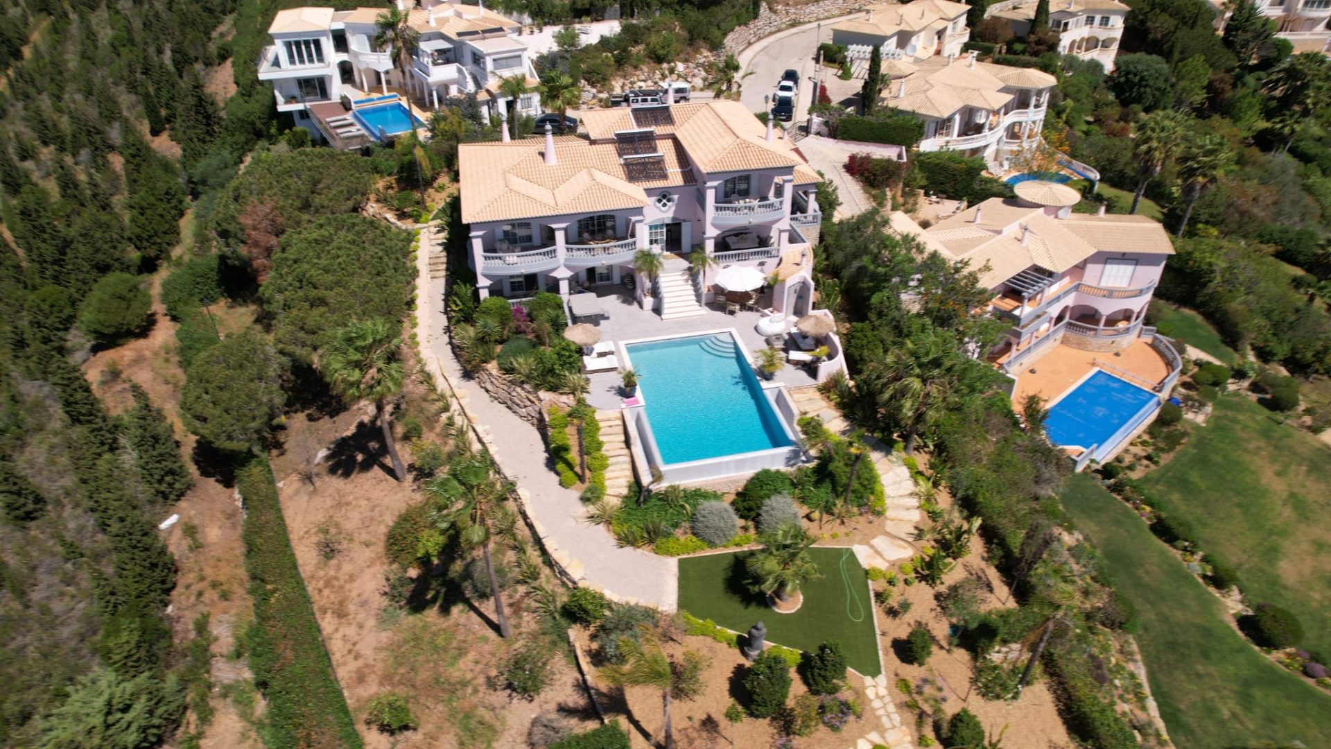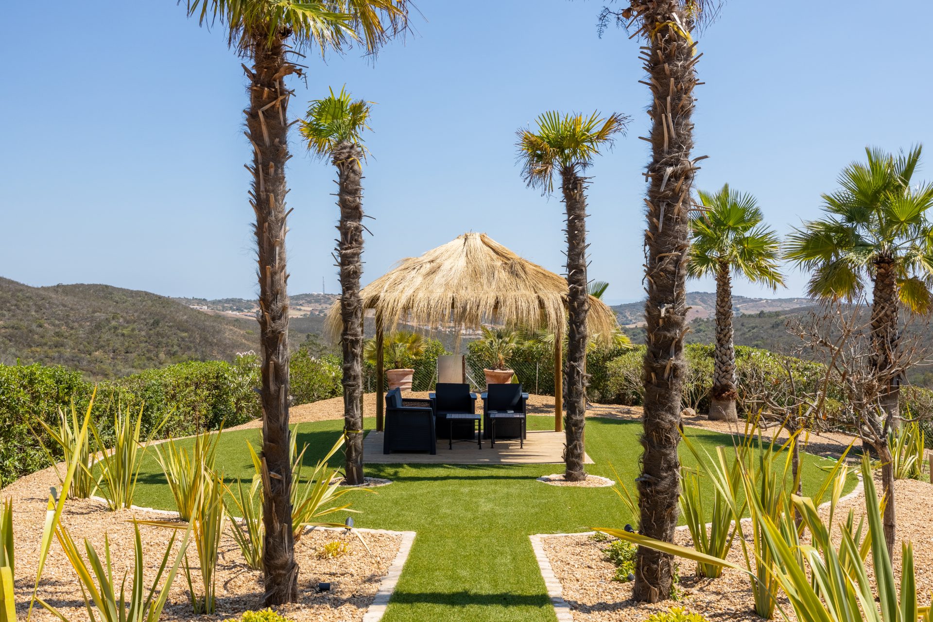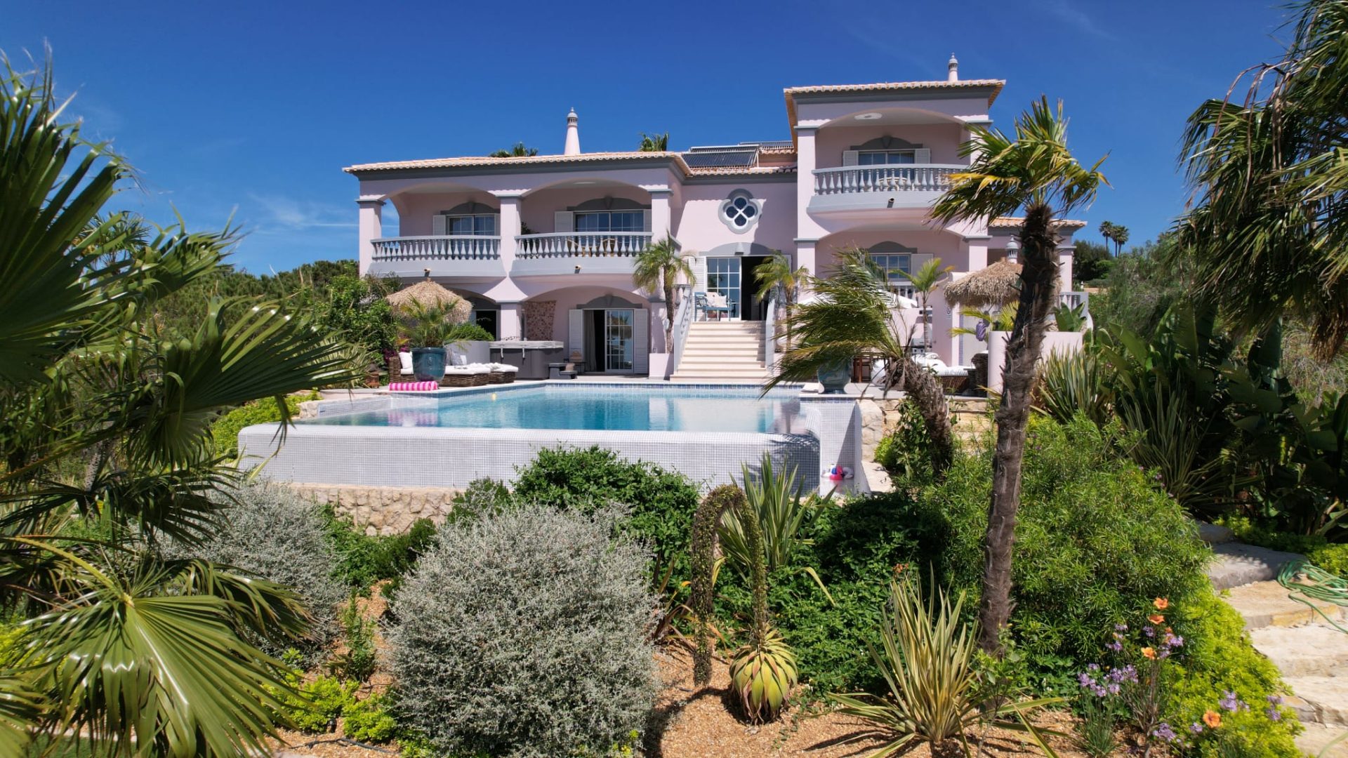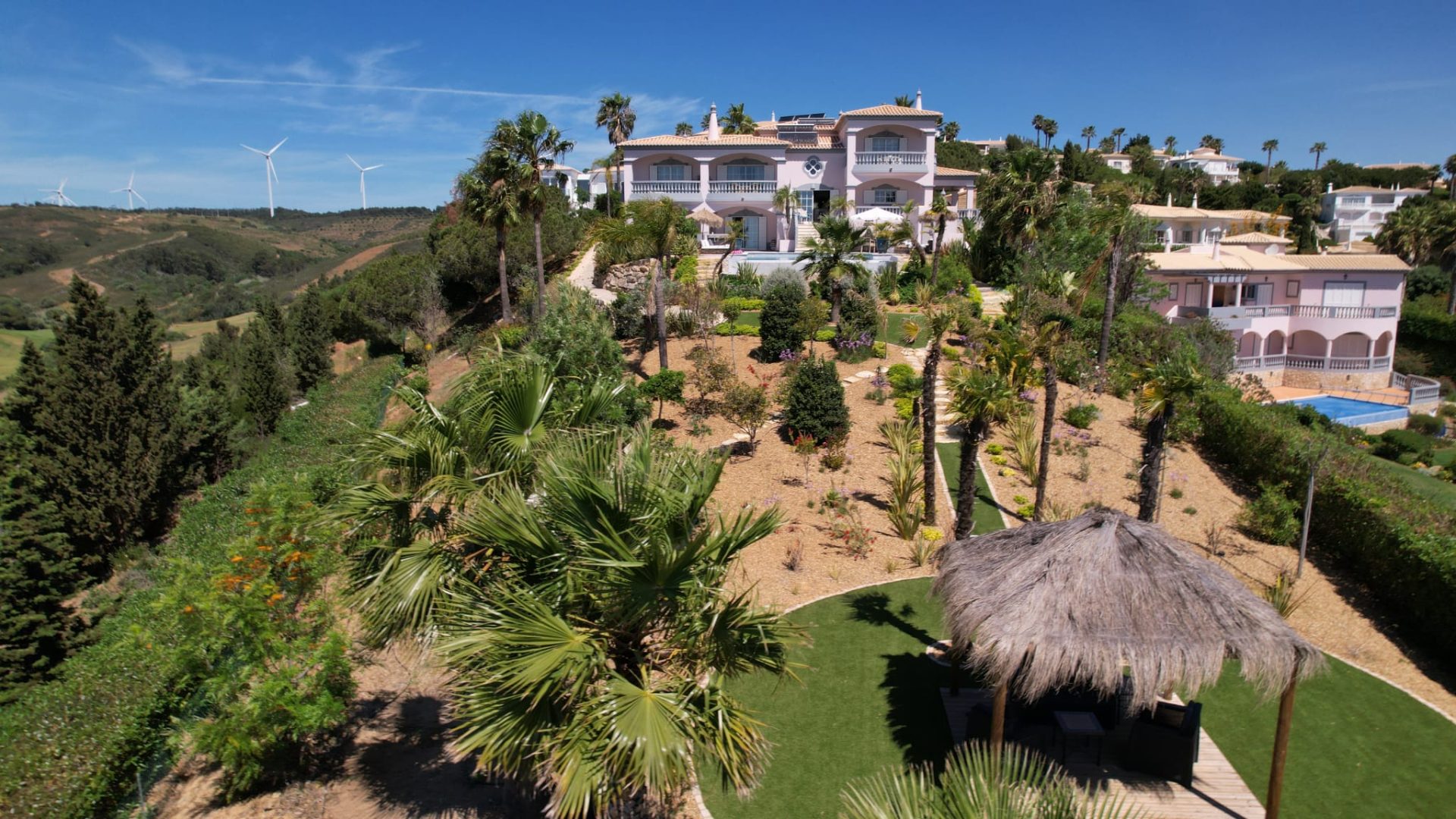 Deze villa is zorgvuldig ontworpen, met prachtige en zeer smaakvolle details die overal in de woning zichtbaar zijn. Opgevat in een open plan, vloeit de ruimte over van een centraal kookeiland naar de loungeruimte met een dubbel houtvuur.  Alle ruimtes en slaapkamers op de eerste verdieping hebben een adembenemend panoramisch uitzicht en zijn zeer privé met elk een eigen en-suite badkamer. Op het lagere niveau bevindt zich het gastengedeelte met 2 extra en-suite slaapkamers met directe toegang tot het zwembadgedeelte. Op het zwembadterras is het mogelijk om 270º te genieten van een prachtig uitzicht op de golfbaan, het landschap en de oceaan. Hier is er een buiten BBQ keuken, zeer goed uitgerust, een jacuzzi, een vuurplaats voor koele avonden, en een buitendouche. Luxueuze en uitgestrekte exotische mediterrane tuinen omringen het pand en bieden optionele meeslepende ruimtes om uit te rusten in volledige privacy.
