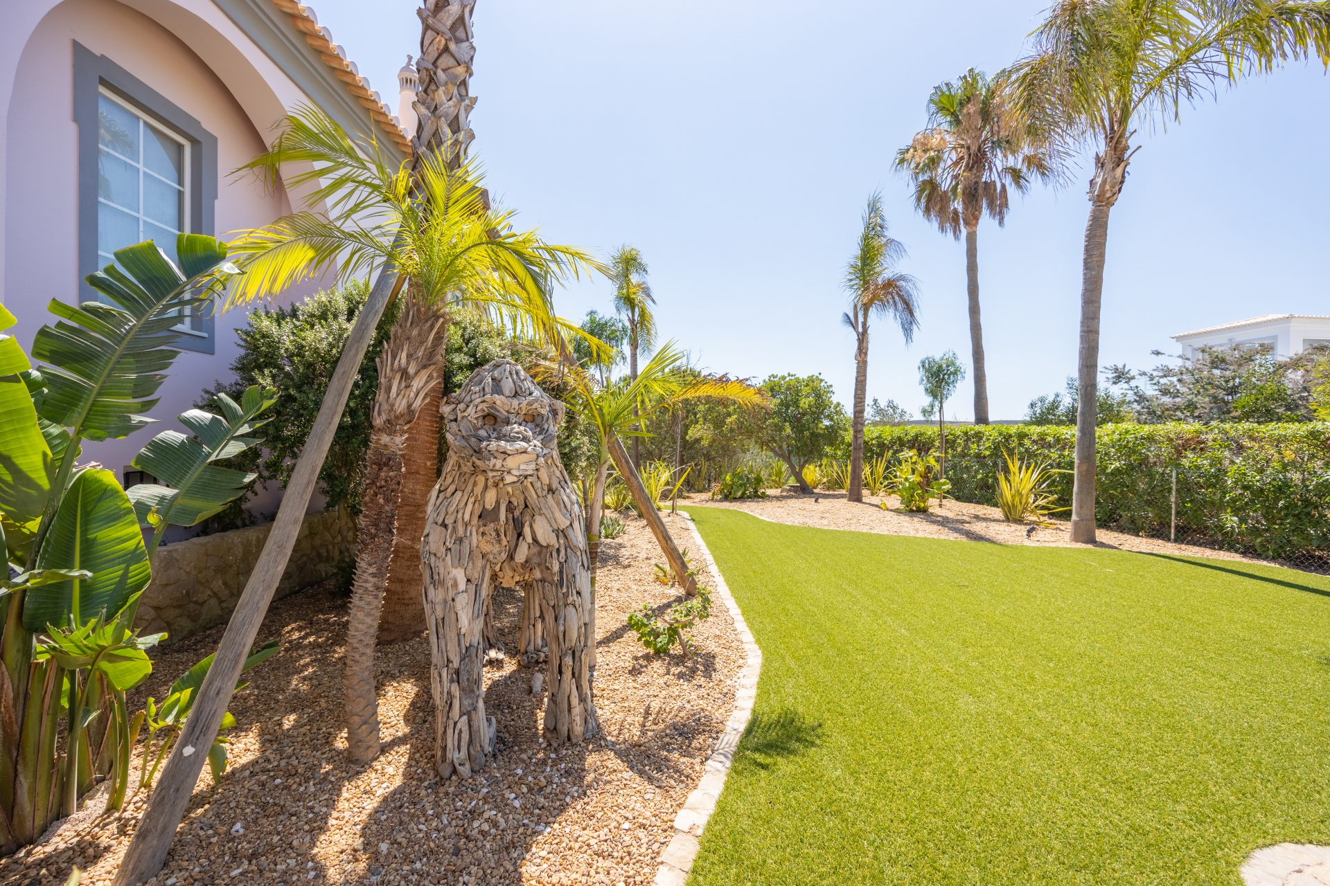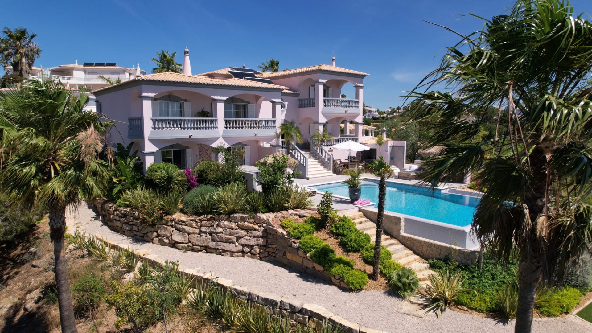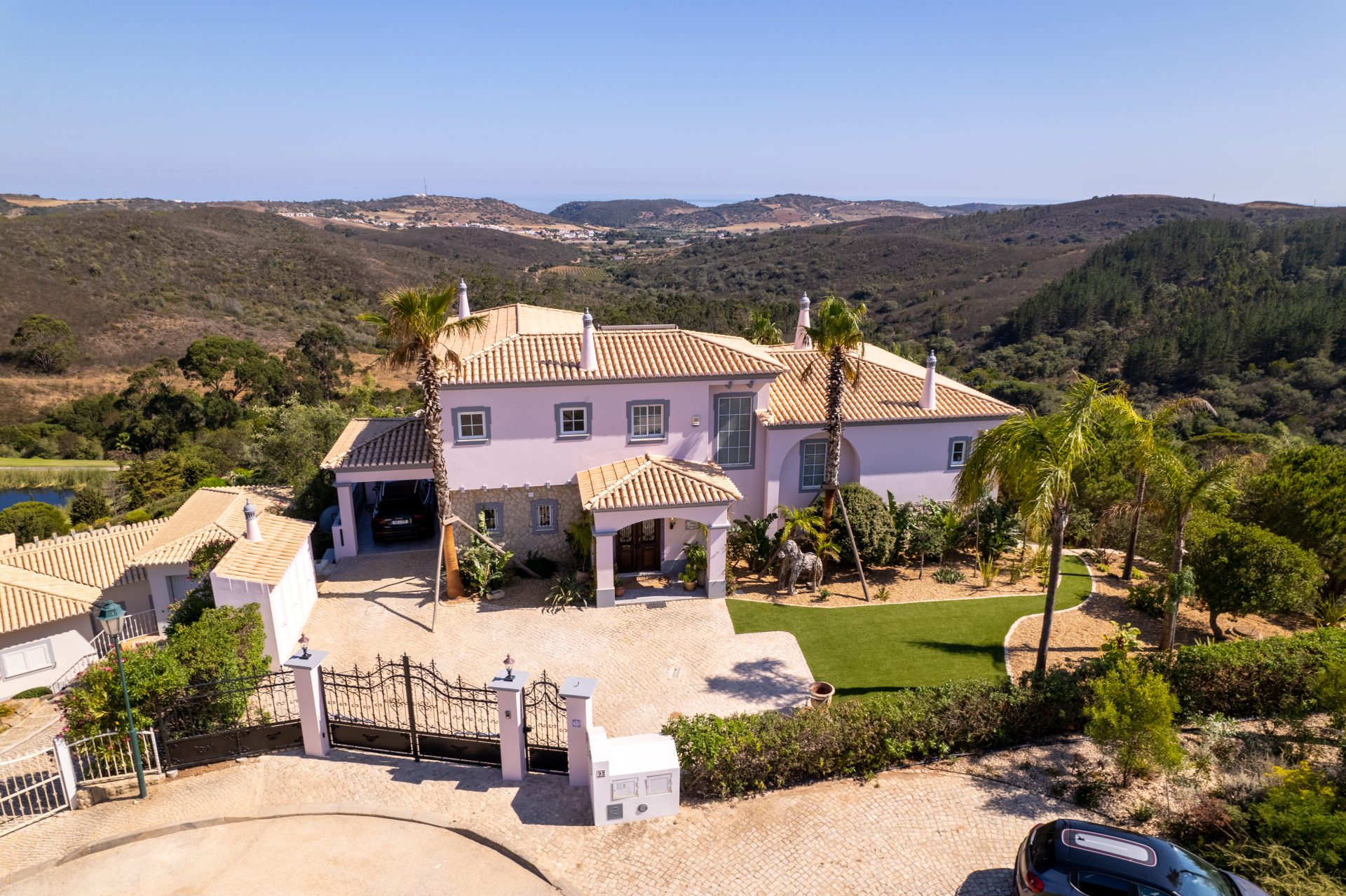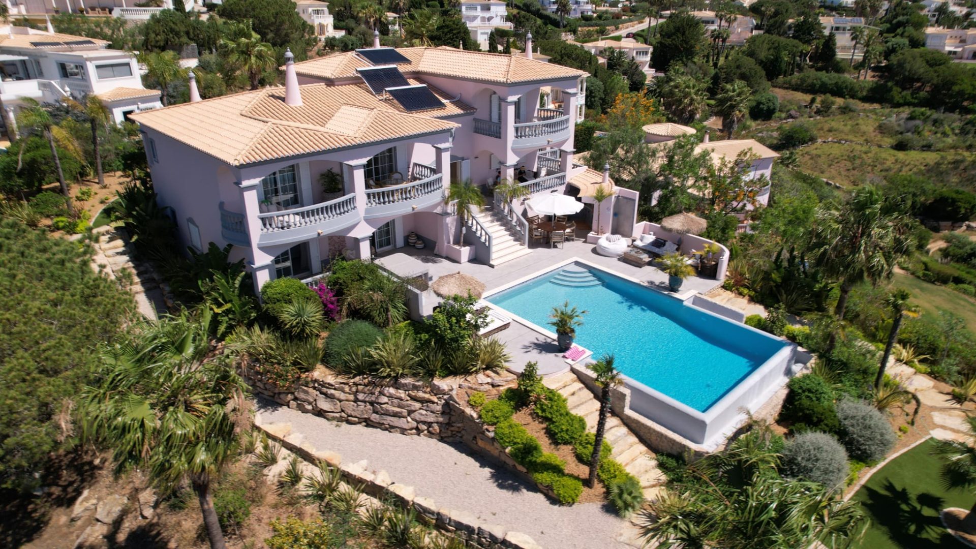 Deze villa is zorgvuldig ontworpen, met prachtige en zeer smaakvolle details die overal in de woning zichtbaar zijn. Opgevat in een open plan, vloeit de ruimte over van een centraal kookeiland naar de loungeruimte met een dubbel houtvuur.  Alle ruimtes en slaapkamers op de eerste verdieping hebben een adembenemend panoramisch uitzicht en zijn zeer privé met elk een eigen en-suite badkamer. Op het lagere niveau bevindt zich het gastengedeelte met 2 extra en-suite slaapkamers met directe toegang tot het zwembadgedeelte. Op het zwembadterras is het mogelijk om 270º te genieten van een prachtig uitzicht op de golfbaan, het landschap en de oceaan. Hier is er een buiten BBQ keuken, zeer goed uitgerust, een jacuzzi, een vuurplaats voor koele avonden, en een buitendouche. Luxueuze en uitgestrekte exotische mediterrane tuinen omringen het pand en bieden optionele meeslepende ruimtes om uit te rusten in volledige privacy.