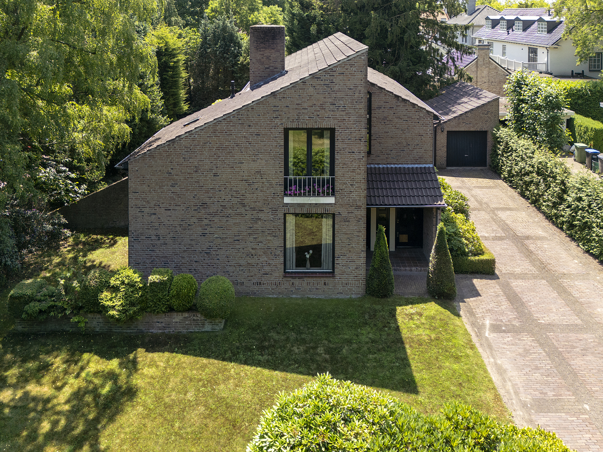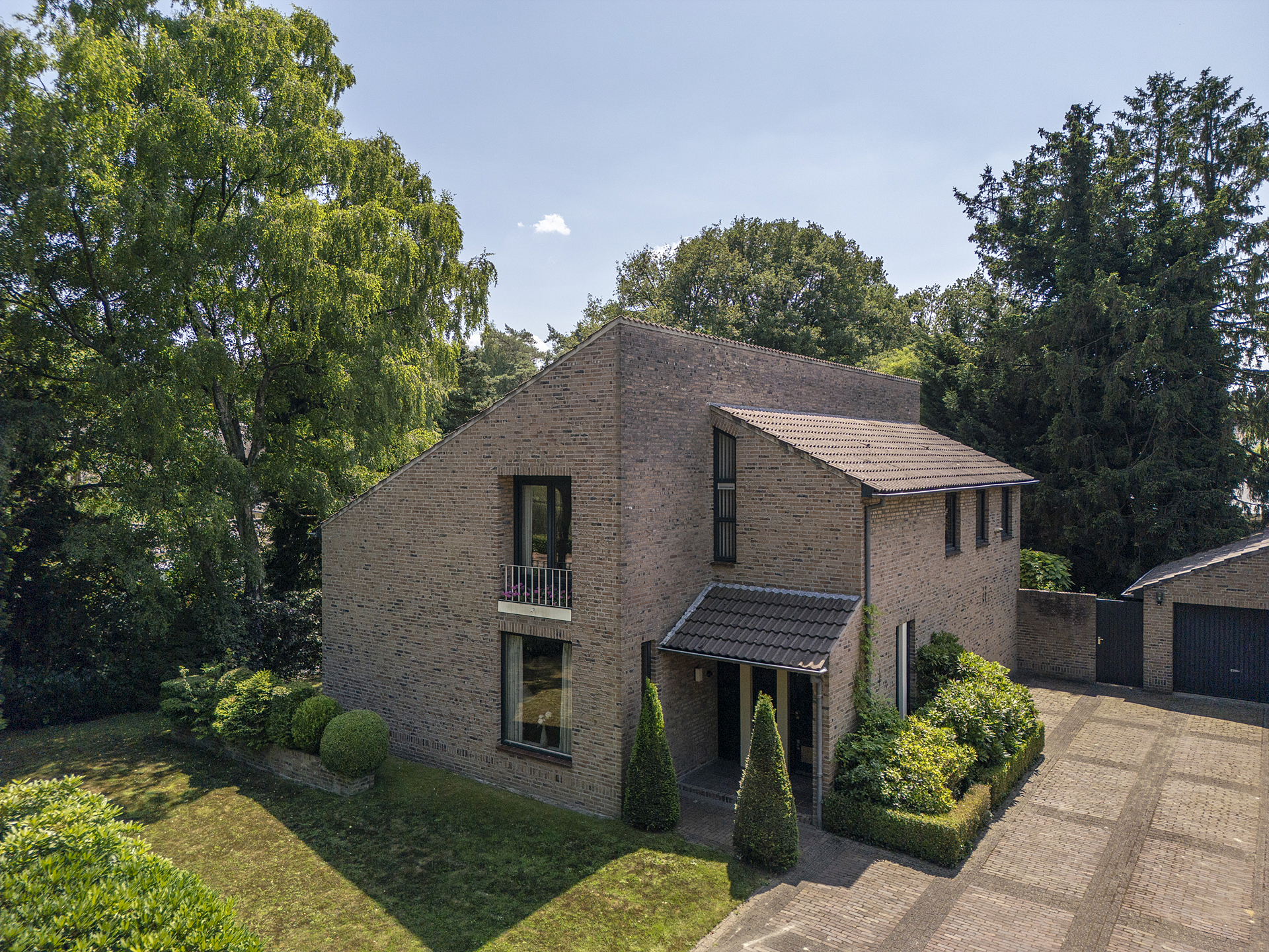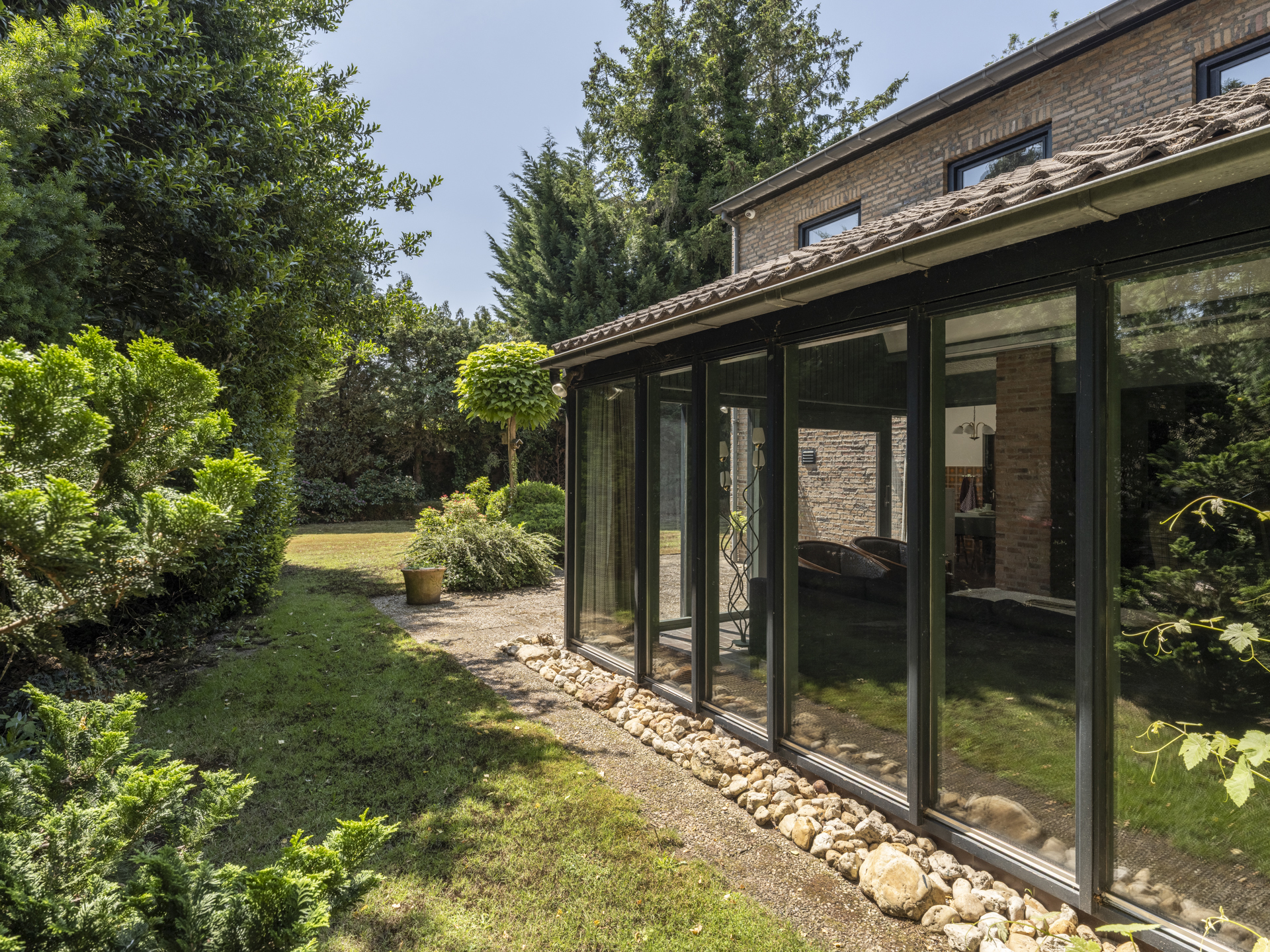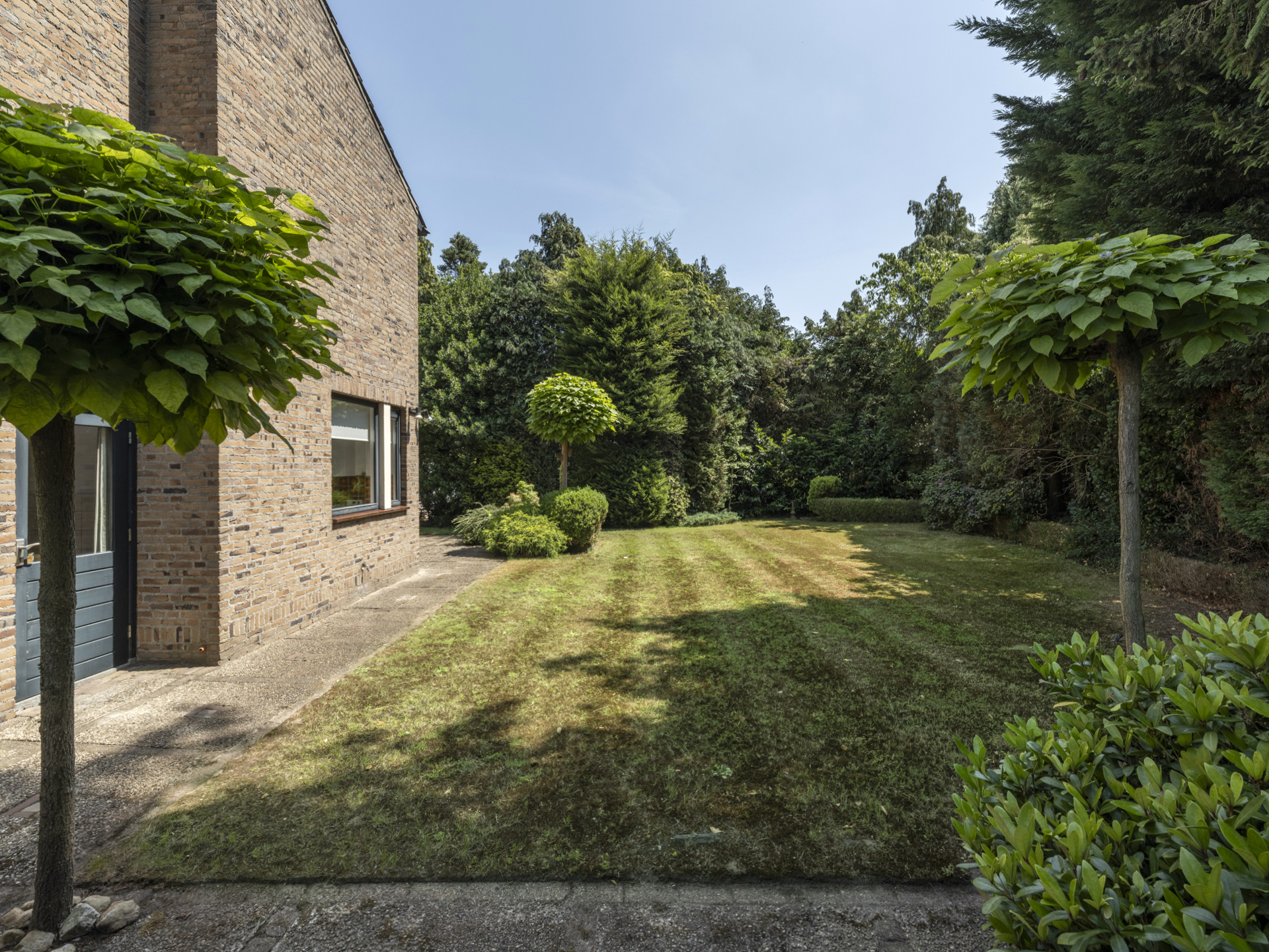 De verzorgde, groene tuin rondom de woning biedt meerdere terrassen, volwassen beplanting en optimale privacy. De achtertuin is georiënteerd op het zuiden en biedt volop ruimte om te ontspannen of te spelen. Een vrijstaande, stenen garage samen met de oprit aan de voorzijde biedt parkeergelegenheid voor meerdere auto’s.