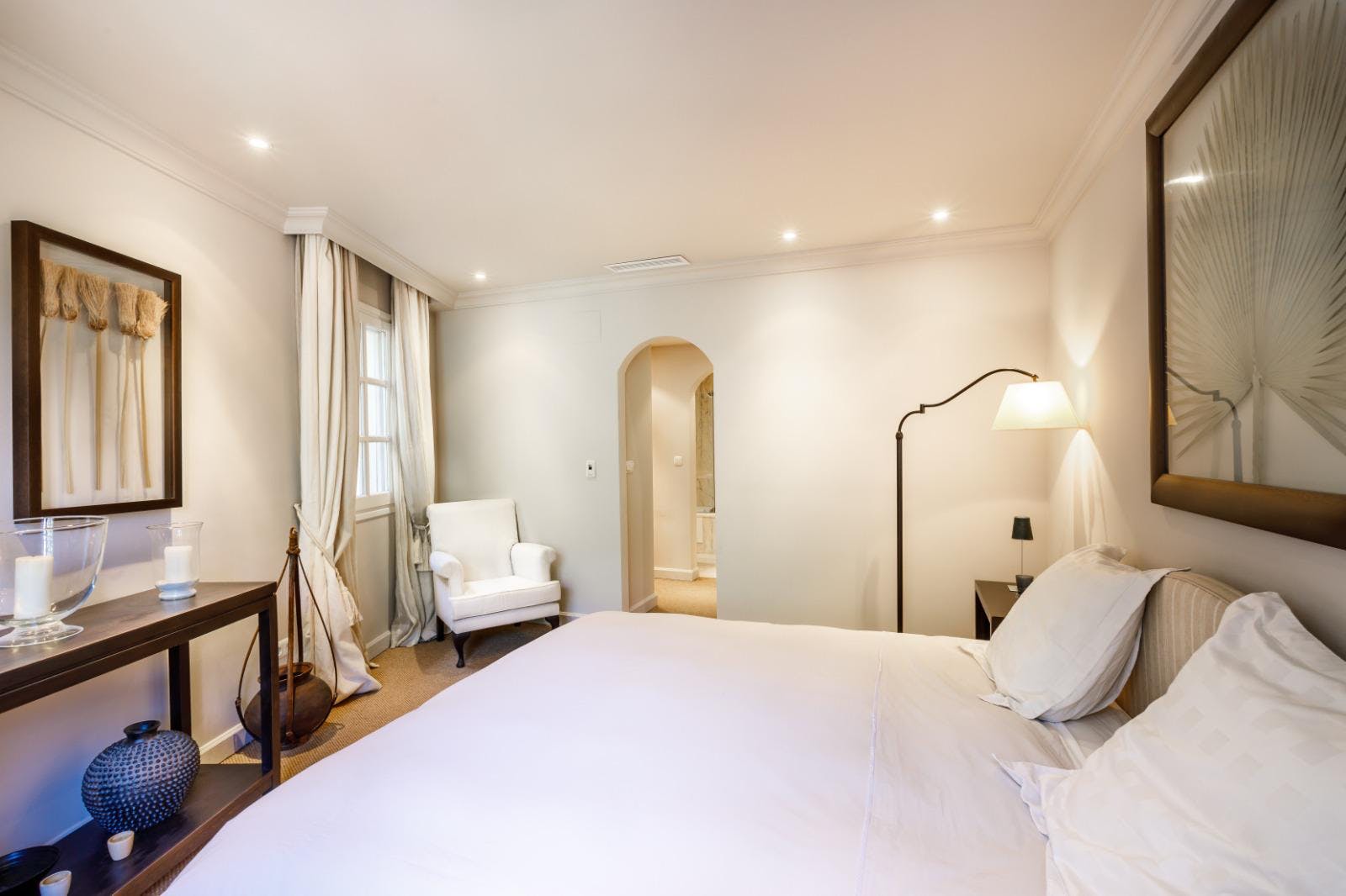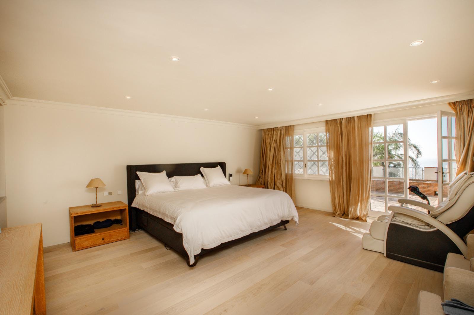 Hoofdwoning: Grote hal, ruime woon- en eetkamer met open haard, volledig ingerichte open keuken met ontbijthoek, kleine slaapkamer en suite. Directe toegang tot de overdekte en open terrassen en het zwembad.