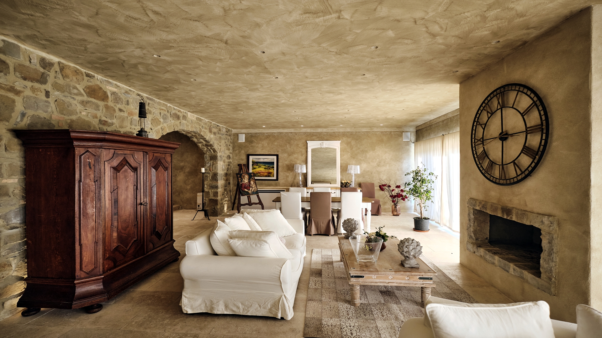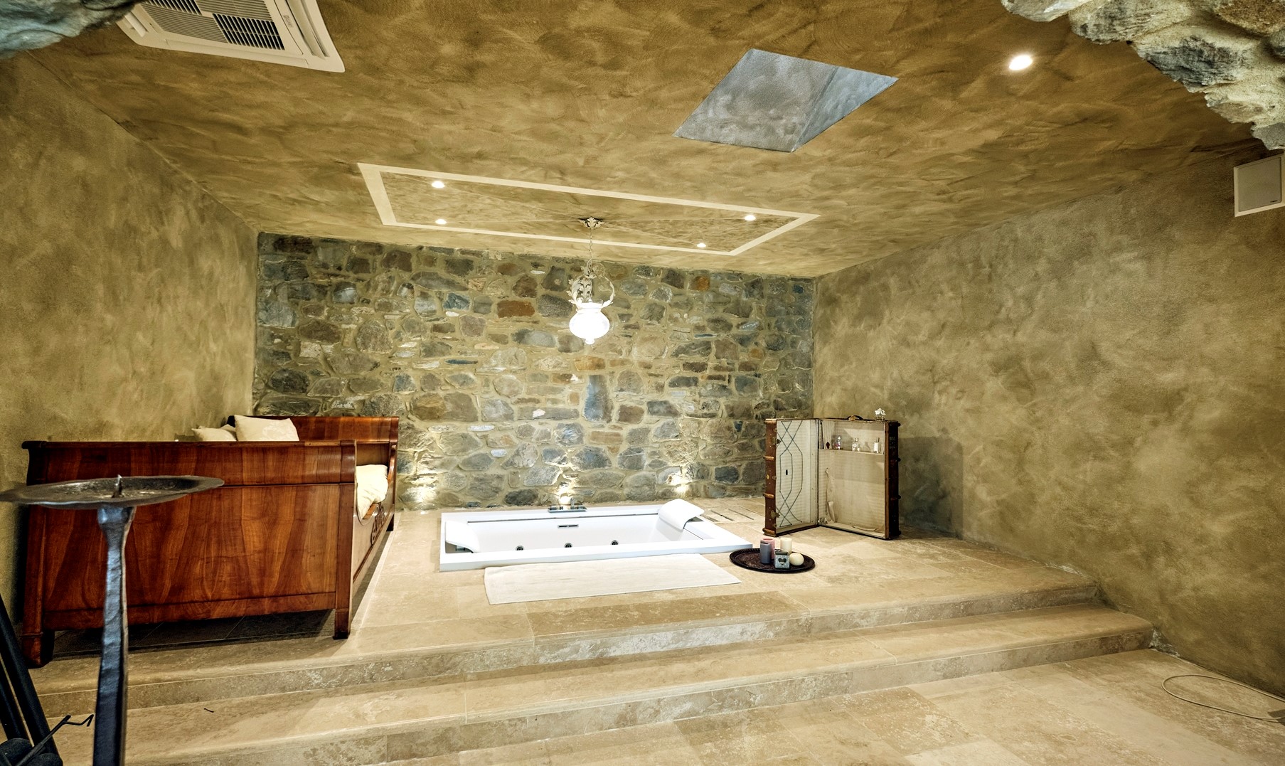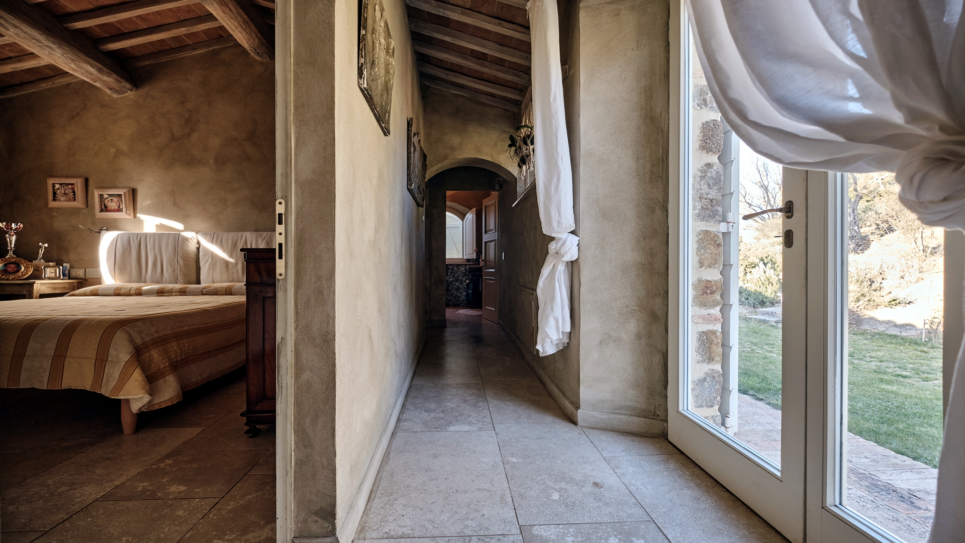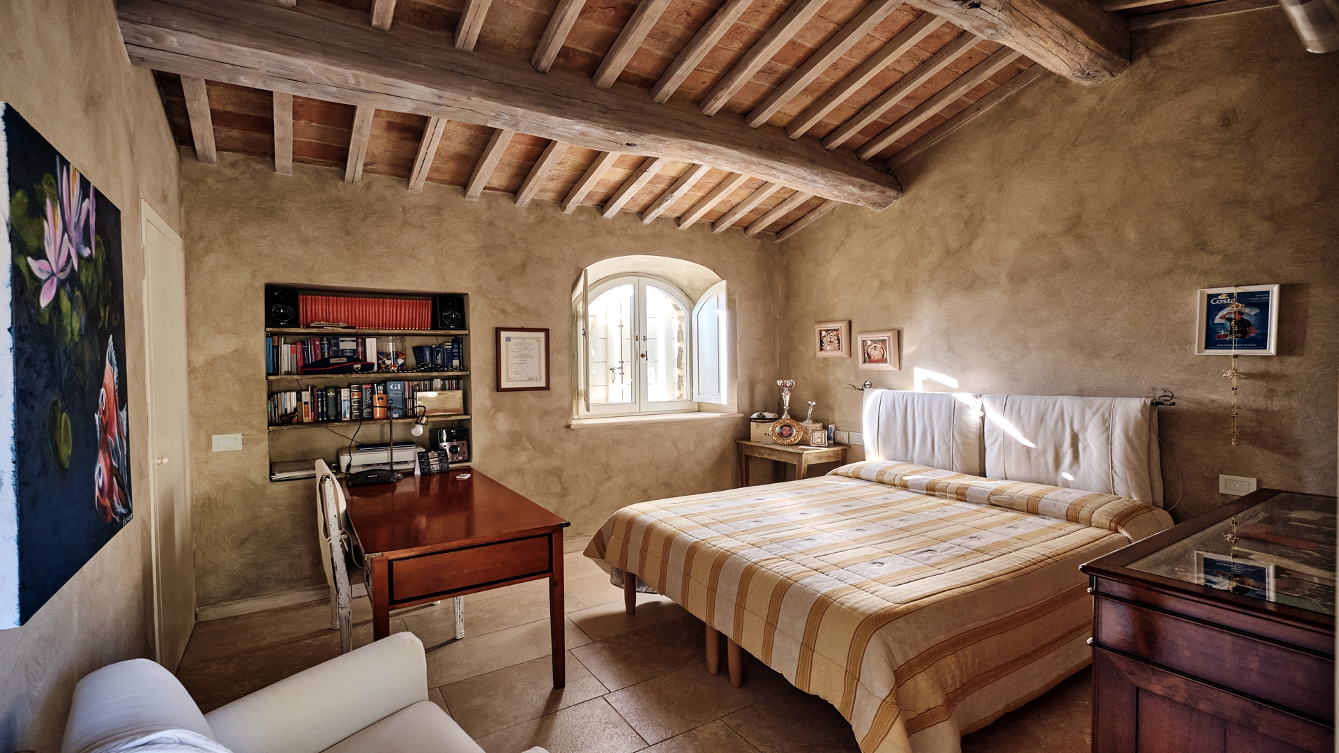 Beklim de travertijnen trap met een tongewelf naar de verdieping erboven, waar de slaapvertrekken wachten. De hoofdslaapkamer, compleet met een gezellige open haard en een eigen badkamer, biedt een vredig toevluchtsoord na een lange dag. Twee extra slaapkamers worden bediend door een tweede badkamer, zodat elke gast geniet van een comfortabel verblijf. Vanuit de verbindingsgang heb je toegang tot de tuin en kun je de andere verdiepingen extern verkennen, zodat je de schoonheid van de boerderij vanuit elke hoek kunt bewonderen.