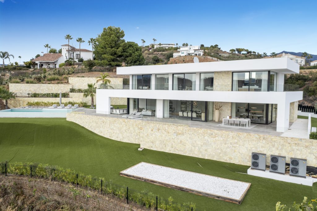 Een unieke recent gebouwde eigentijdse villa in Urbanisatie Monte Mayor, gebouwd volgens de hoogste normen. Op het zuiden en westen gelegen met een indrukwekkend panoramisch uitzicht op zee en de bergen.