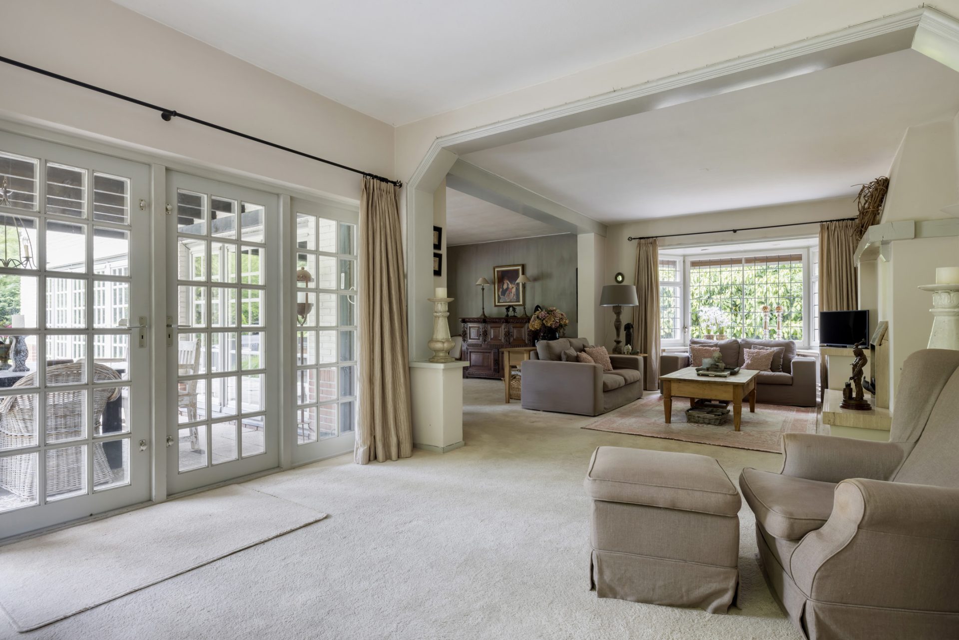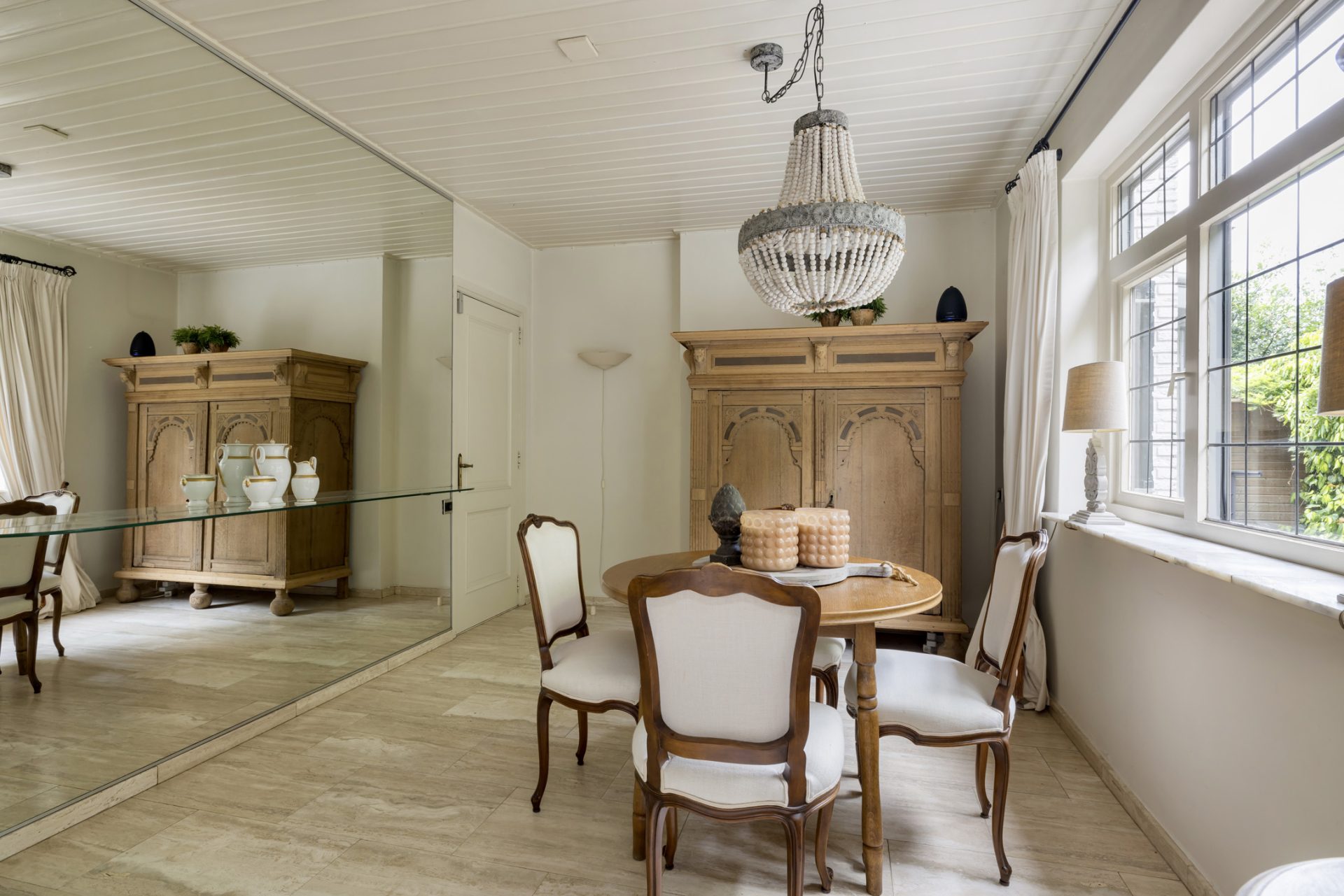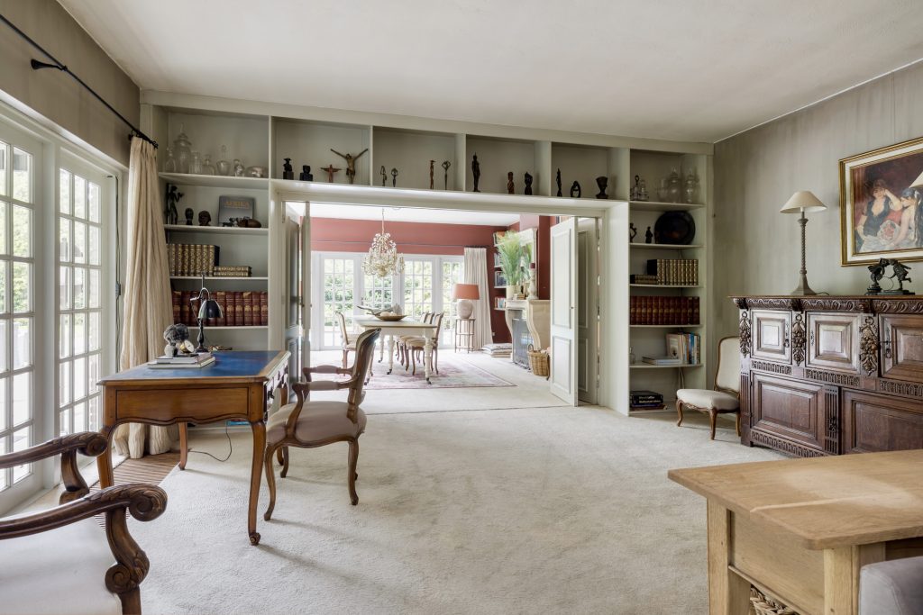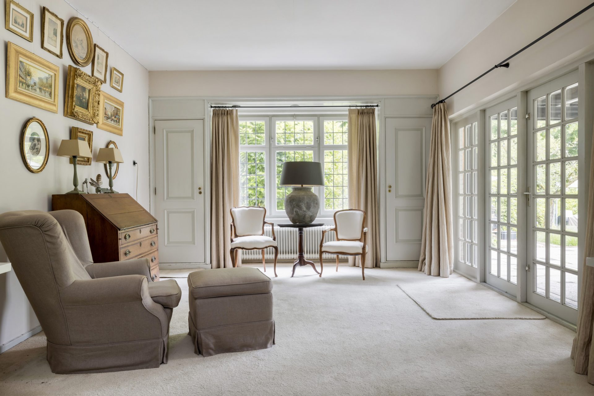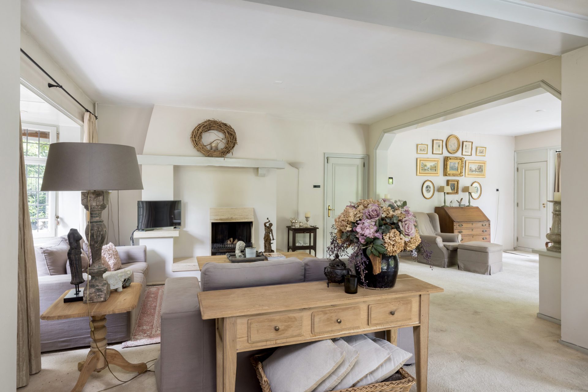 De living is een absolute blikvanger: tuingericht, royaal van opzet en ingedeeld met een sfeervolle kamer-en-suite. Aan de voorzijde een zitkamer met erker, vaste kasten en open haard, aan de achterzijde openslaande deuren naar het terras, een Franse zandstenen schouw en zicht op het groen. Deze ruimte combineert stijl, warmte en functionaliteit op hoog niveau.