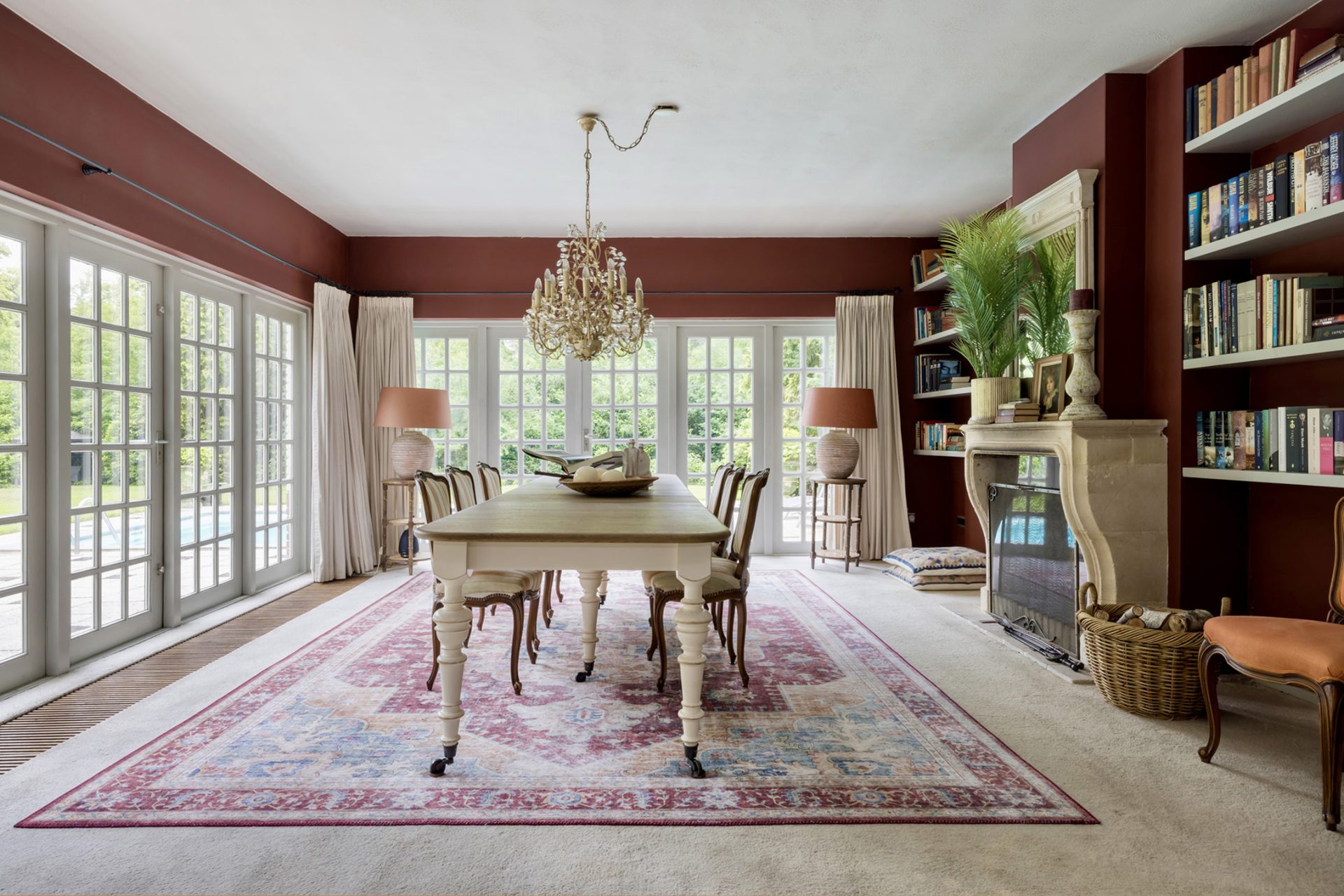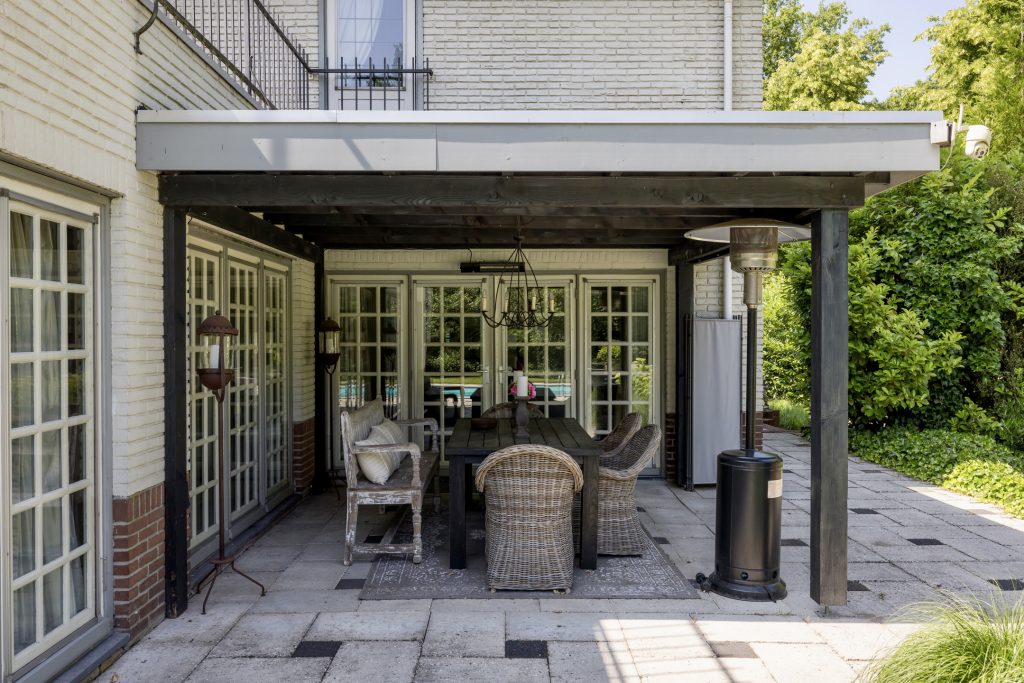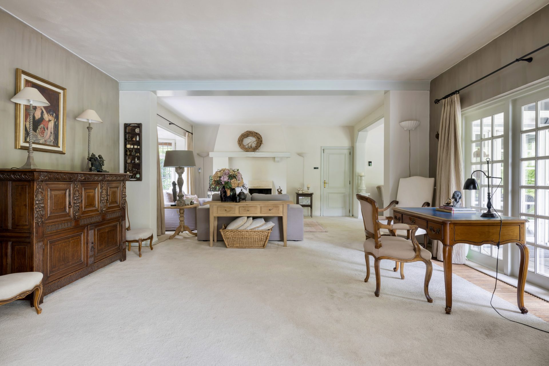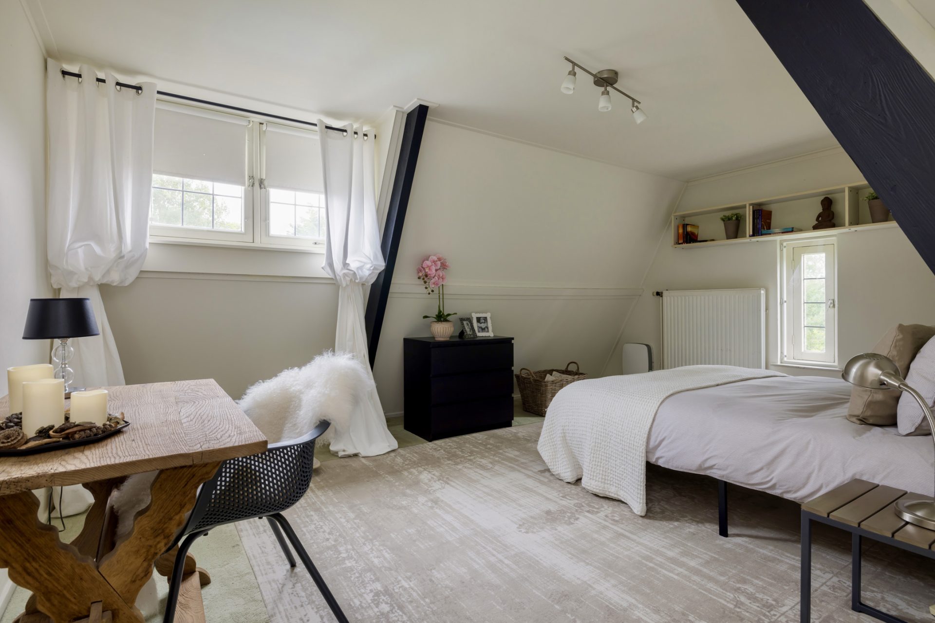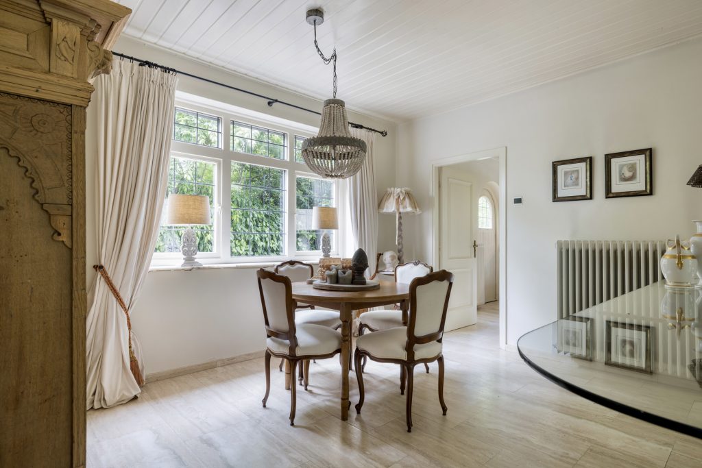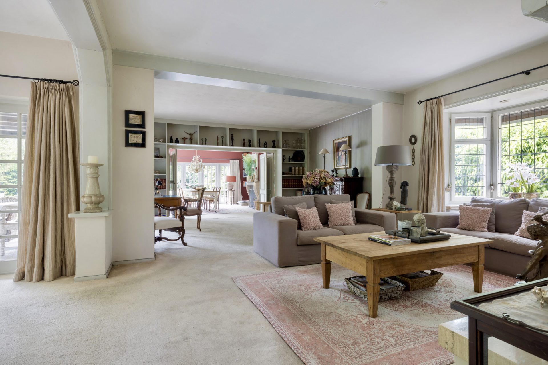 De living is een absolute blikvanger: tuingericht, royaal van opzet en ingedeeld met een sfeervolle kamer-en-suite. Aan de voorzijde een zitkamer met erker, vaste kasten en open haard, aan de achterzijde openslaande deuren naar het terras, een Franse zandstenen schouw en zicht op het groen. Deze ruimte combineert stijl, warmte en functionaliteit op hoog niveau.