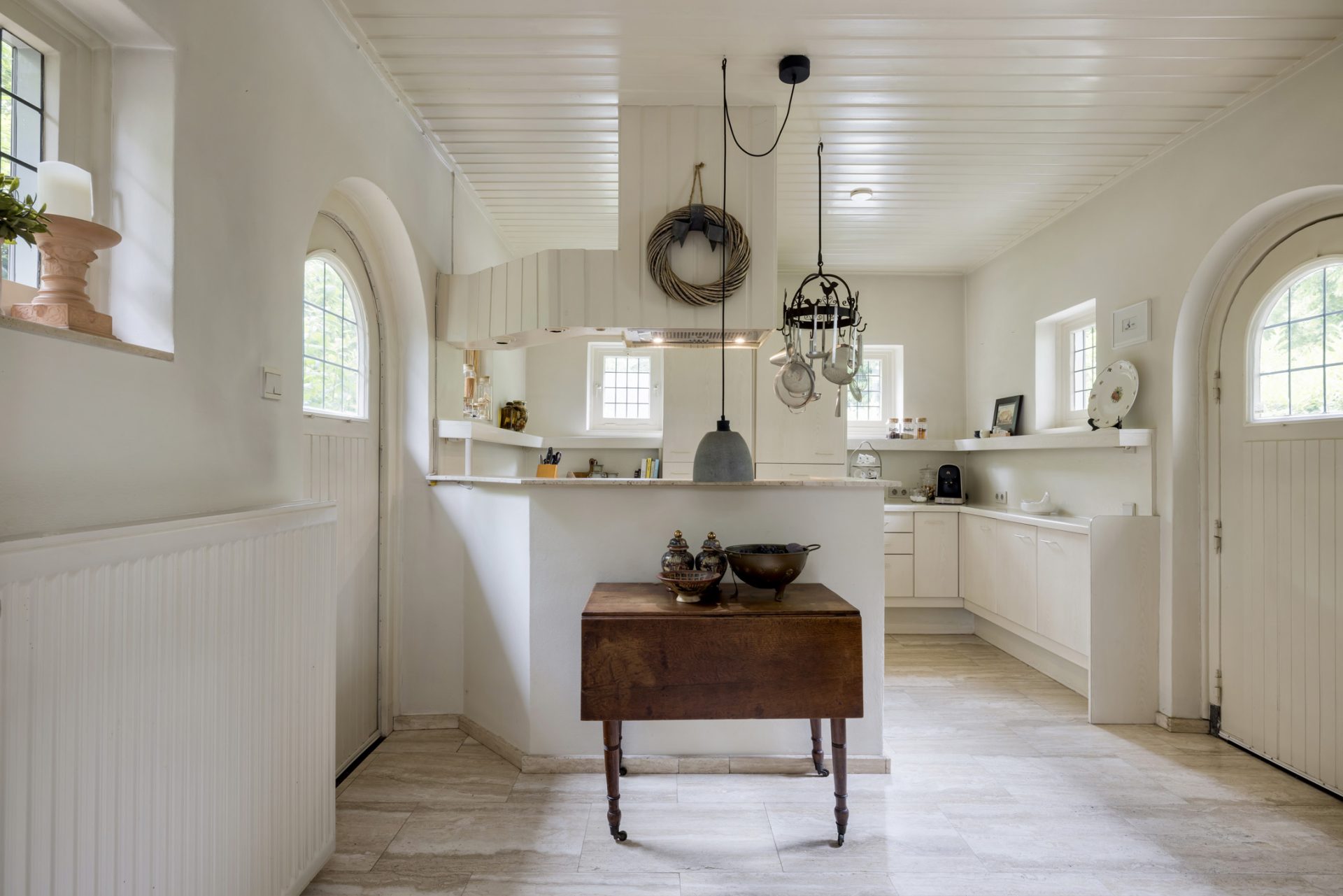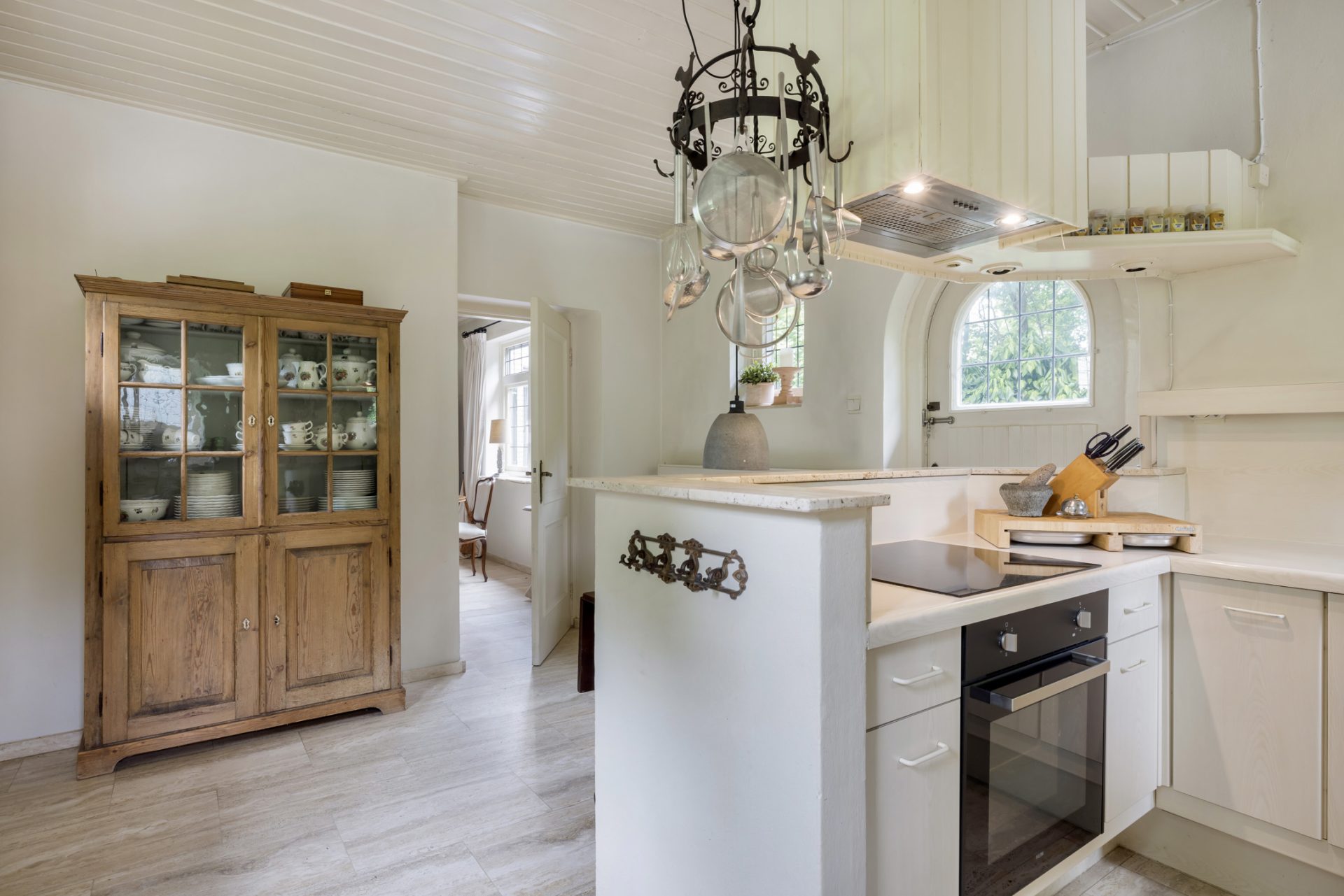 De aangrenzende eetkamer is voorzien van een travertinvloer en biedt toegang tot de manshoge kelder. De woonkeuken is een gezellige plek met uitzicht op de tuin en voorzien van een complete U-opstelling met keramische kookplaat, koelkast, vriezer, vaatwasser en diverse karakteristieke elementen zoals glas-in-loodramen en gebogen buitendeuren.