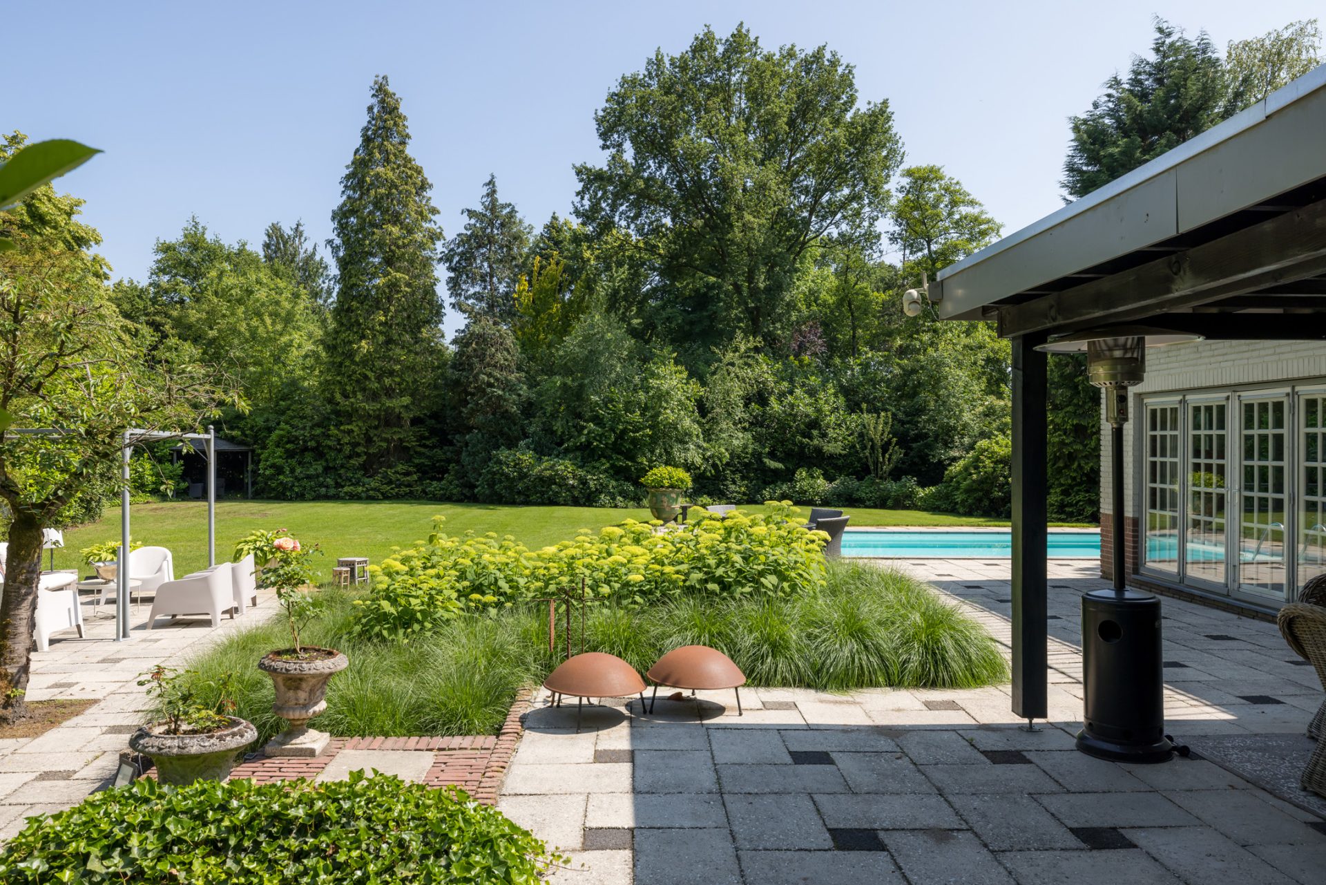 De tuin rondom het huis is tot in de puntjes verzorgd en volledig omheind. Volwassen beplanting, meerdere terrassen, een royaal gazon, buitenverlichting en een verwarmd zwembad creëren een plek waar het iedere dag genieten is. Het zwembad is recent voorzien van een vervangen binnenzak en stenen randafwerking. De oprit biedt volop parkeergelegenheid en leidt naar een dubbele garage met elektra en een praktische bergvliering.