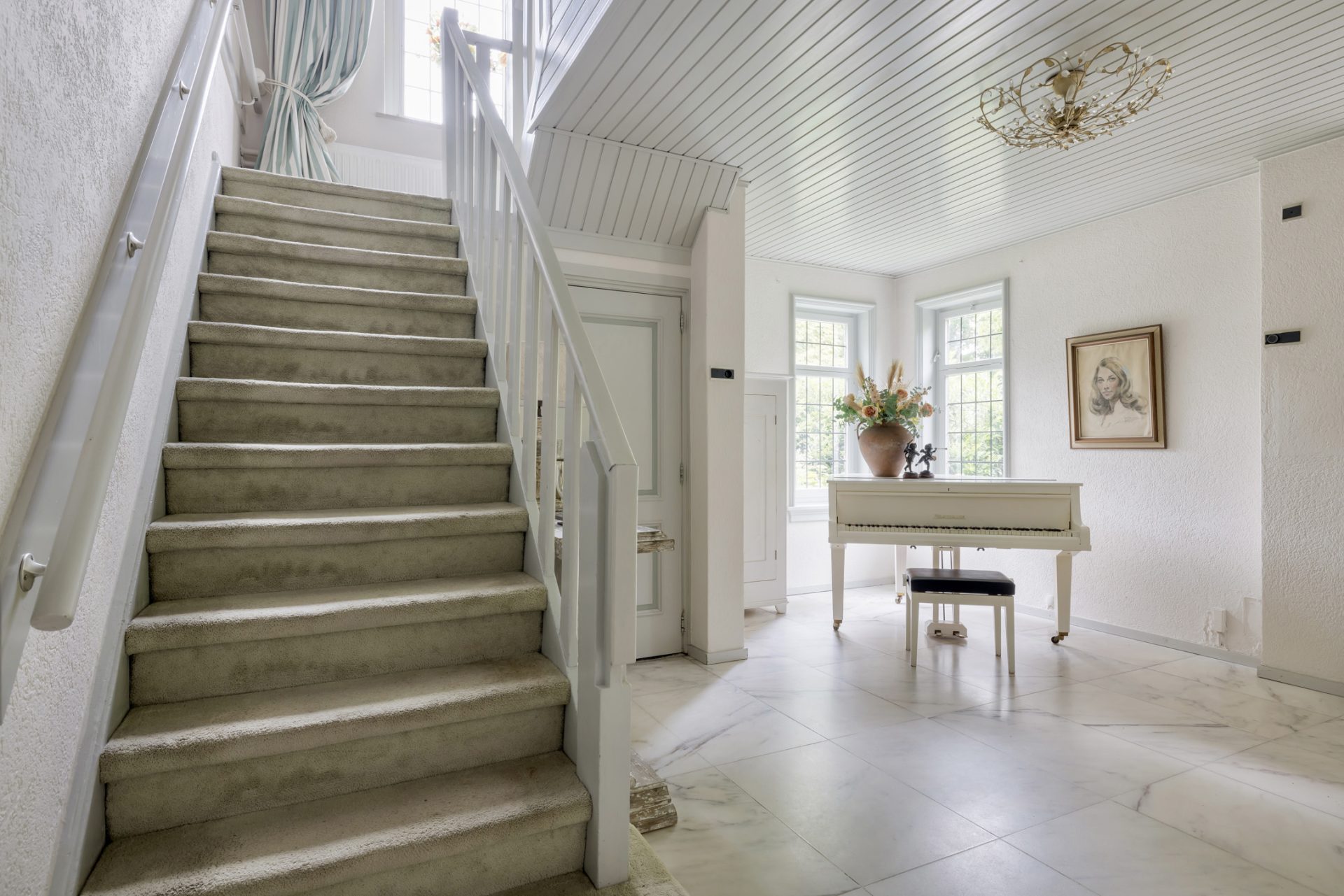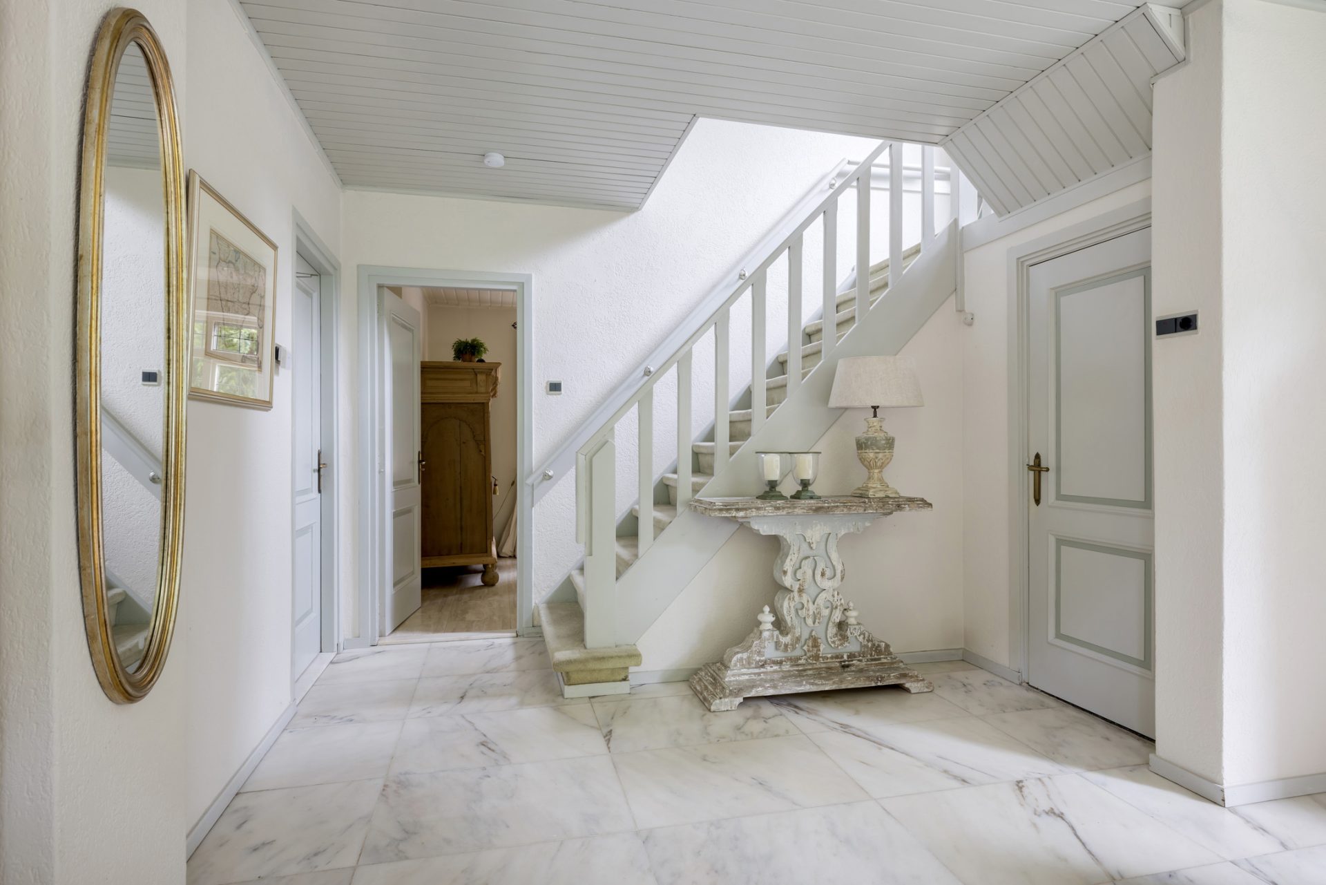 De entree is groots, met een royale ontvangsthal, een marmeren vloer, fraai toilet met fonteintje en een elegante bordestrap. Glas-in-loodramen zorgen hier voor een bijzonder mooie lichtinval.