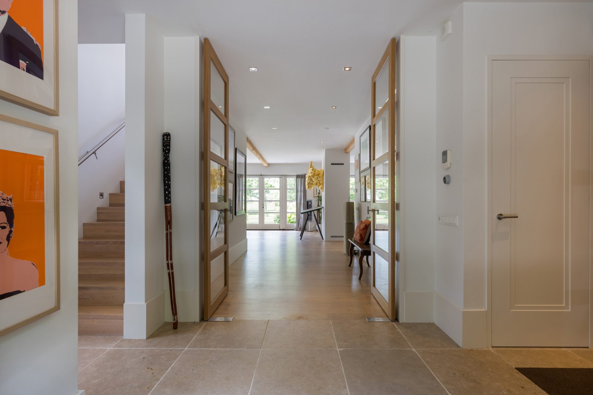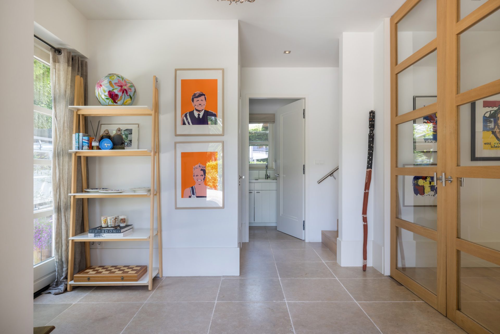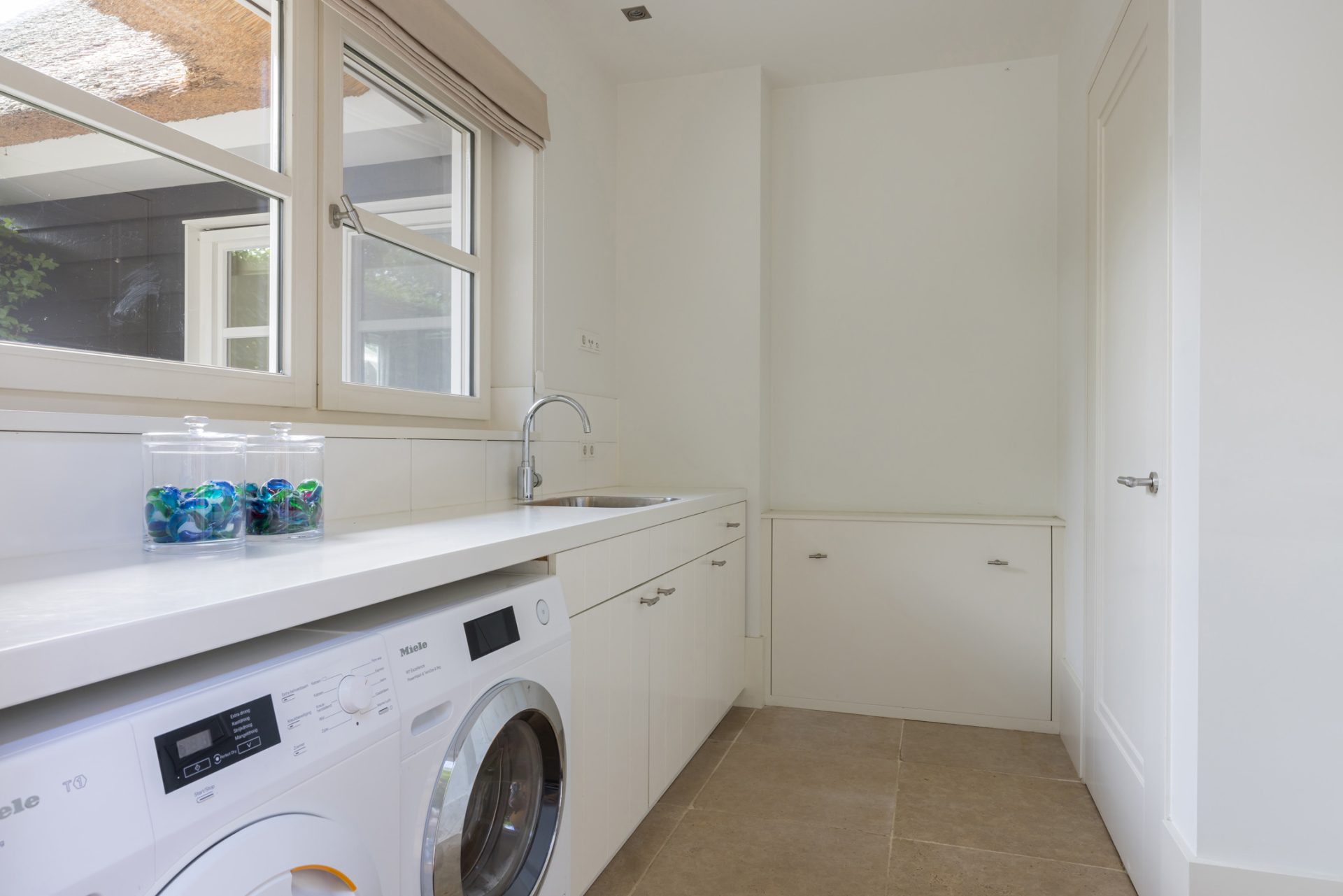 Via dubbele deuren loop je de hal in, met het gastentoilet en fantastisch lichtinval aan twee zijden. Naast de trap bevindt zich een bijkeuken met eigen entree en een praktisch keukenblok met spoelbak. Ook zijn hier de wasmachine en droger geplaatst.