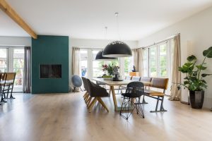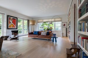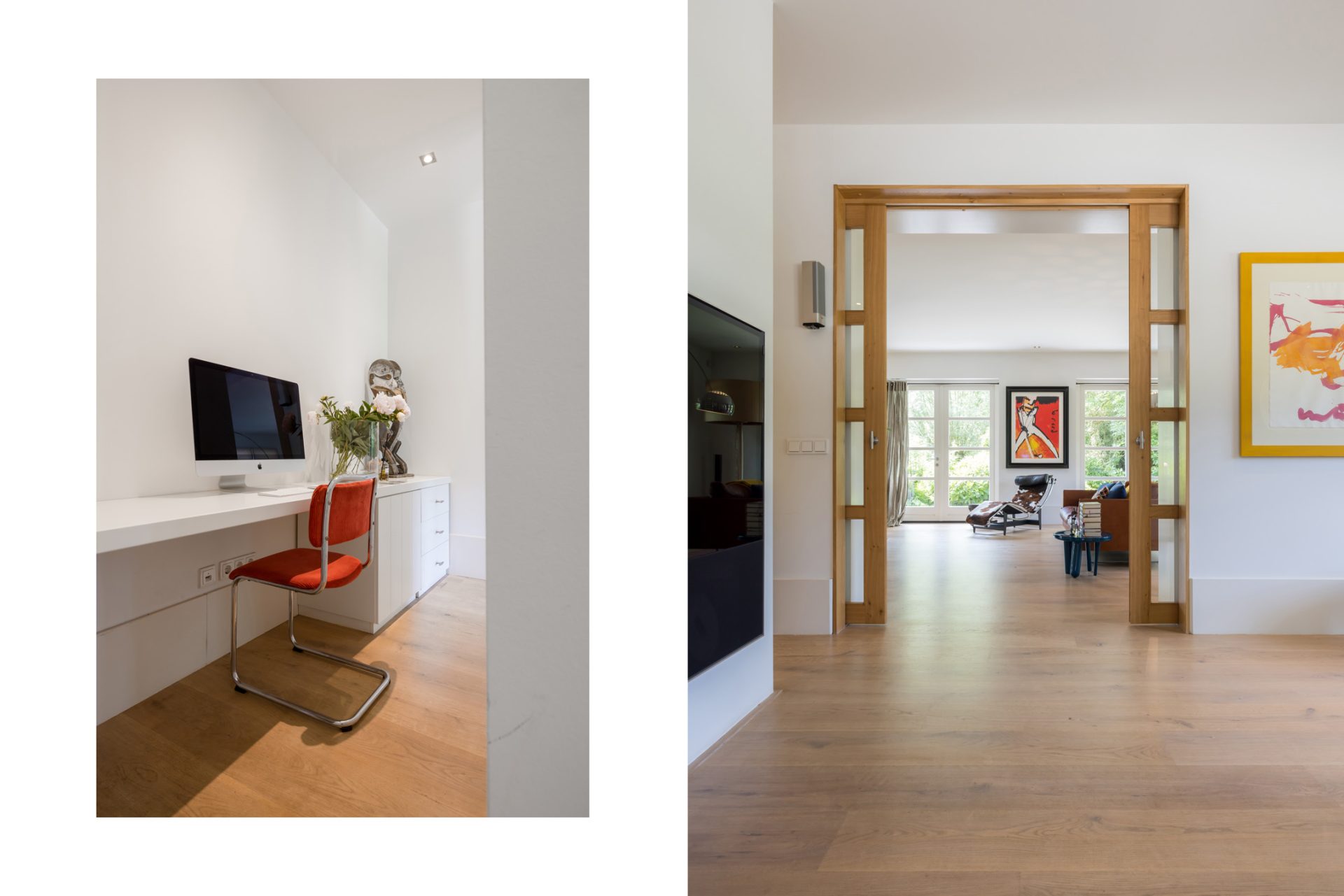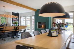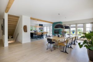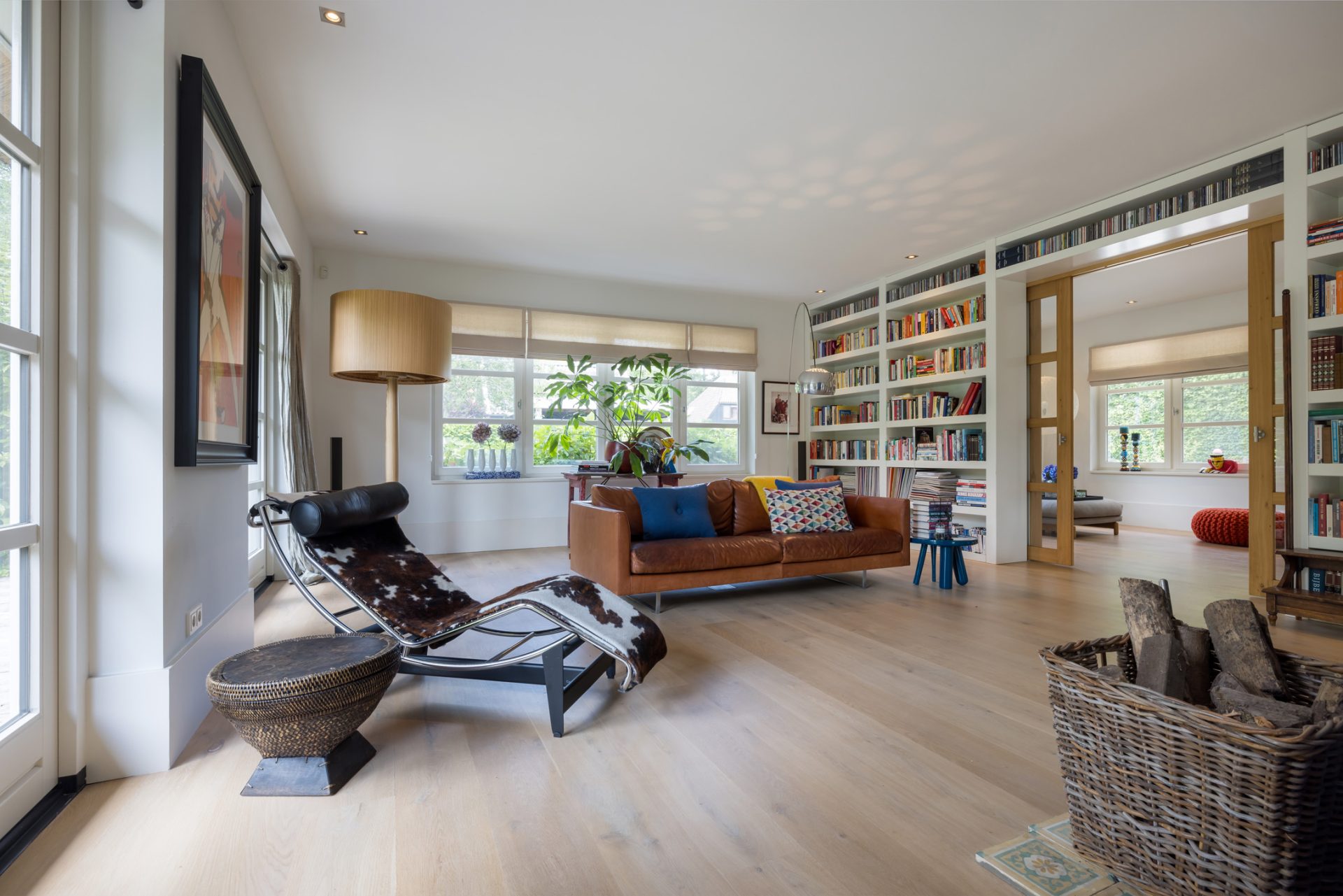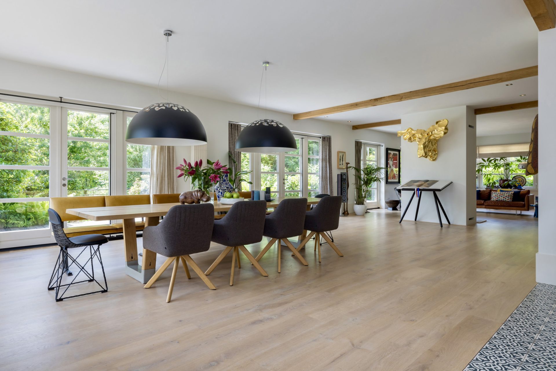 Aan de zonkant van de villa zijn de woon-/eetkamer en open keuken gesitueerd. Het uitzicht aan drie kanten naar de tuin is fantastisch en de mate van privacy is optimaal. Meerdere dubbele openslaande deuren verbinden de woon-/eetkamer met het terras. De eetkamer is perfect voor een groot familiediner en het zitgedeelte, bij de open haard, straalt een aangename rust uit. Achter de op maat gemaakte kastenwand met schuifdeuren is de tv-kamer, waar je kunt genieten van een goede film.