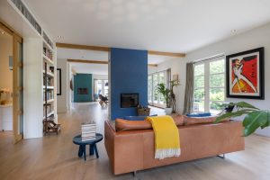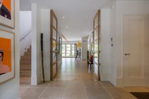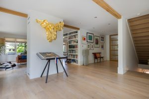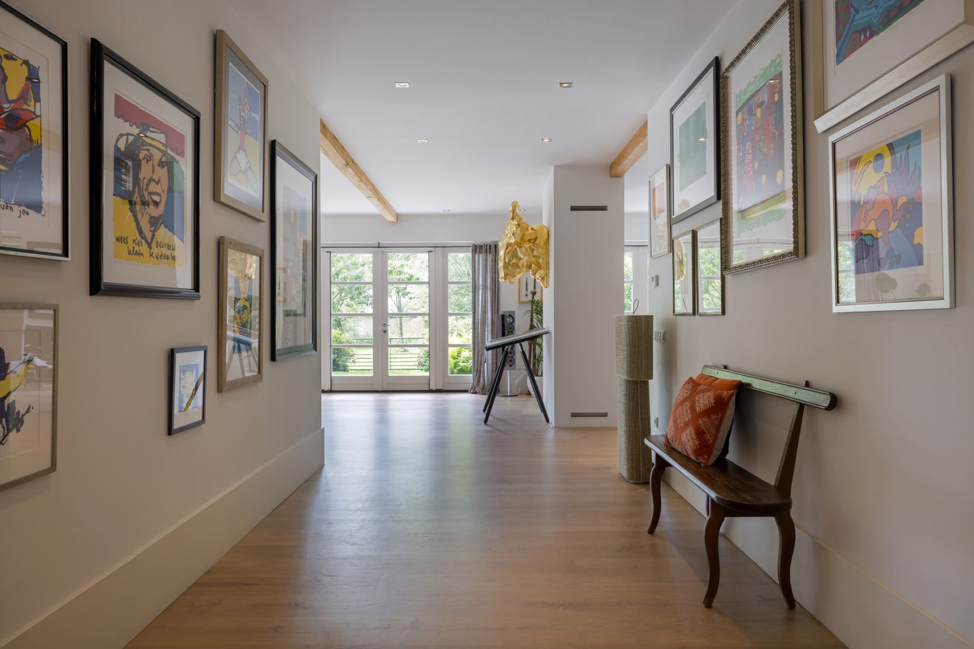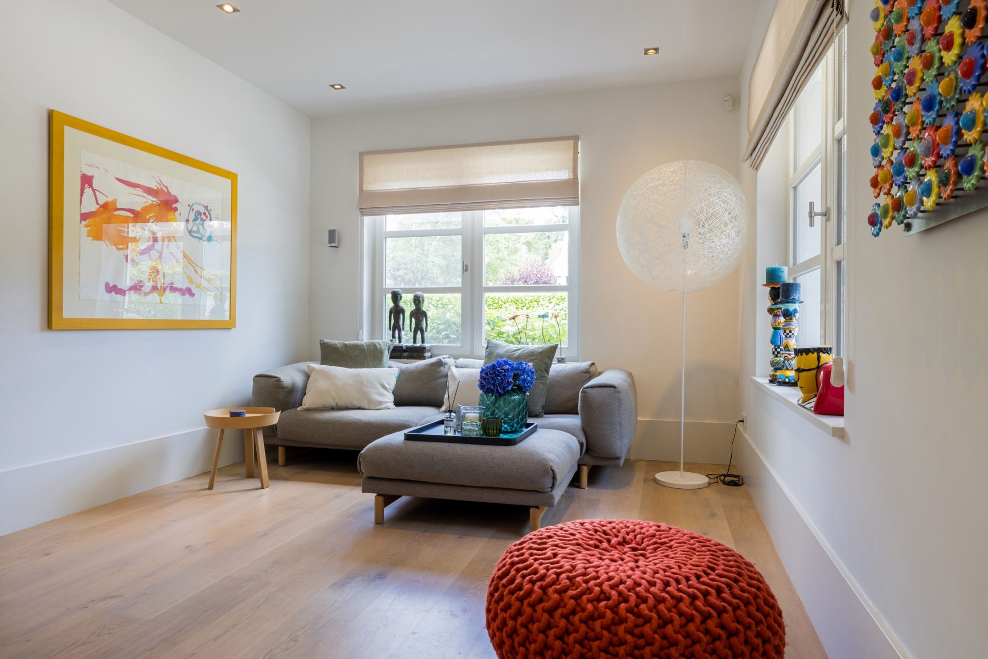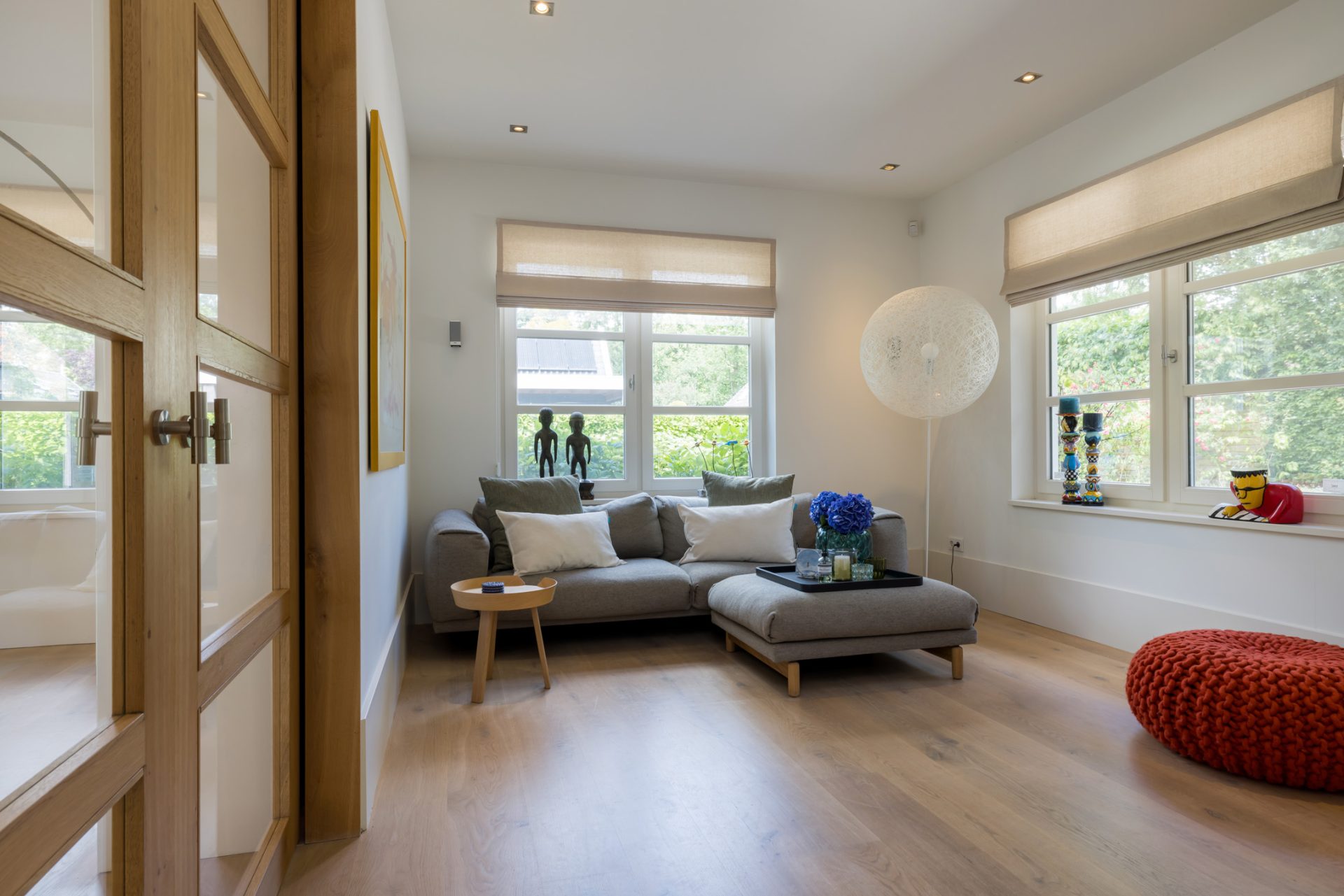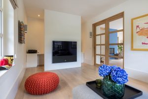Aan de zonkant van de villa zijn de woon-/eetkamer en open keuken gesitueerd. Het uitzicht aan drie kanten naar de tuin is fantastisch en de mate van privacy is optimaal. Meerdere dubbele openslaande deuren verbinden de woon-/eetkamer met het terras. De eetkamer is perfect voor een groot familiediner en het zitgedeelte, bij de open haard, straalt een aangename rust uit. Achter de op maat gemaakte kastenwand met schuifdeuren is de tv-kamer, waar je kunt genieten van een goede film.