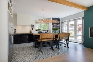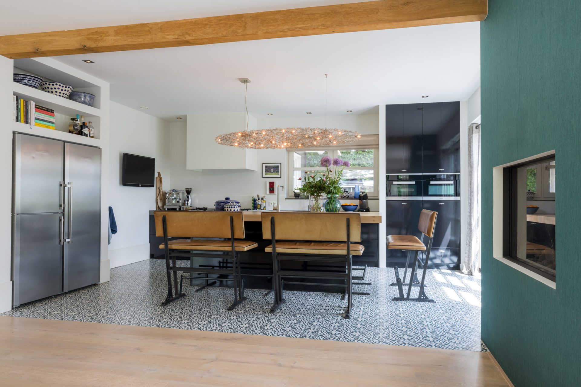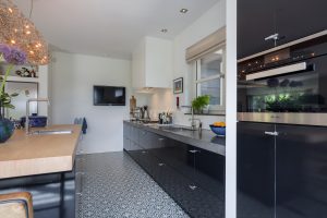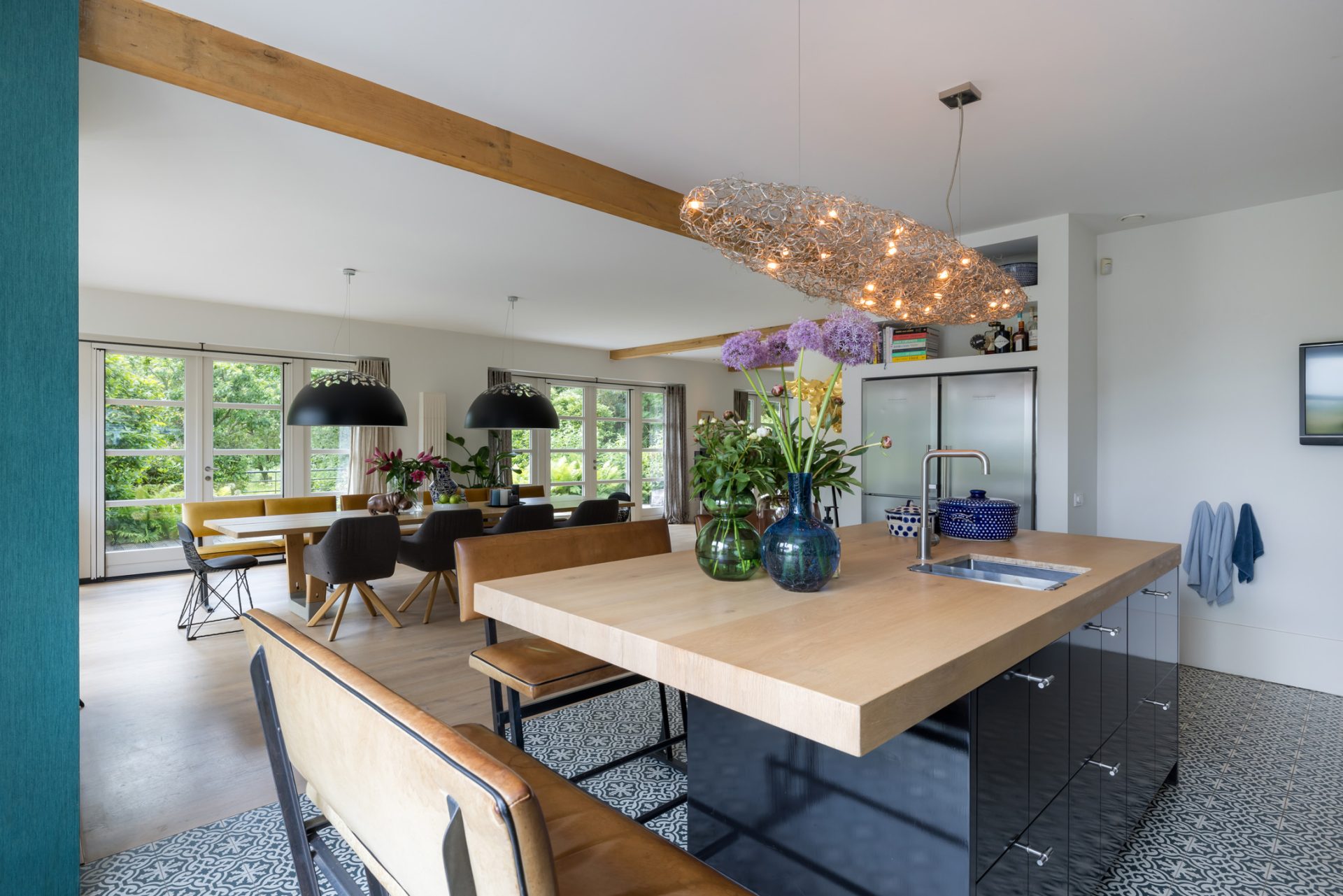 De keuken is de ideale plek voor elke kookliefhebber, waar passie voor koken tot leven komt te midden van een goed uitgeruste ruimte. Het grote eiland biedt zitgelegenheid voor 6 personen en de stijlvolle keukenopstelling in hoogglans zwart is voorzien van diverse inbouw-apparatuur. Ook kunt u via de openslaande deuren in de keuken naar het terras en tuin.