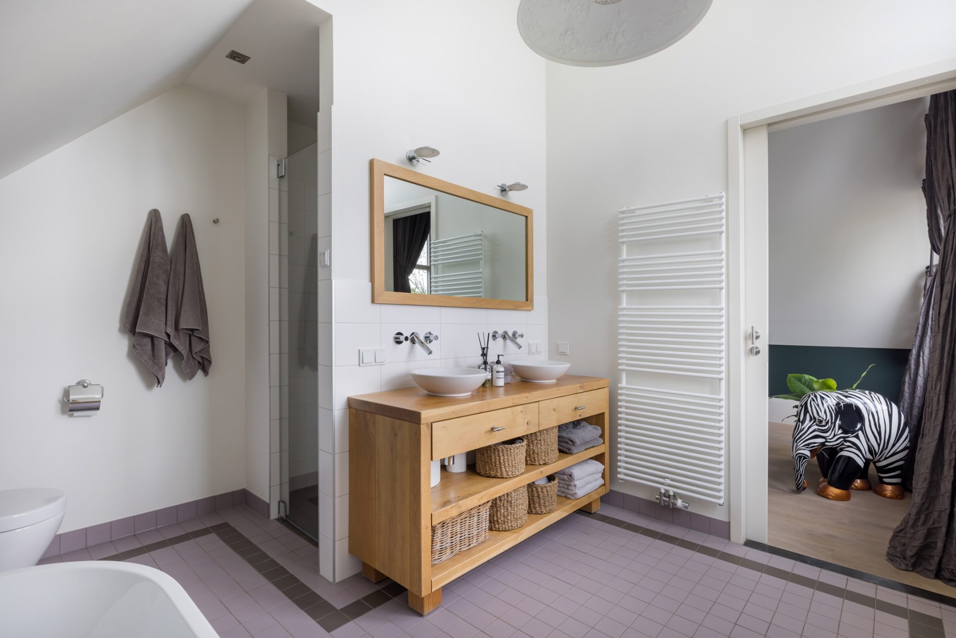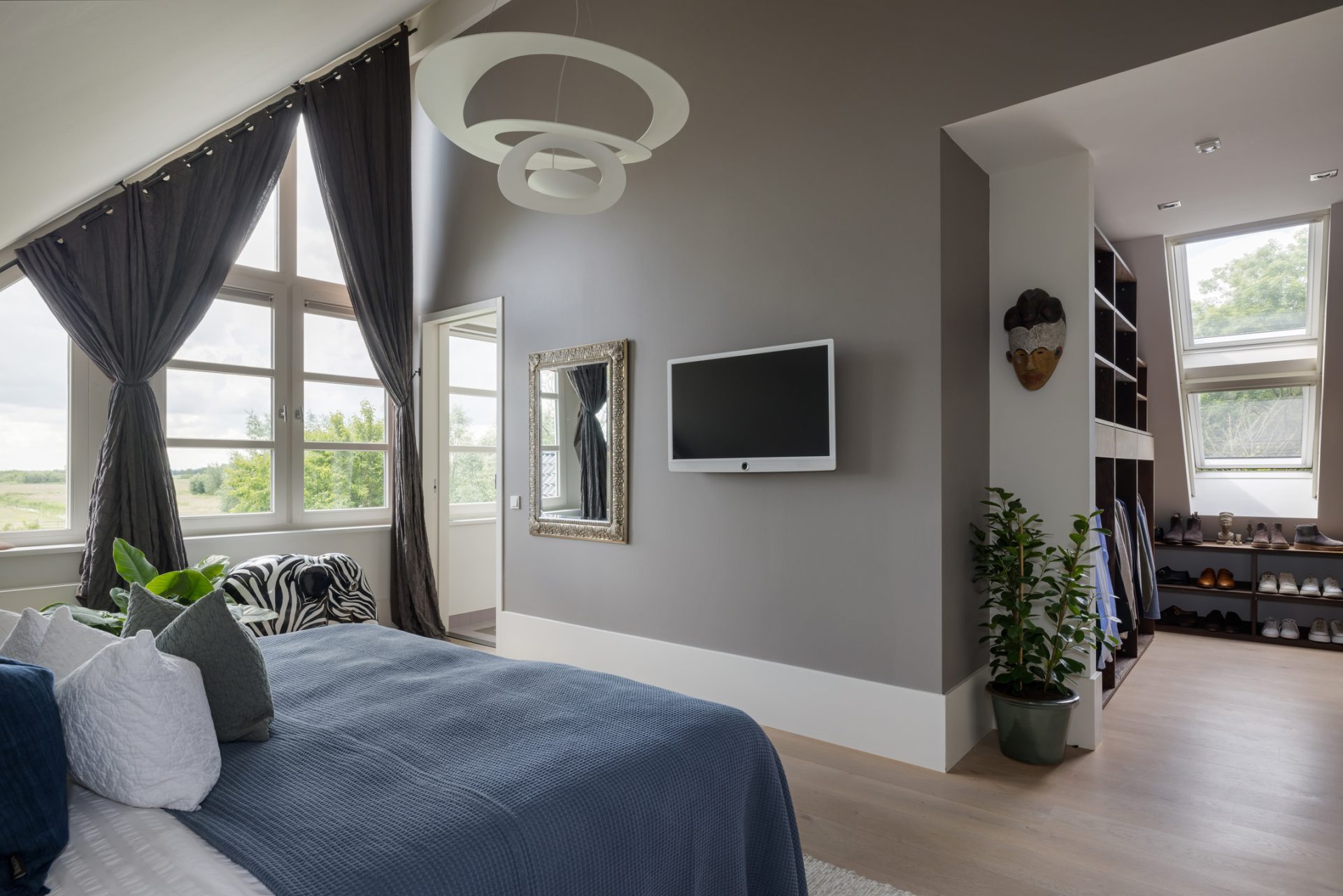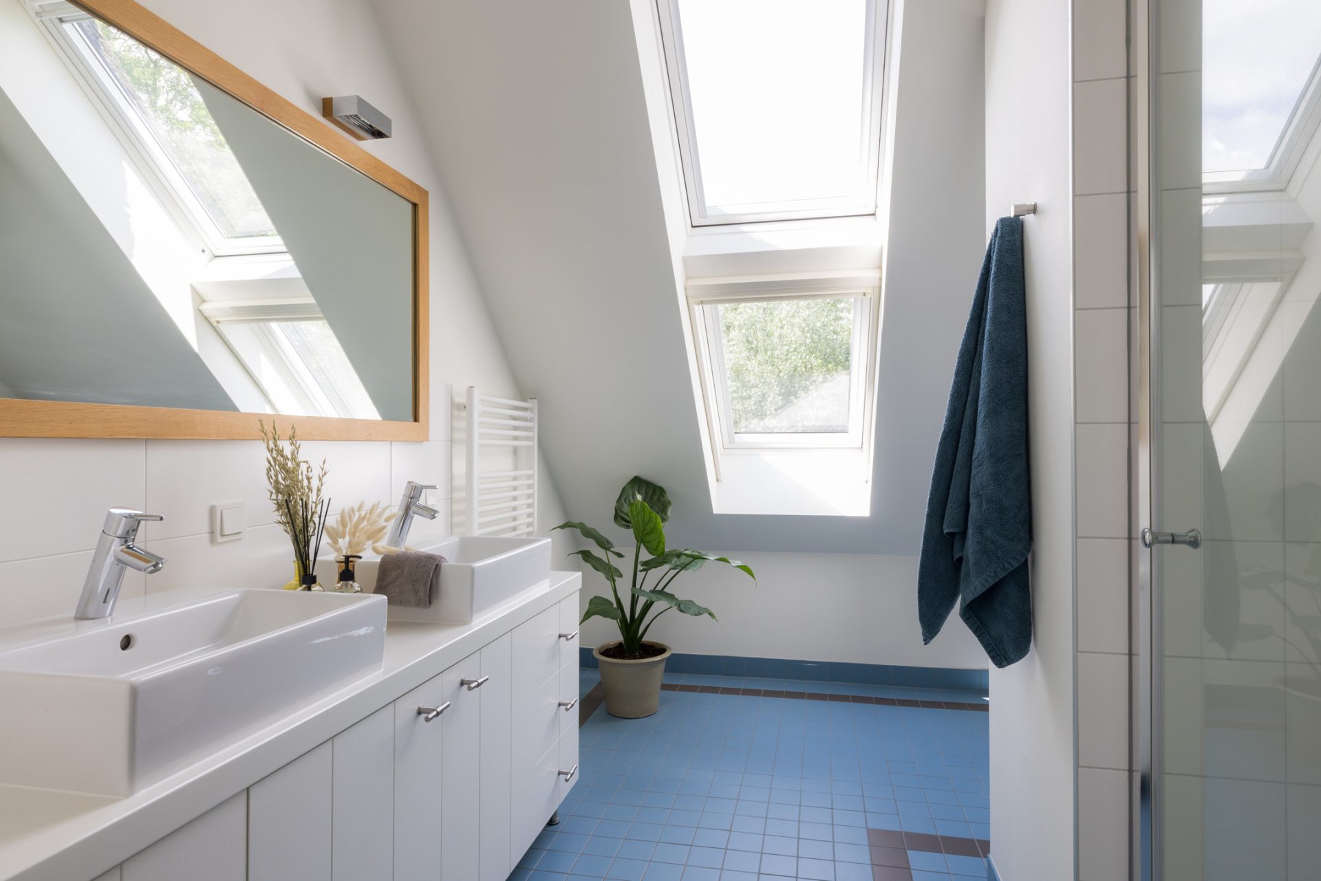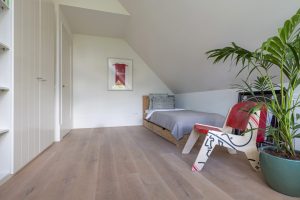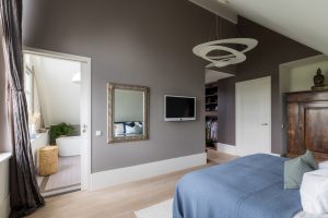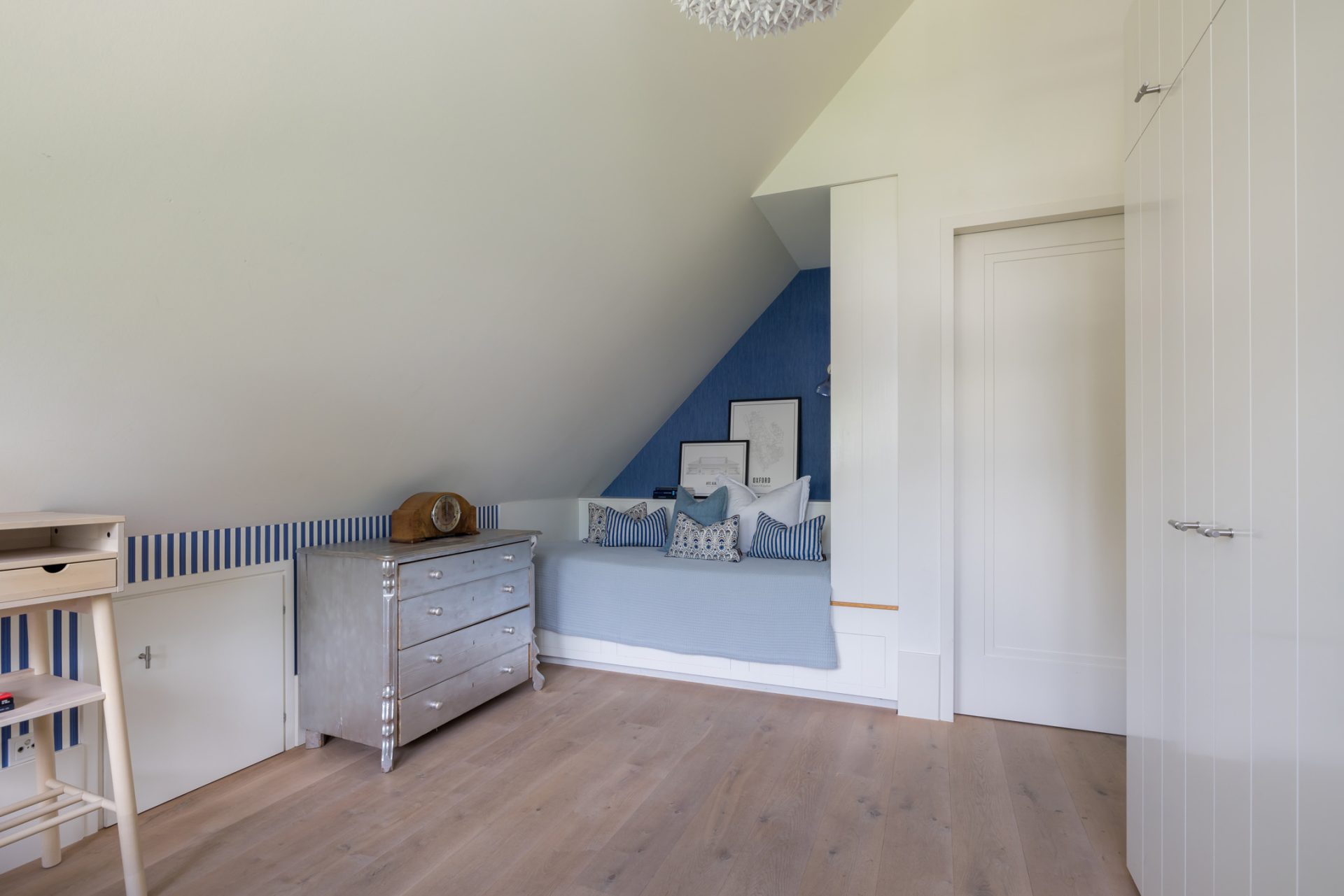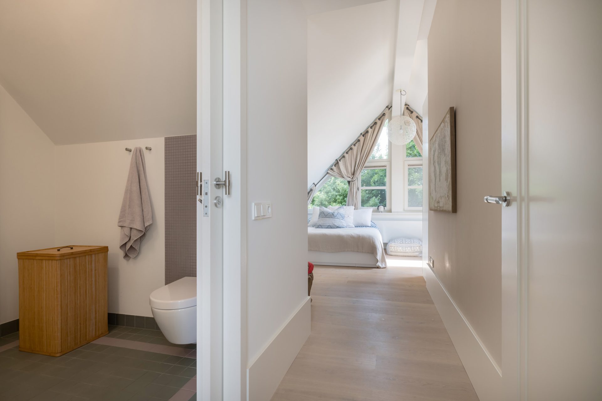Volg de trap vanuit de hal naar de eerste verdieping, waar de overloop met 4 grote dakramen een fantastische plek met veel lichtinval is. Aan de overloop grenzen vier ruime slaapkamers, waaronder de master bedroom met inloopkast en eigen badkamer. Het uitzicht vanuit de master bedroom is van ongekende schoonheid en de inloopkast is voorzien van een op maat gemaakt interieur. In de badkamer zorgen een vrijstaand bad en dubbele inloopdouche voor veel comfort.
