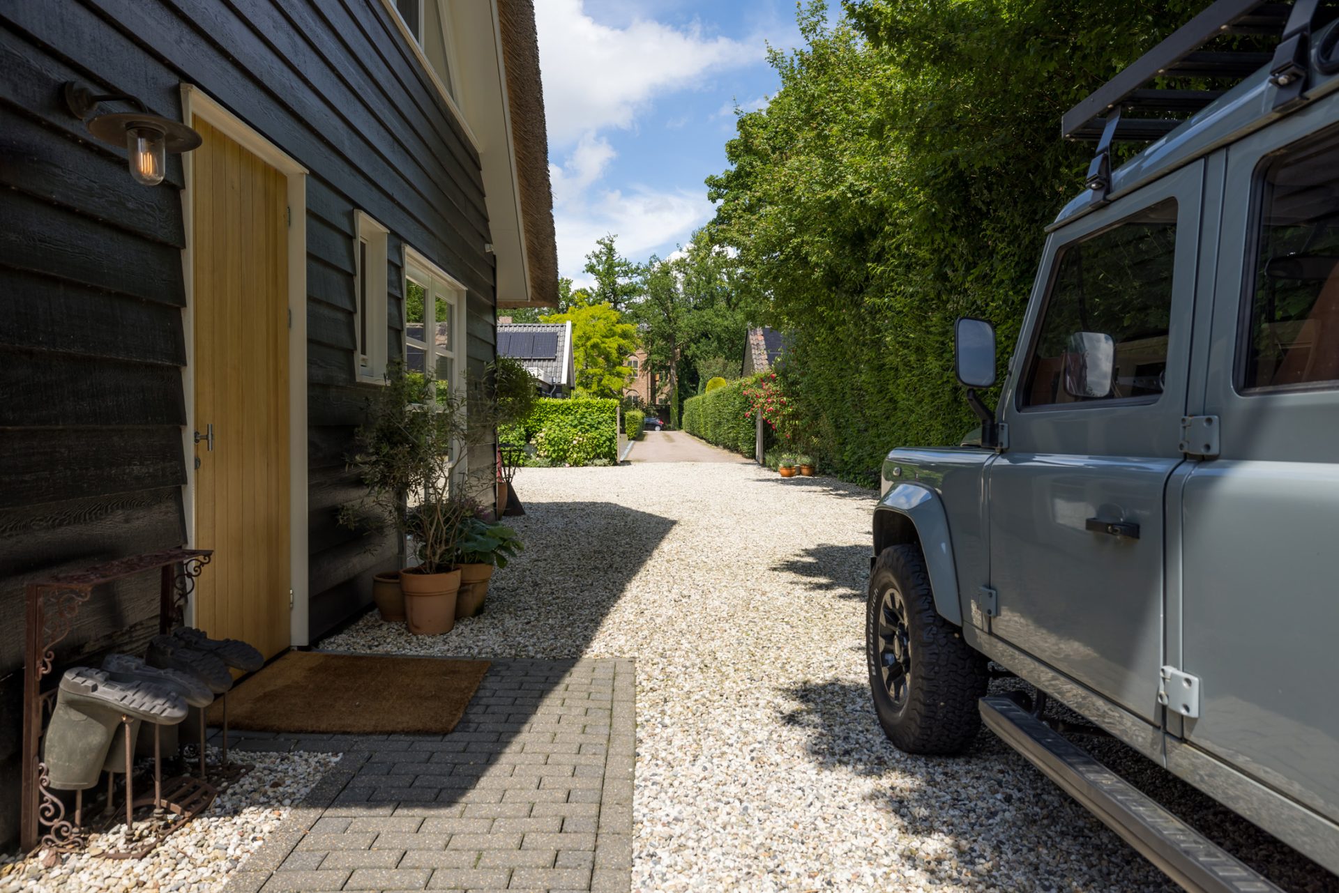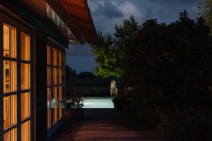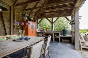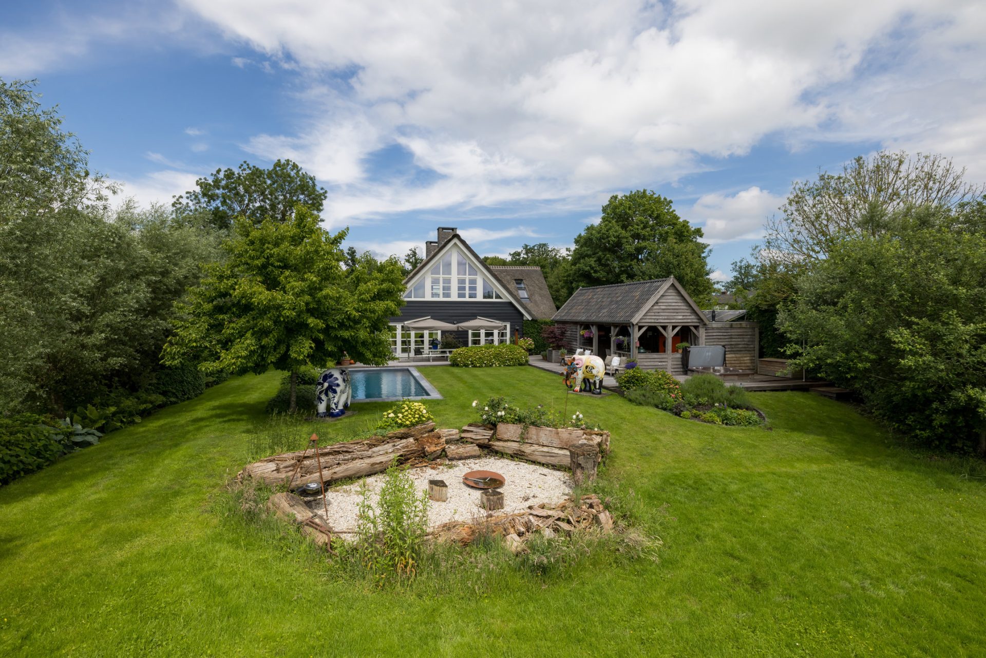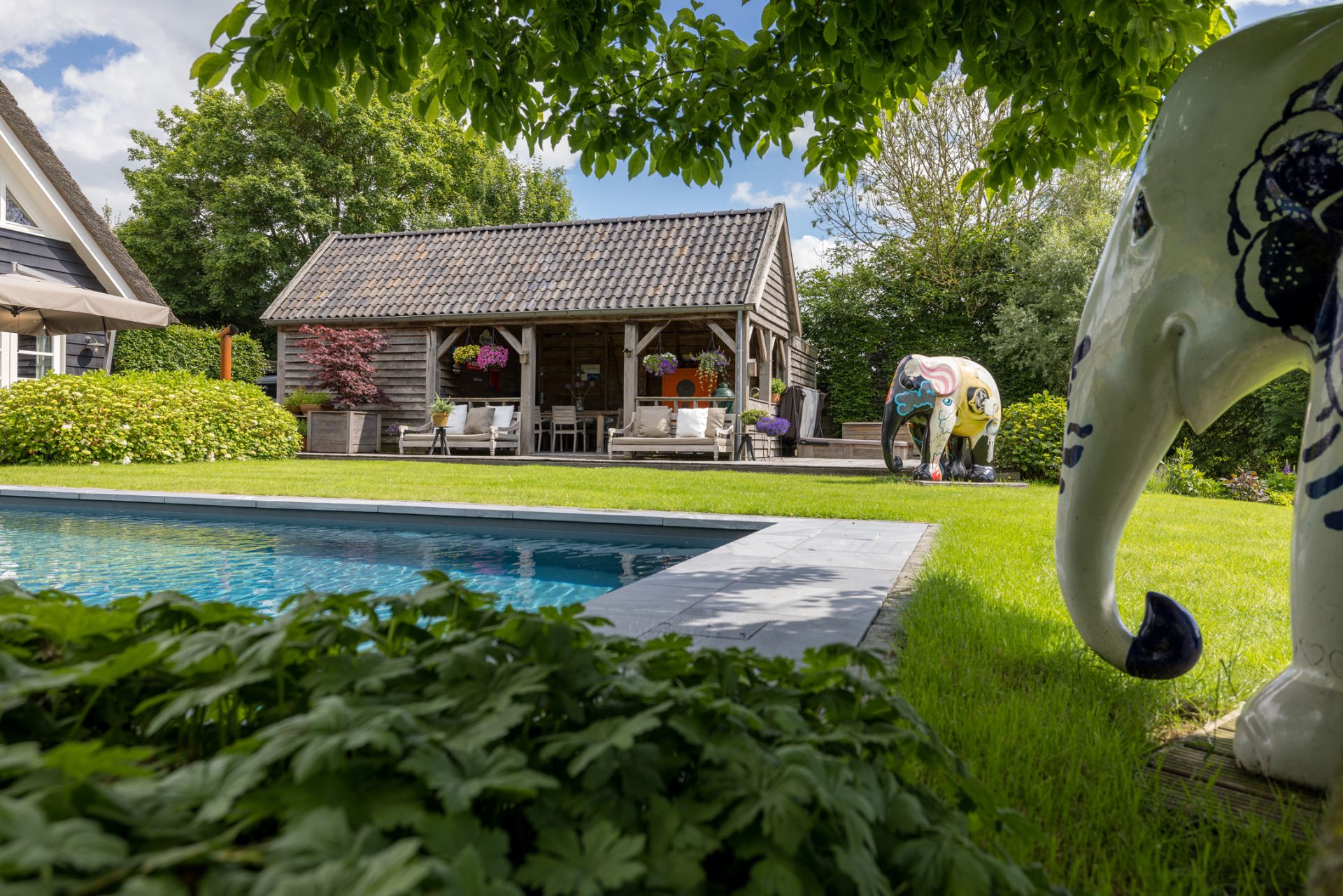 Schuin achter de villa staat een stijlvol, multifunctioneel bijgebouw. De meer dan 7 meter lange carport biedt parkeergelegenheid voor de auto en aan de rechterzijde is een (fietsen)berging met openslaande deuren. Ook is er een afsluitbare ruimte met de opstelling van de zwembadinstallatie. Aan de tuinzijde is een overdekte buitenkeuken, met een fantastisch uitzicht over de graslanden, en een grote eettafel waar reeds vroeg in het jaar heerlijk buiten gegeten kan worden.