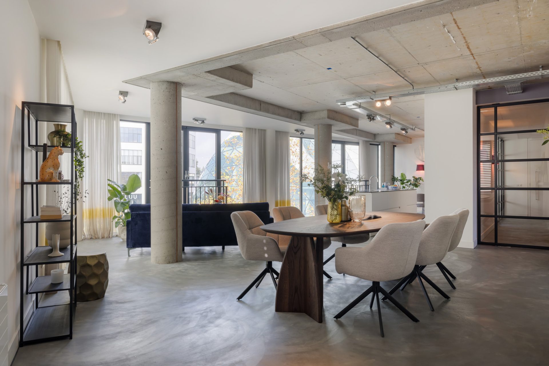 De keuken en woonkamer vormen samen een prachtige leefruimte met een industriële look dankzij het ruwe beton, betonvloer en de stalen elektrakokers. De grote ramen met schuifdeuren aan de voorzijde zorgen voor veel lichtinval en ook aan de achterzijde zijn diverse ramen zichtbaar. Geniet vanaf de bank en de eettafel van het uitzicht naar de Lichttoren, de Admirant en de Blob, drie architectonische iconen van Eindhoven. Aan de achterzijde is de intieme tv-hoek die naar wens getransformeerd kan worden in twee slaap-/werkkamers.