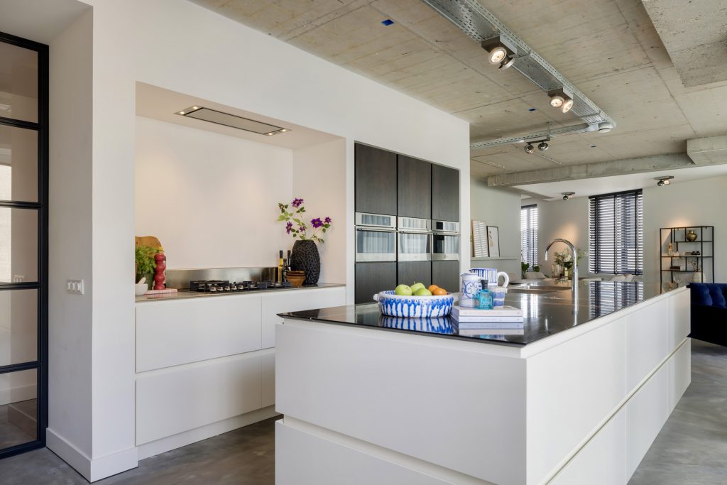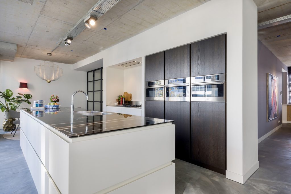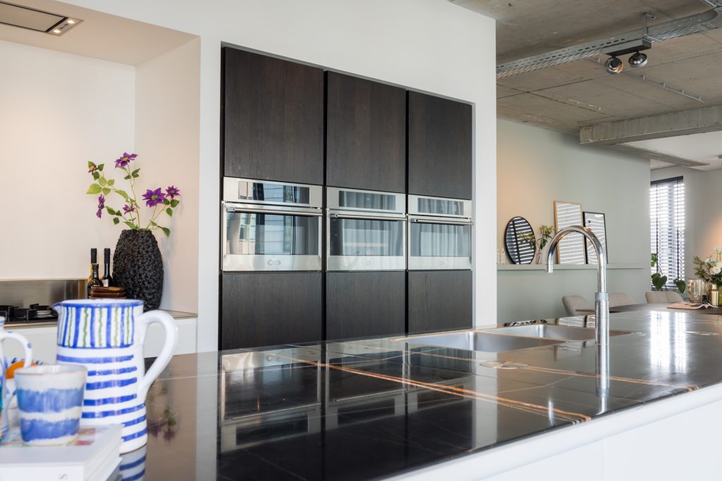 Voor kookliefhebbers is de op maat gemaakte eilandkeuken met apparatenwand een lust voor het oog. Het prachtige blad van marmer vormt een stijlvolle combinatie met de brede, witte lades en de hoge, donkere kasten. Alle denkbare apparatuur van gerenommeerde merken is ingebouwd en in de woonkamer zijn twee inpandige bergingen ten behoeve van opslag.