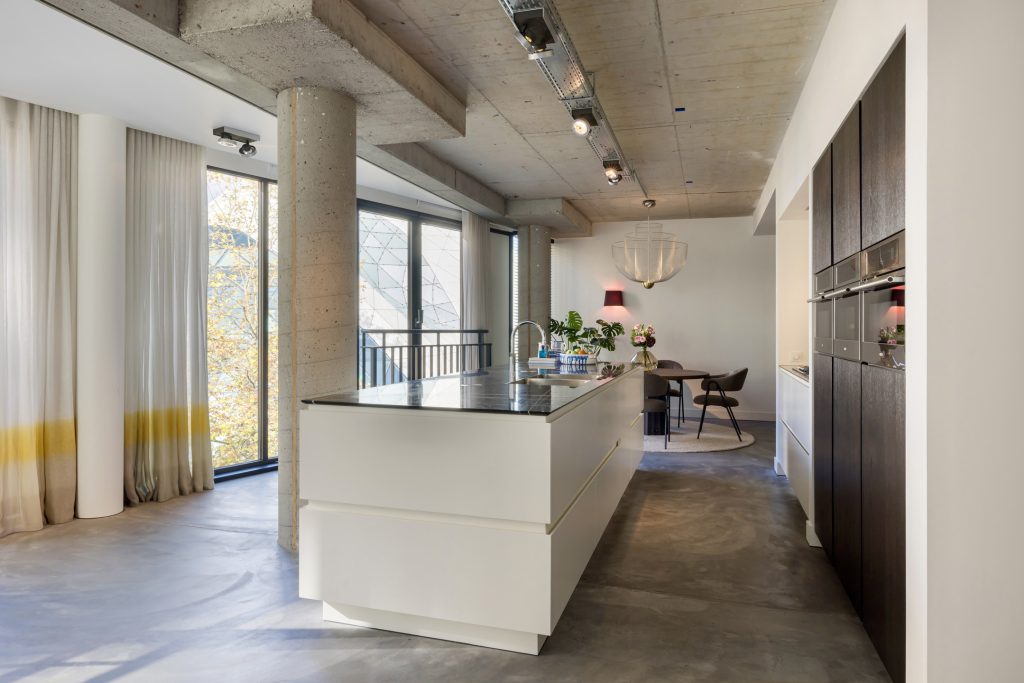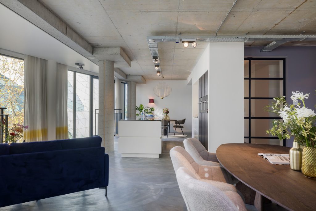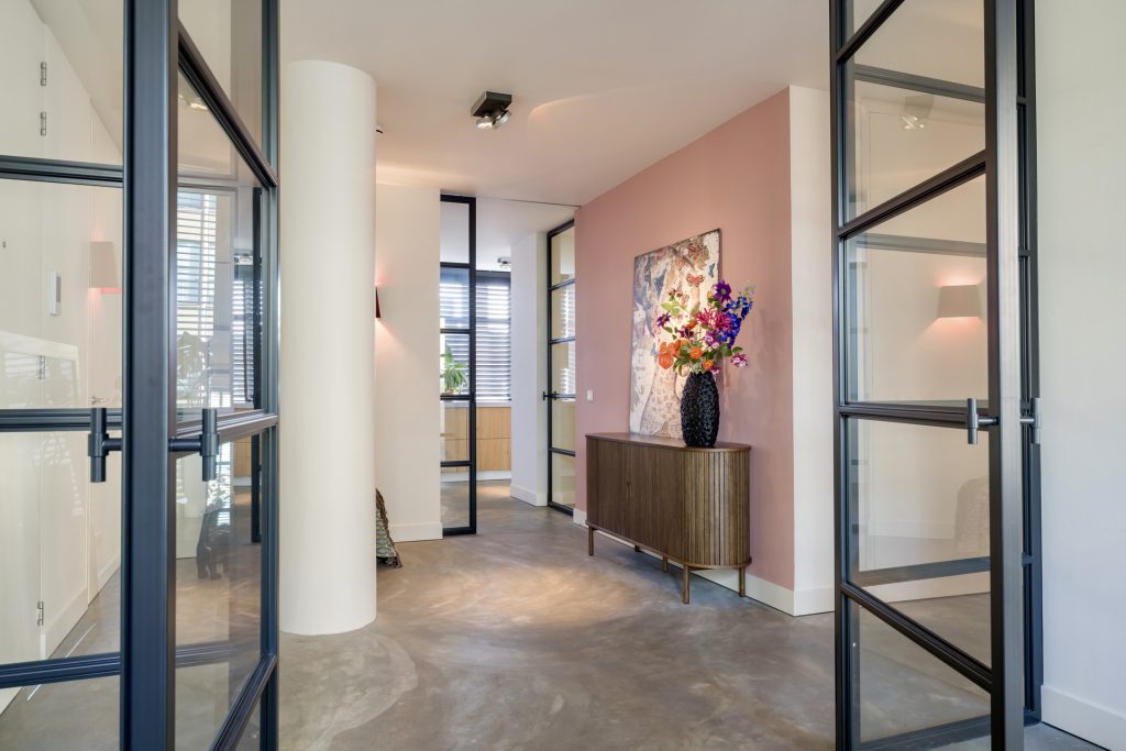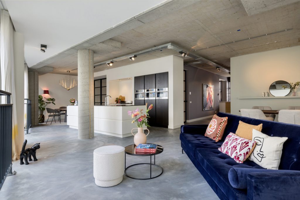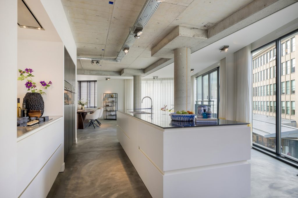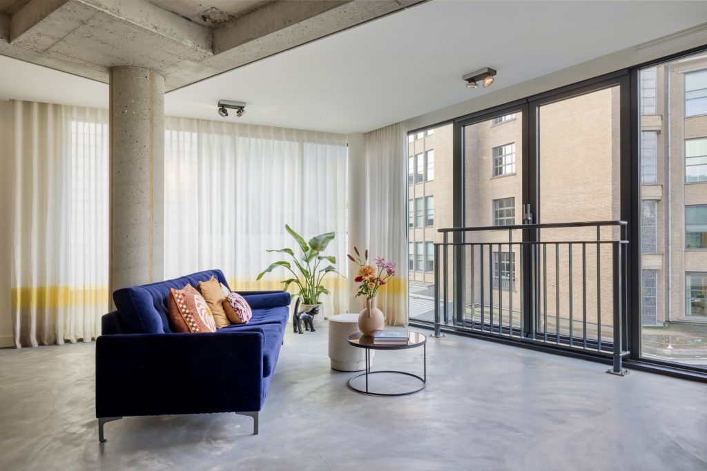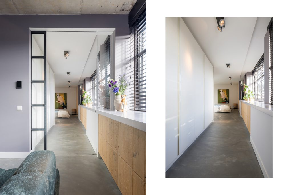 Het loftappartement is gesitueerd op de derde verdieping, direct onder het penthouse. Vanuit de grote ontvangsthal zijn de woonkamer, keuken, gastentoilet, meterkast en de slaapkamer te bereiken. De gestucte muren, de stoere betonvloer en de stalen pui met openslaande deuren zorgen voor een uitnodigende ambiance. Links van de woonkamerdeur is de garderobe waardoor jassen en tassen geen storend element vormen.