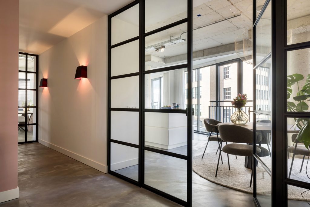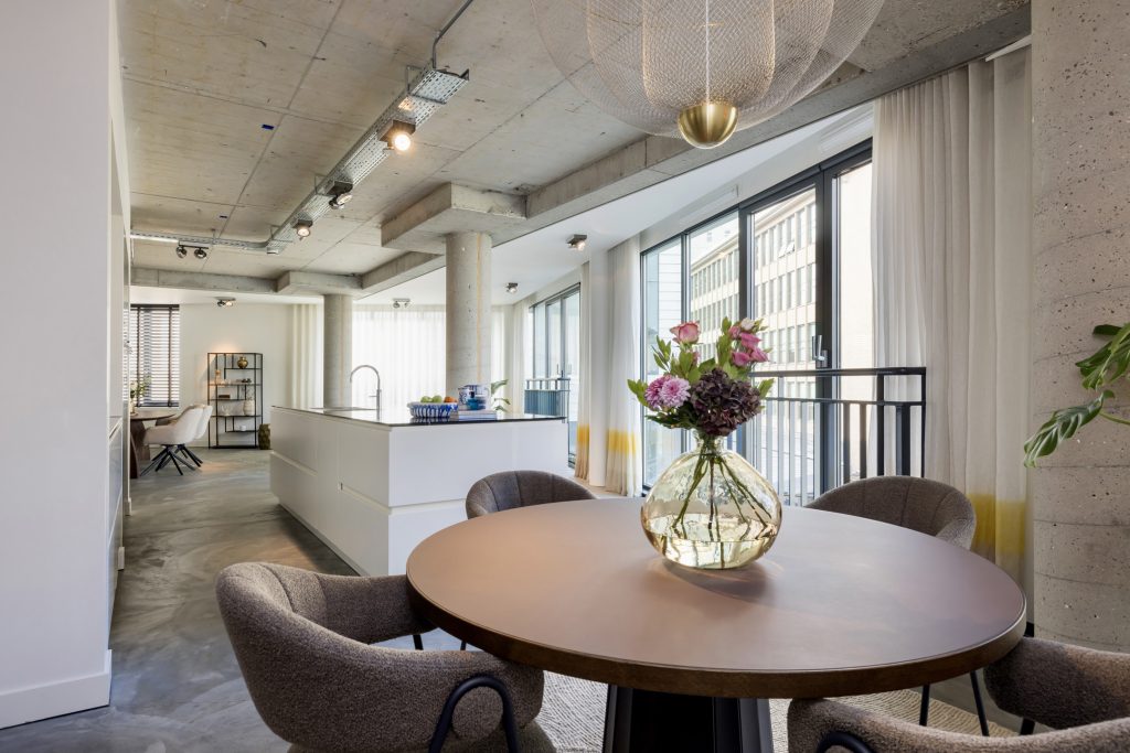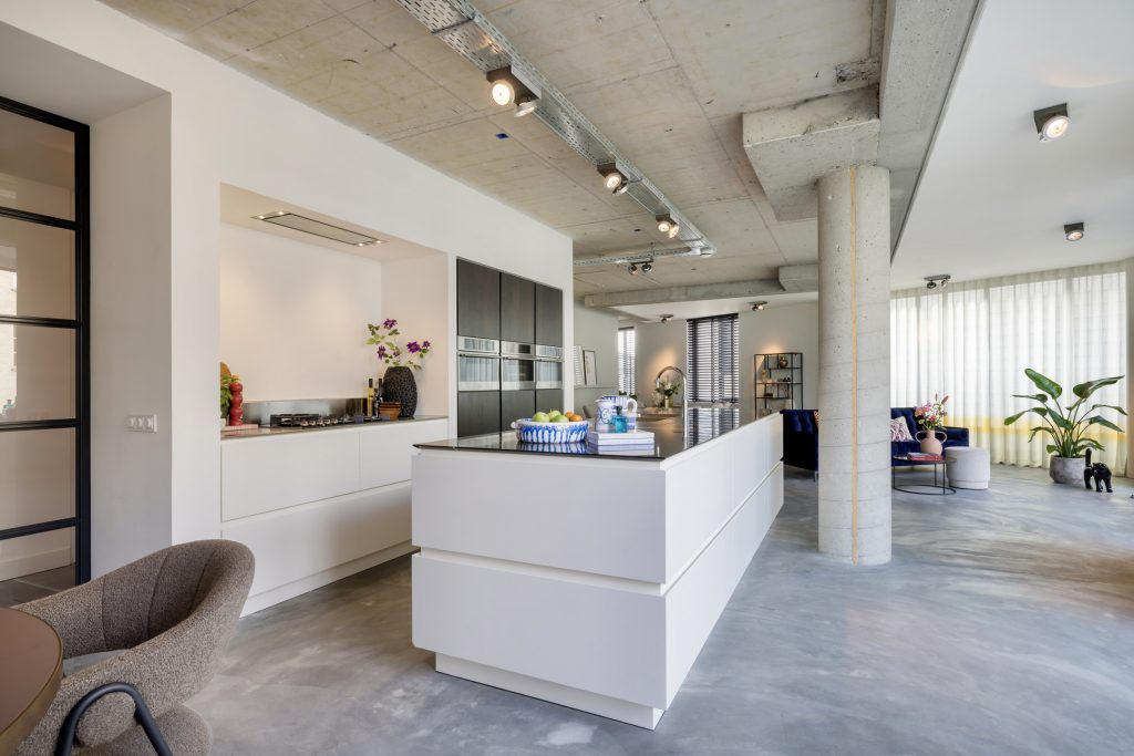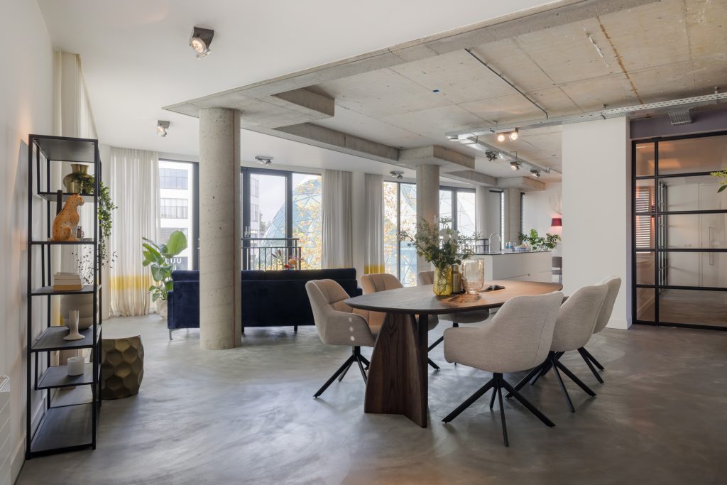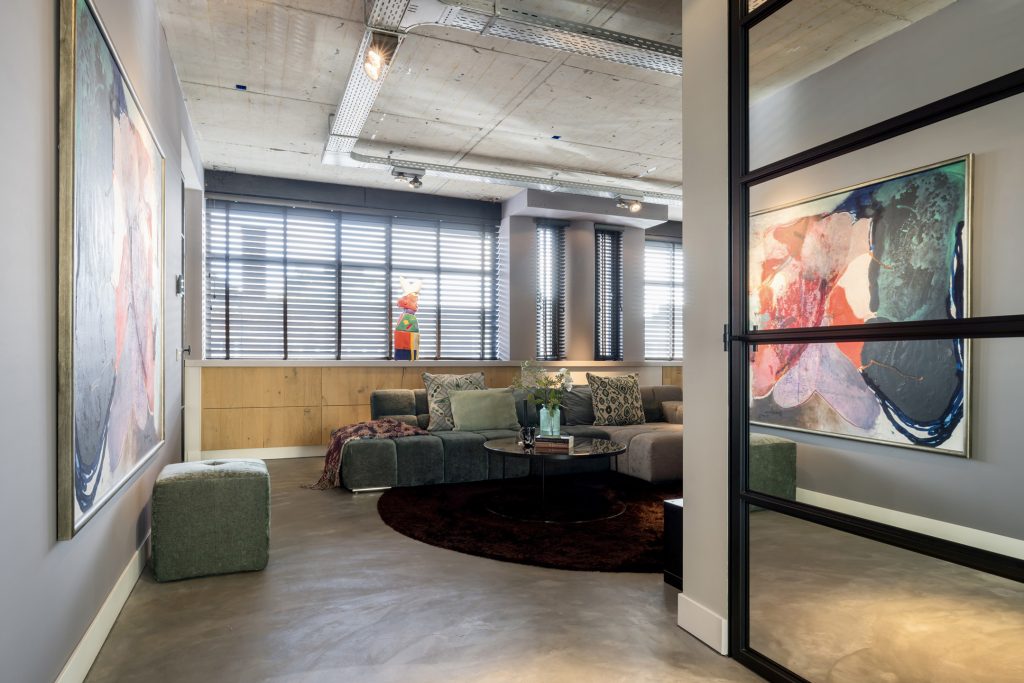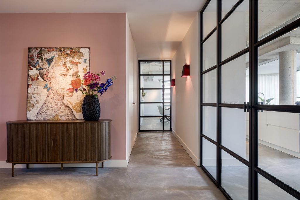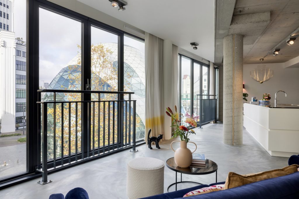 Het loftappartement is gesitueerd op de derde verdieping, direct onder het penthouse. Vanuit de grote ontvangsthal zijn de woonkamer, keuken, gastentoilet, meterkast en de slaapkamer te bereiken. De gestucte muren, de stoere betonvloer en de stalen pui met openslaande deuren zorgen voor een uitnodigende ambiance. Links van de woonkamerdeur is de garderobe waardoor jassen en tassen geen storend element vormen.