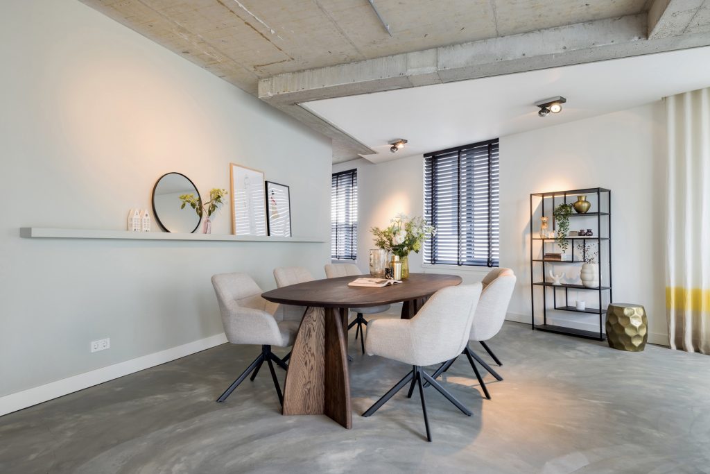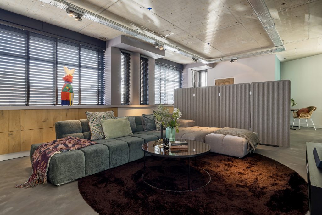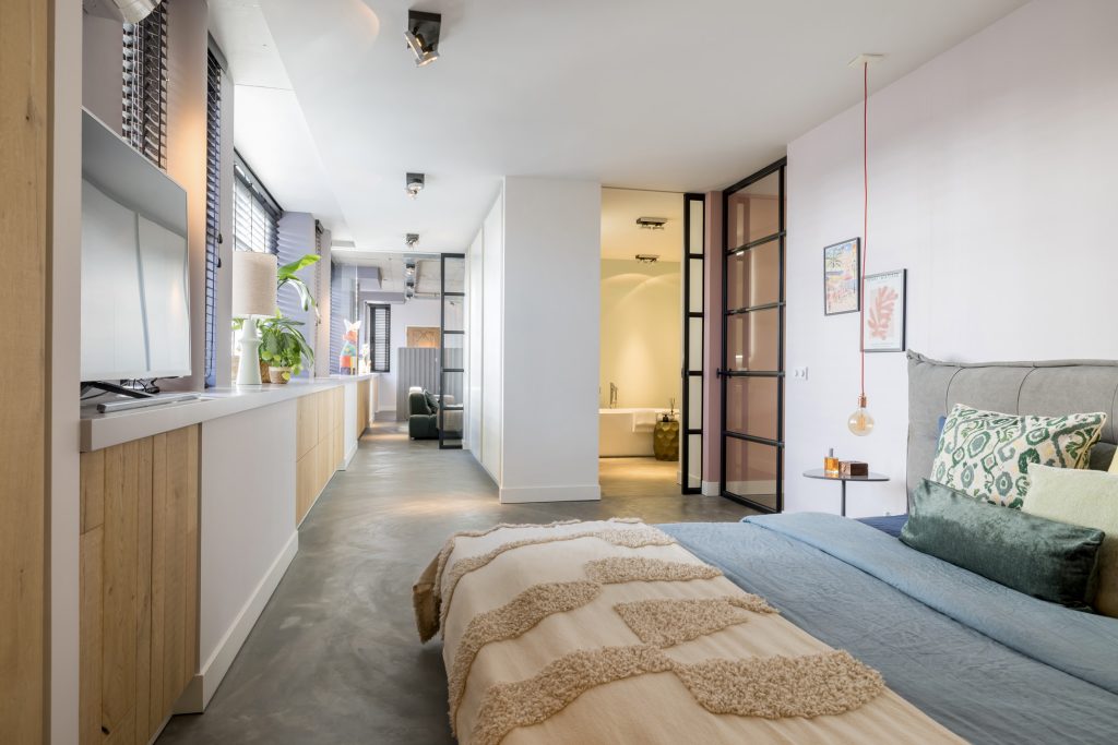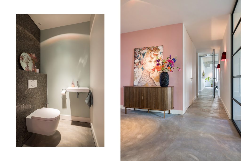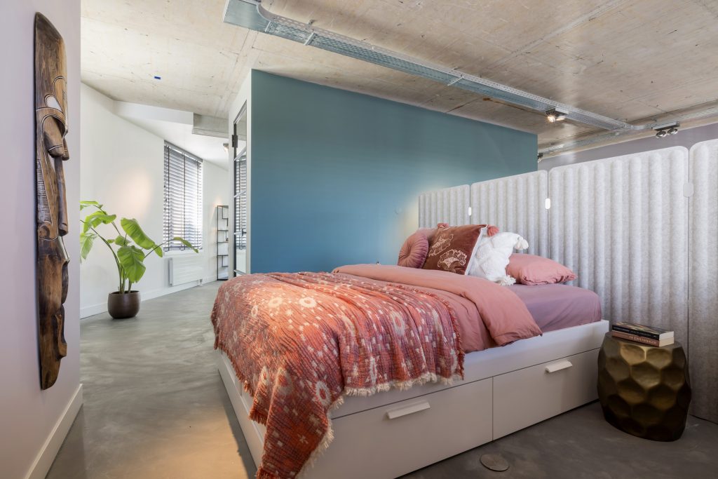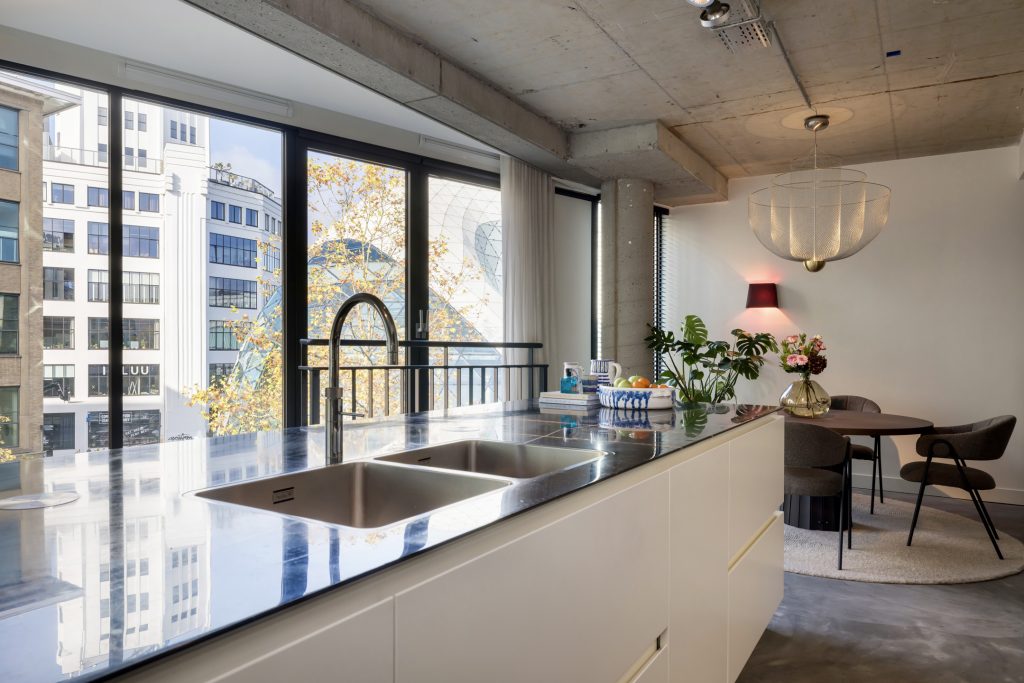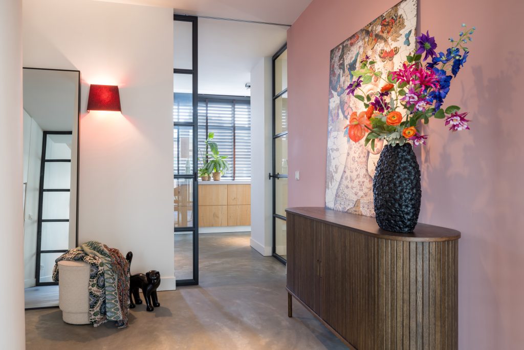 Het loftappartement is gesitueerd op de derde verdieping, direct onder het penthouse. Vanuit de grote ontvangsthal zijn de woonkamer, keuken, gastentoilet, meterkast en de slaapkamer te bereiken. De gestucte muren, de stoere betonvloer en de stalen pui met openslaande deuren zorgen voor een uitnodigende ambiance. Links van de woonkamerdeur is de garderobe waardoor jassen en tassen geen storend element vormen.