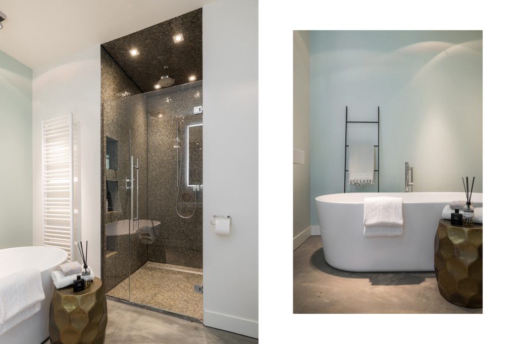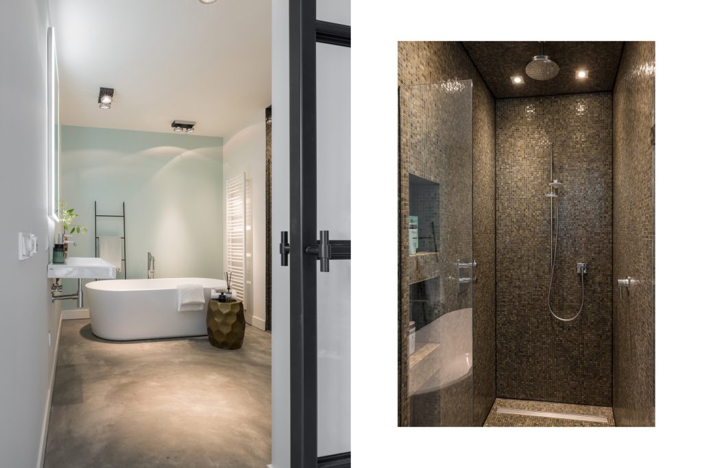 Achter de zwarte, stalen, glazen schuifdeur is de luxe badkamer gesitueerd. De ruimte is ingedeeld met een vrijstaand bad, inloopdouche, tweede toilet en een brede wastafel. Over ieder detail is nagedacht: de verlichting, het fijne stucwerk, de glans van de mozaïekstenen in de douche en het sanitair van topkwaliteit.