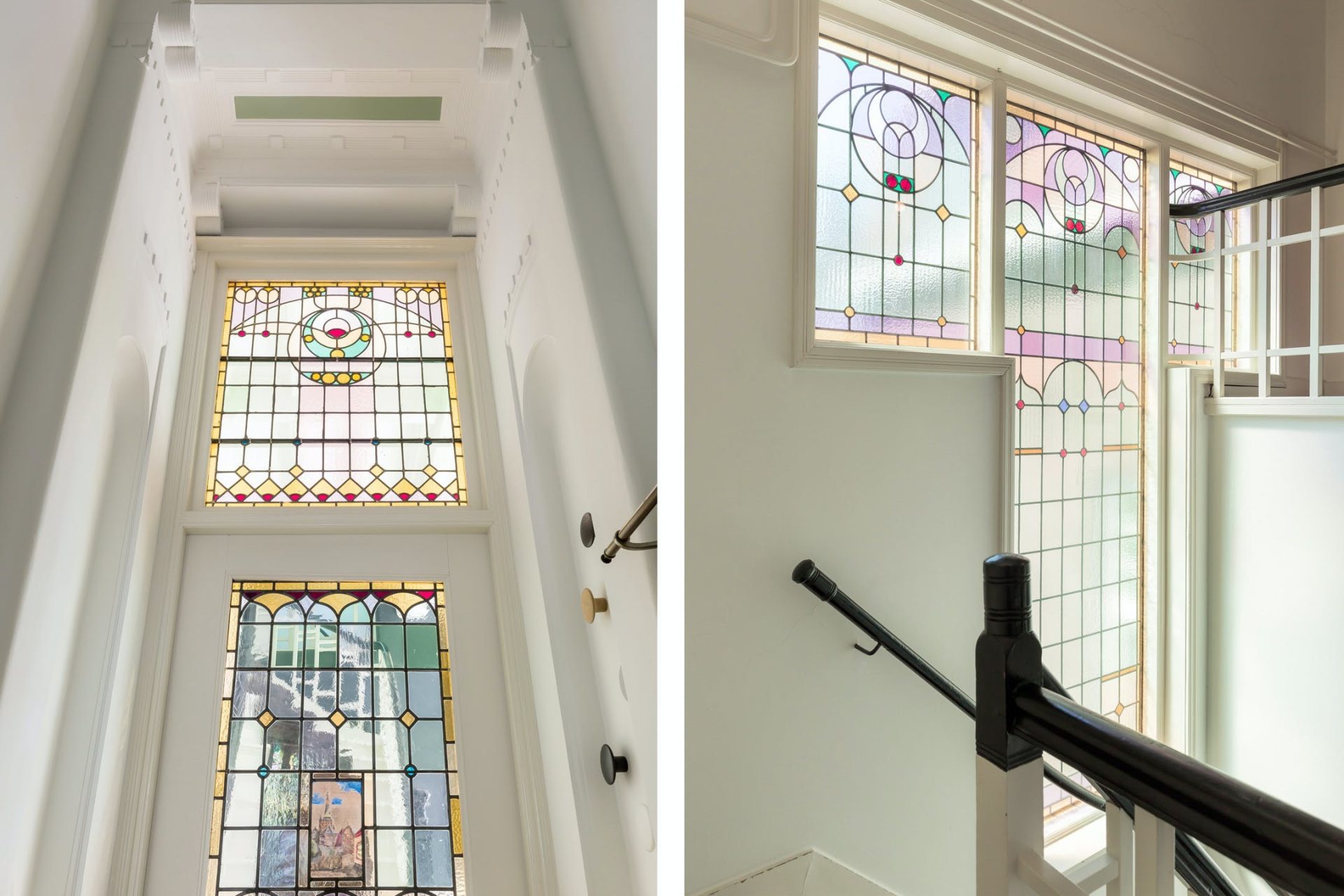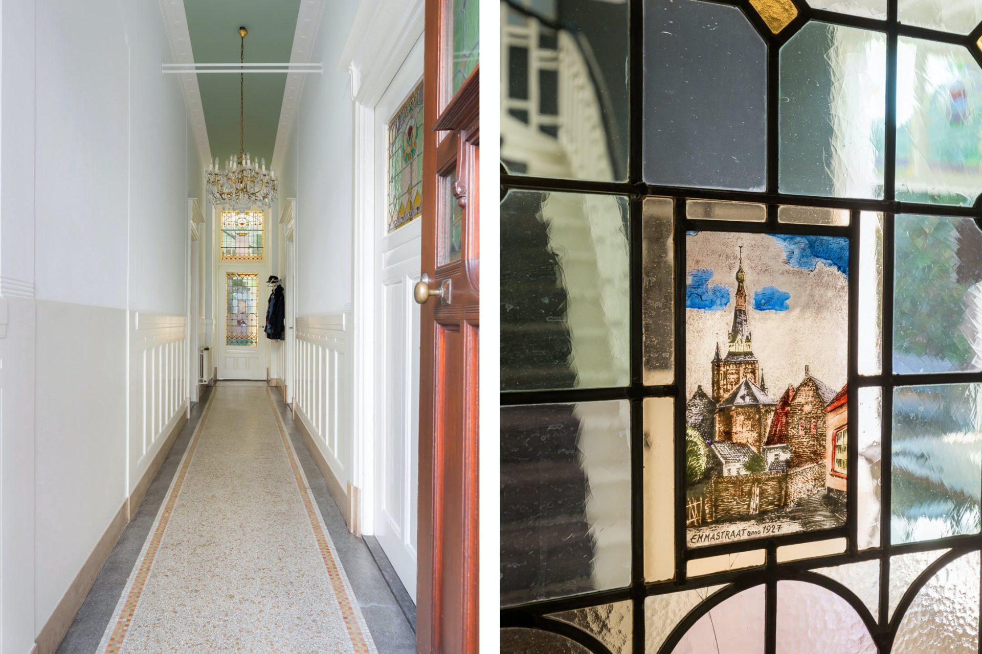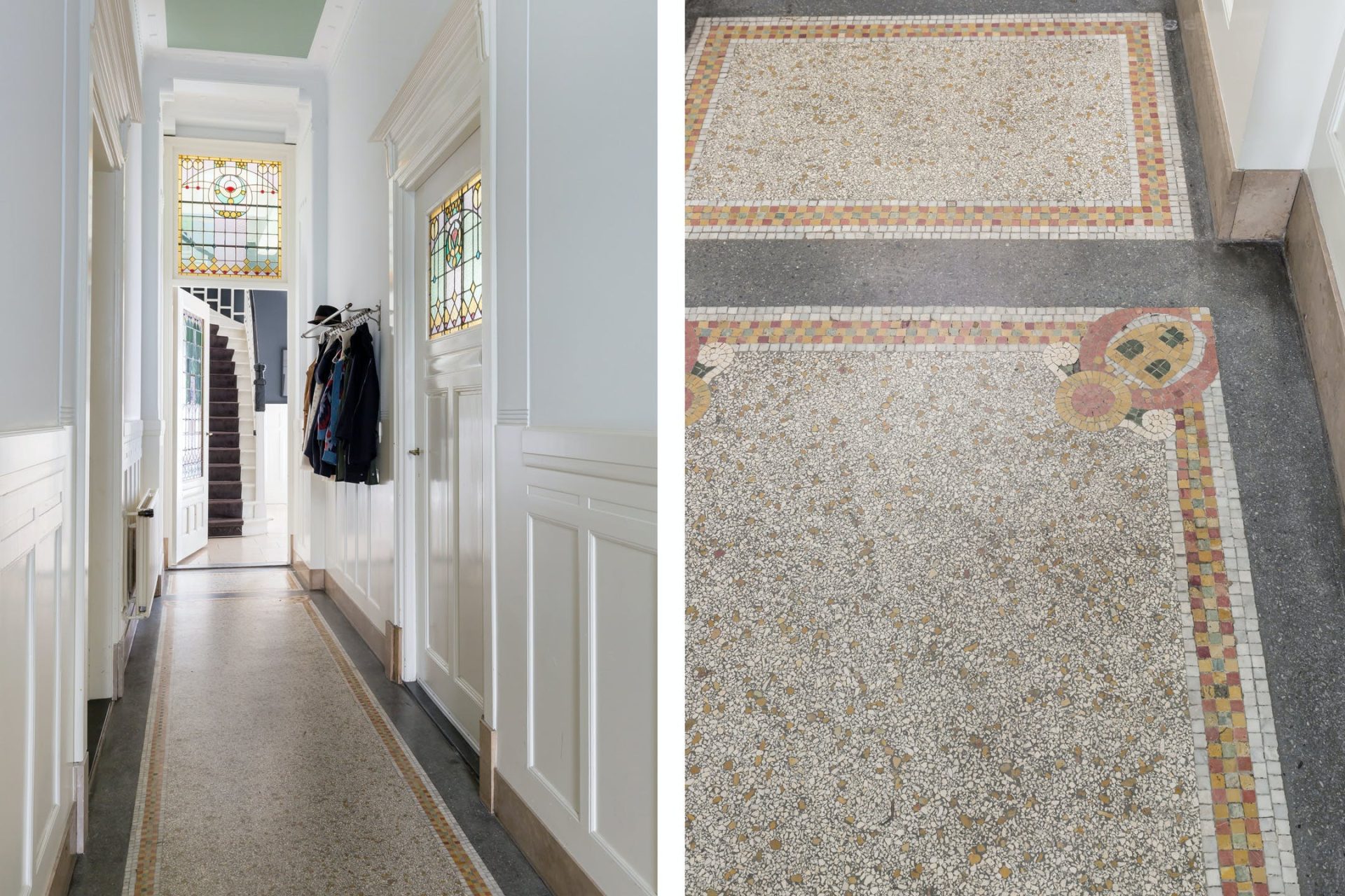 Bij de rondboogportiek, die wordt gedeeld met huisnummer 8, zie je de deuren naar de hal en de deur naar het dienstportaal. De hardhouten deuren en grote glas-in-loodramen zorgen voor de sfeer uit het begin van de vorige eeuw. Vanuit de lange hal met het hoge plafond, prachtige deuren en de originele terrazzovloer zijn de woonkamer en eetkamer te bereiken. Via de linker voordeur komt men in de dienstingang die doorloopt tot de speel-/werkkamer.