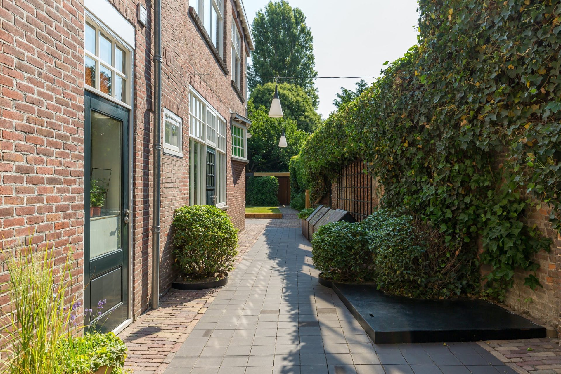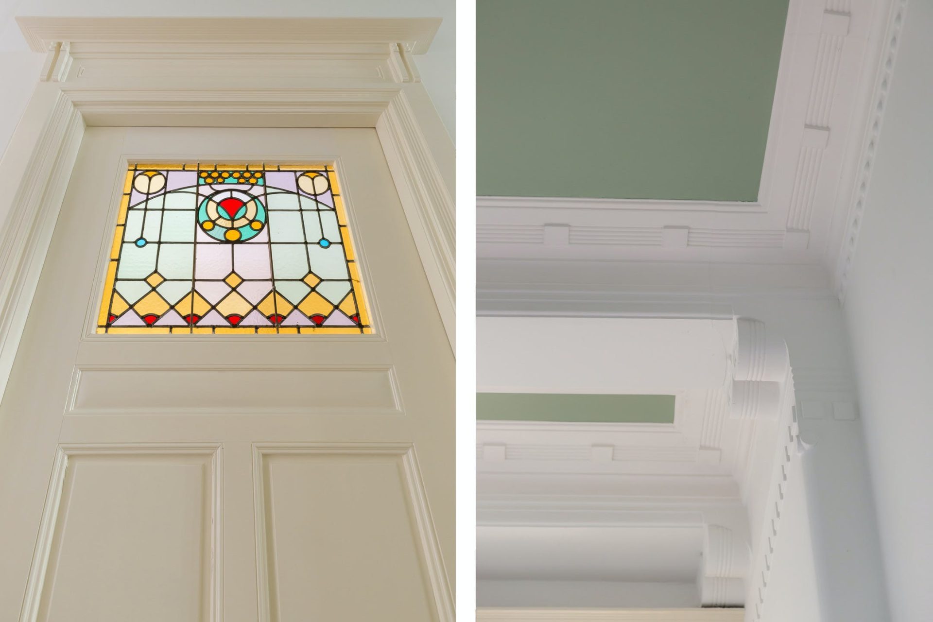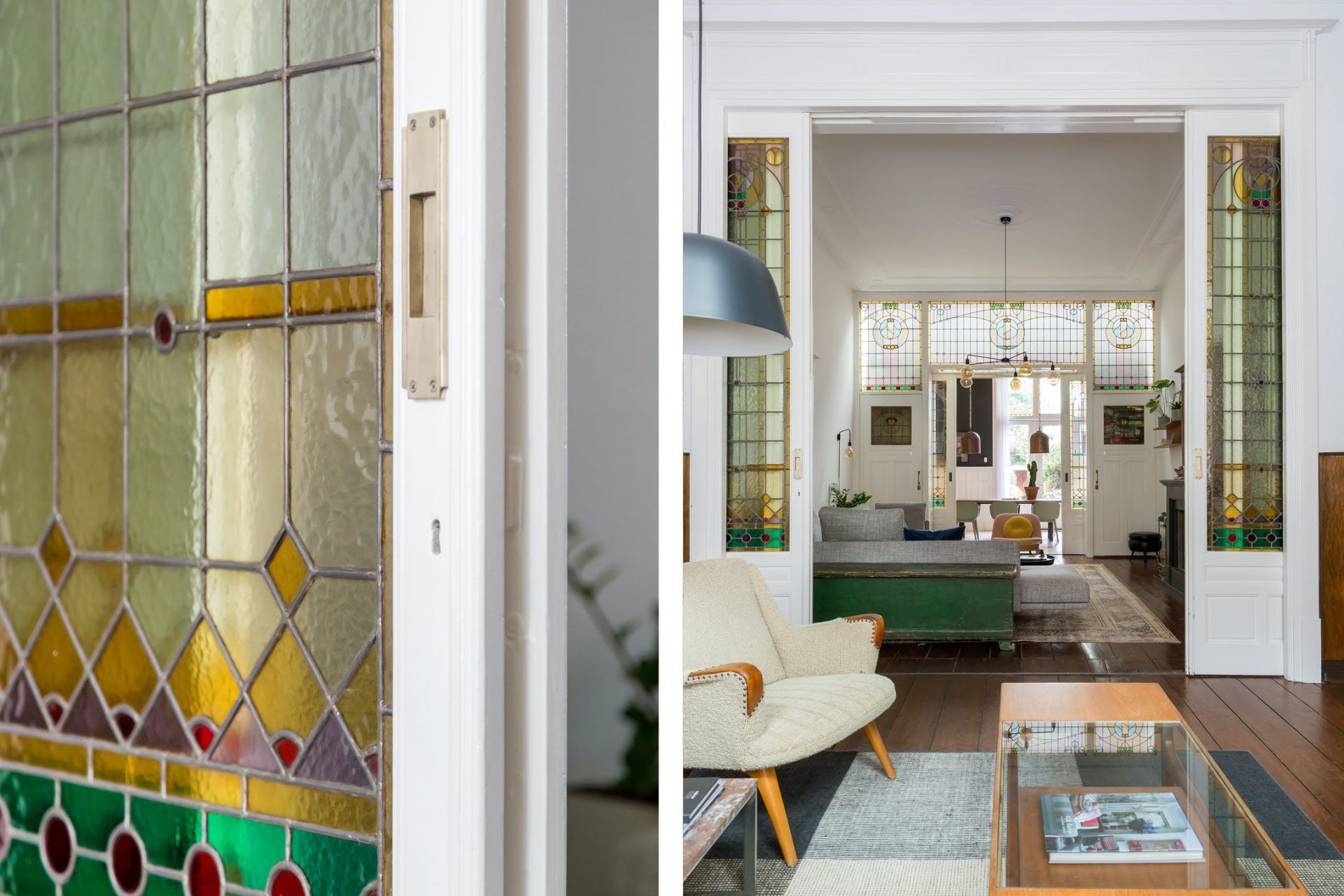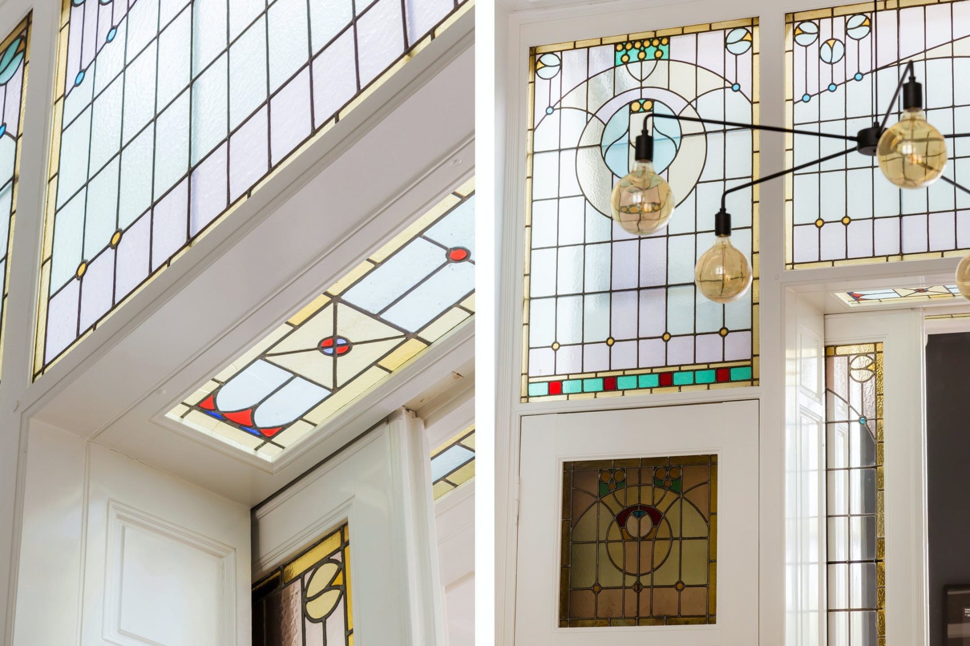 Bij de rondboogportiek, die wordt gedeeld met huisnummer 8, zie je de deuren naar de hal en de deur naar het dienstportaal. De hardhouten deuren en grote glas-in-loodramen zorgen voor de sfeer uit het begin van de vorige eeuw. Vanuit de lange hal met het hoge plafond, prachtige deuren en de originele terrazzovloer zijn de woonkamer en eetkamer te bereiken. Via de linker voordeur komt men in de dienstingang die doorloopt tot de speel-/werkkamer.