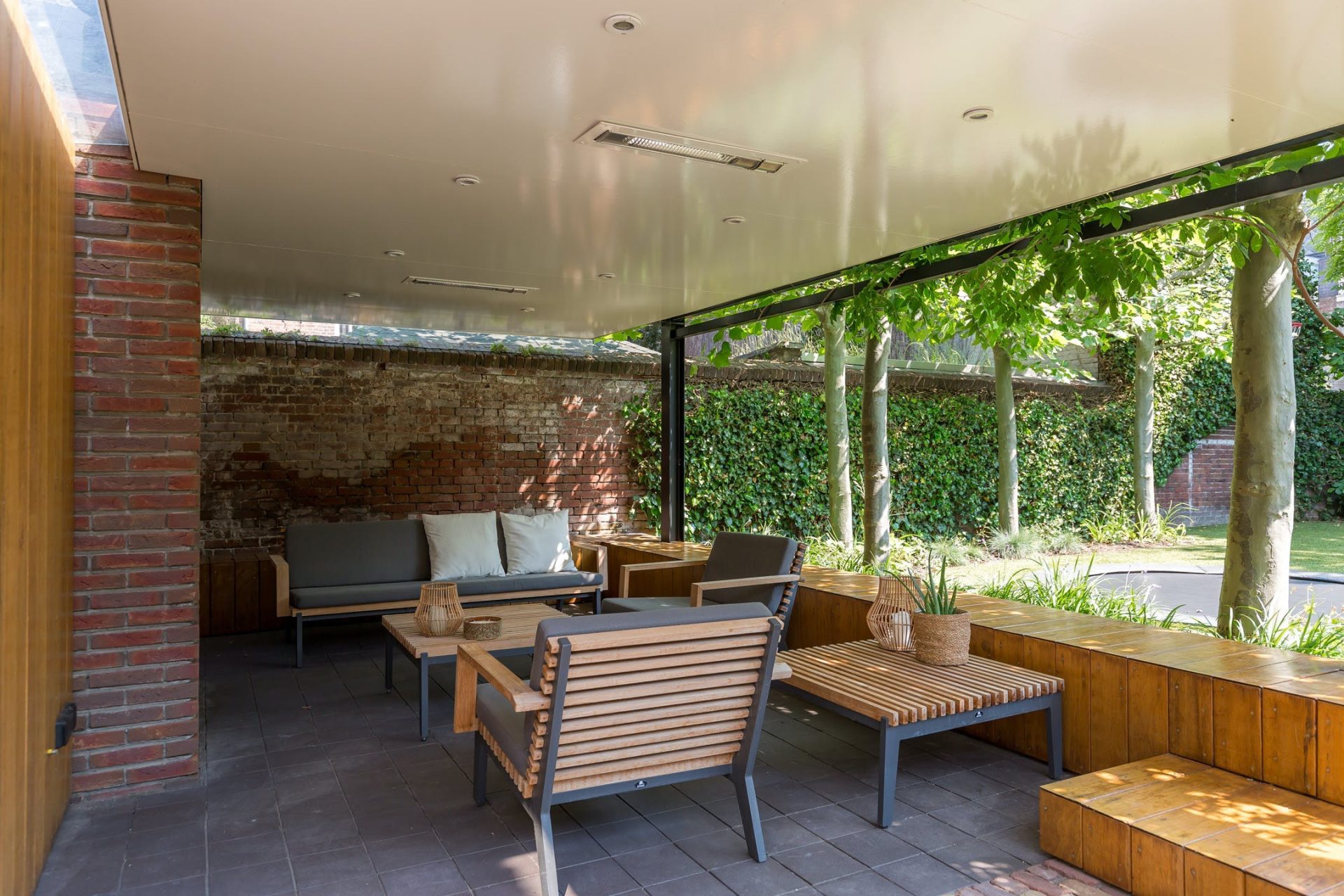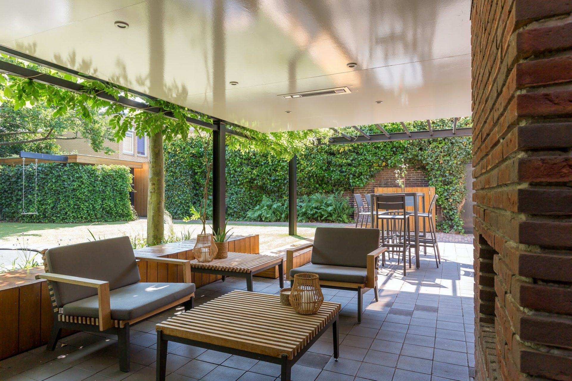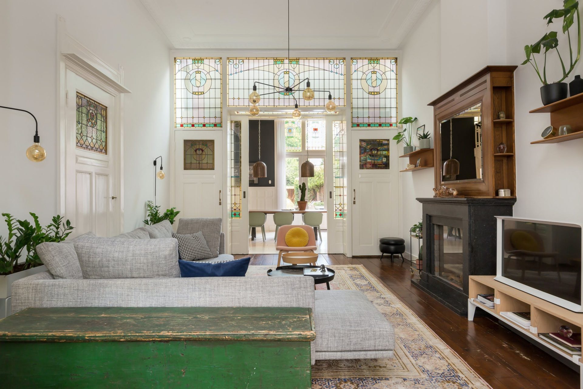 De woonkamer is een statige leefruimte met een dubbele en-suite en veel lichtinval door de hoge ramen. In de voorkamer zie je de schouw met kachel, op maat gemaakte kasten en een prachtig ornamentenplafond. Via de schuifdeuren met glas-in-lood kom je in de tv-kamer met een marmeren schouw, gashaard en stijlvolle vaste kasten. De derde kamer, ingericht als eetkamer, is een heerlijke plek om te genieten van een diner in een stijlvolle ambiance. Openslaande deuren geven toegang tot de tuin en de originele schouw met open haard past perfect in deze ruimte.