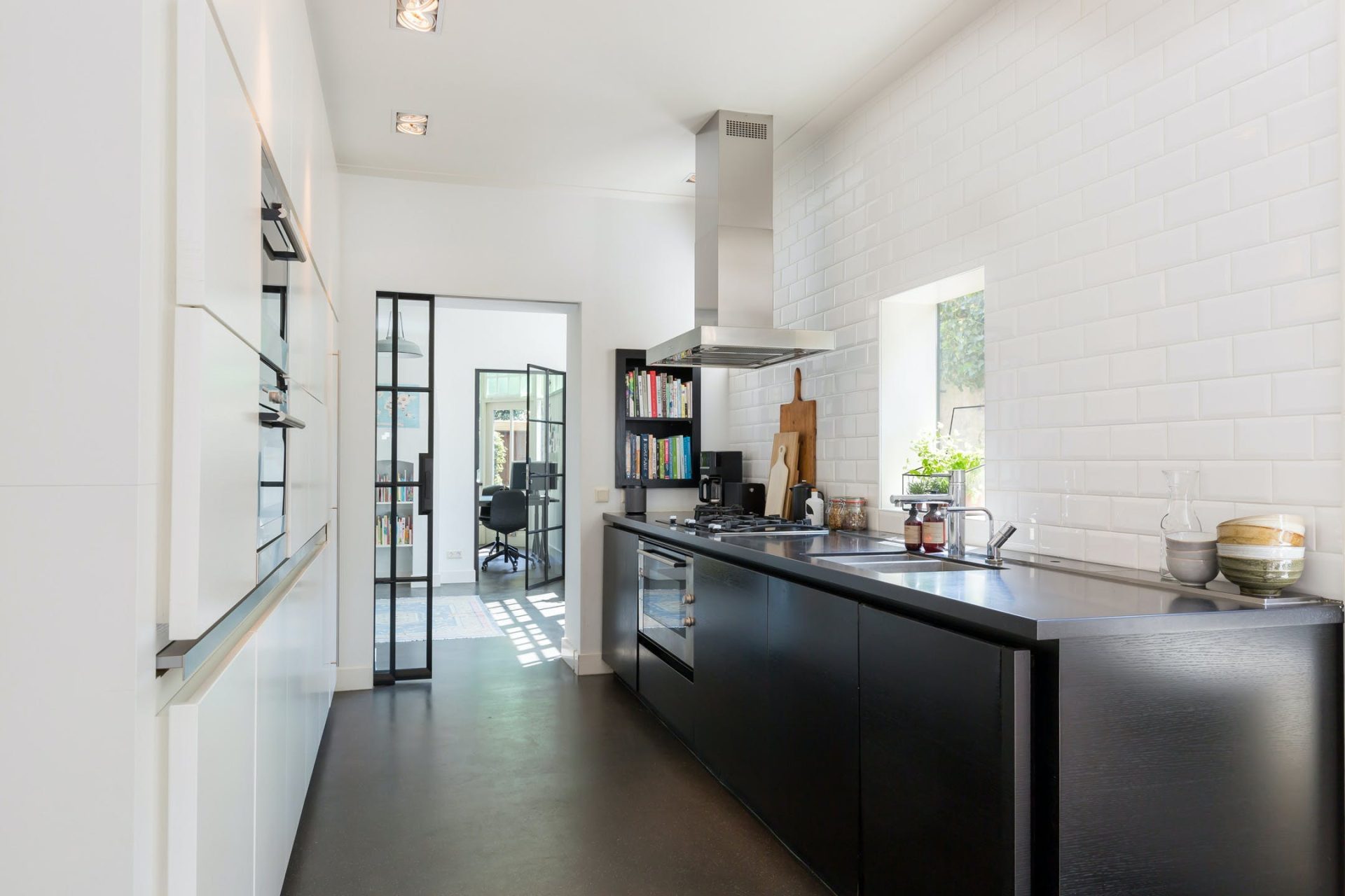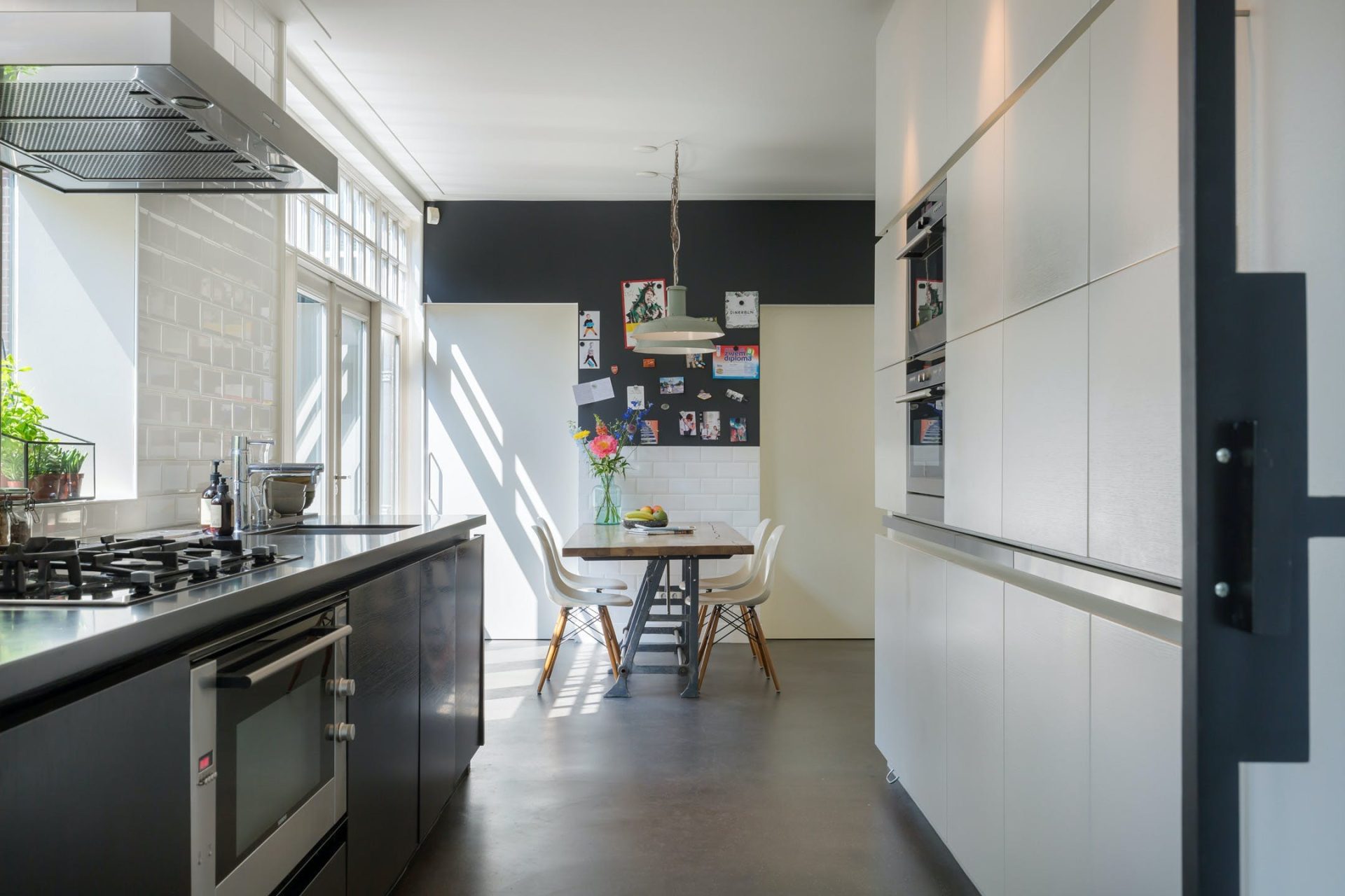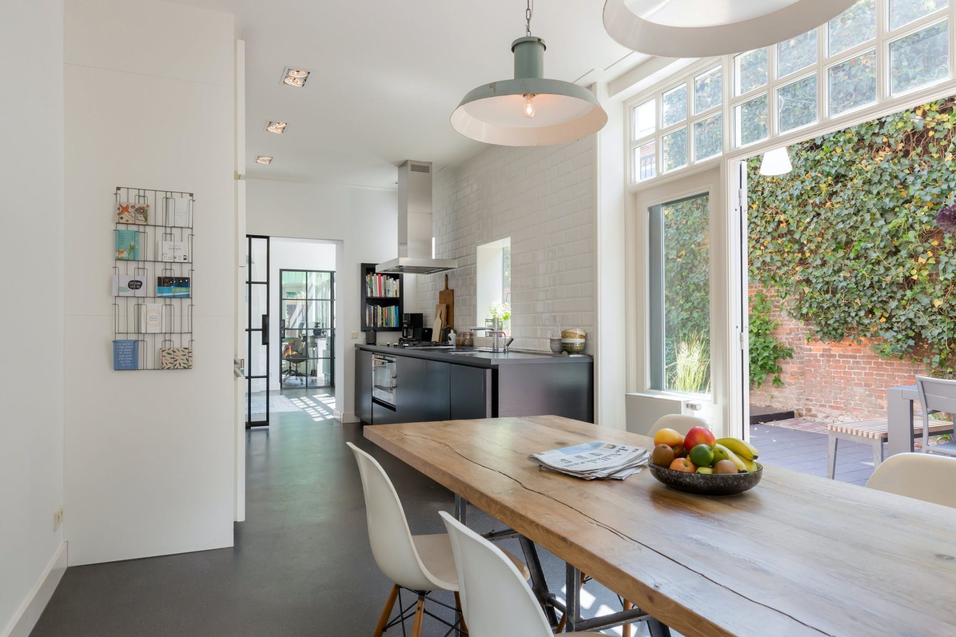 De woonkeuken is een moderne en lichte ruimte met openslaande deuren naar de tuin en een gietvloer met vloerverwarming. De op maat gemaakte keukenopstelling biedt veel bergruimte, drie uitschuifbare werkbladen aan de linkerzijde en alle benodigde apparatuur van topkwaliteit. Ook zie je, naast de eettafel, de diensttrap naar de eerste verdieping.