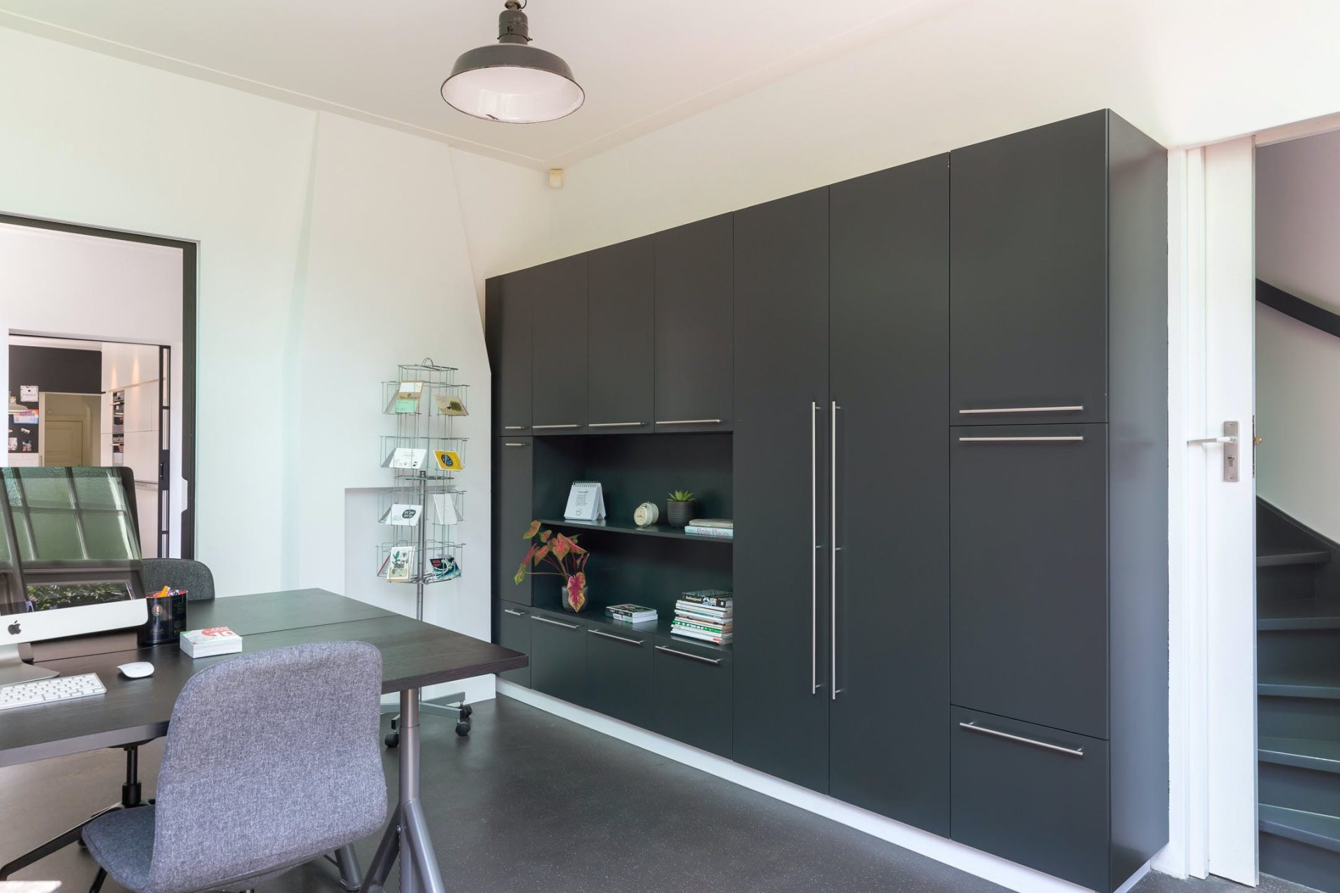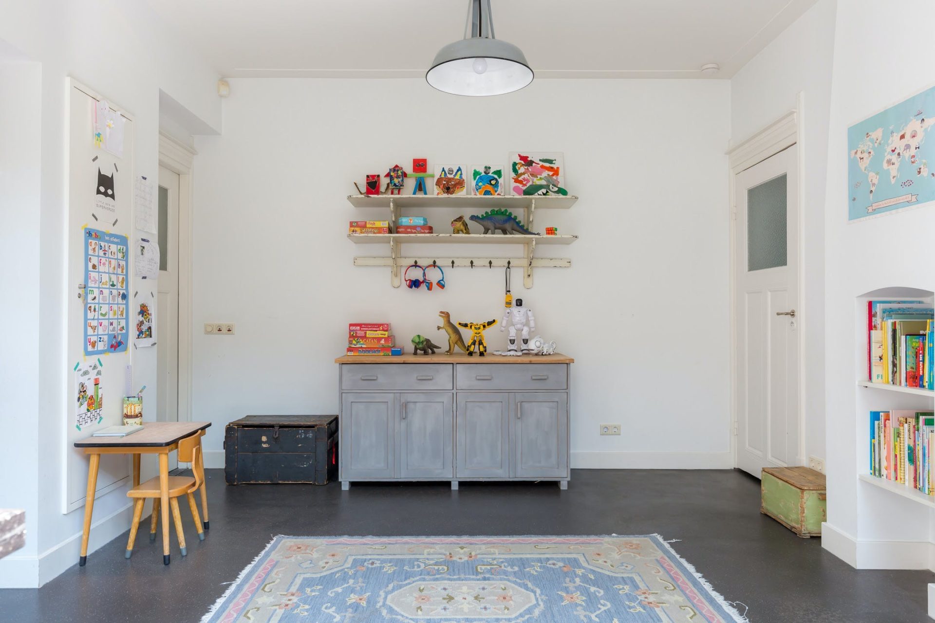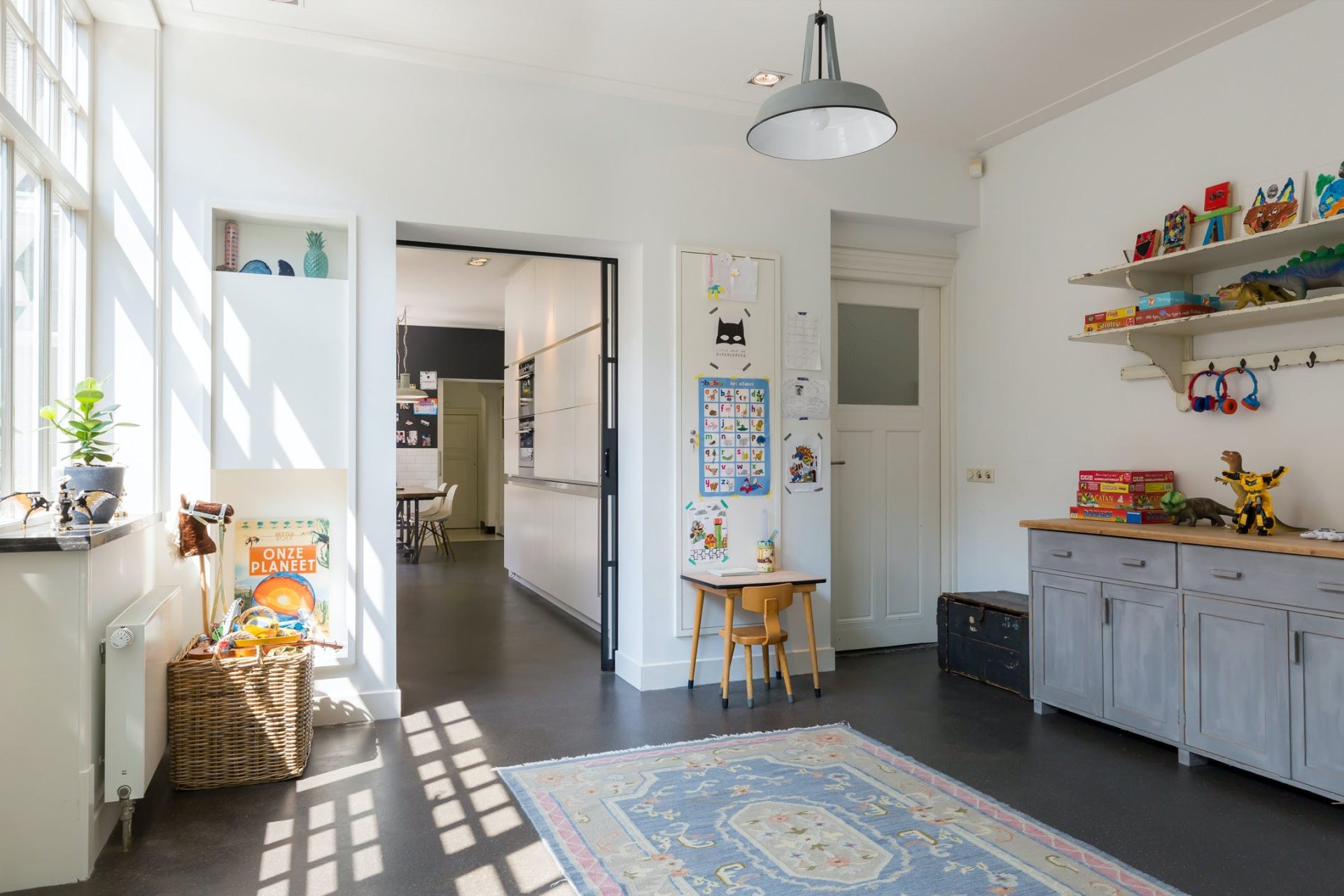De zwarte schuifdeur met glas verbindt de woonkeuken met de speelkamer met aansluitend een fijne werkkamer. In de speelkamer zie je een deur naar de tuin en links van de schouw is een deur naar de toiletruimte. De werkkamer heeft een op maat gemaakte kastenwand en, net als de speelkamer en keuken, een gietvloer met vloerverwarming. In de hoek van de werkkamer is de derde trap naar de eerste verdieping, waardoor het achterhuis zeer geschikt is als gastenverblijf.