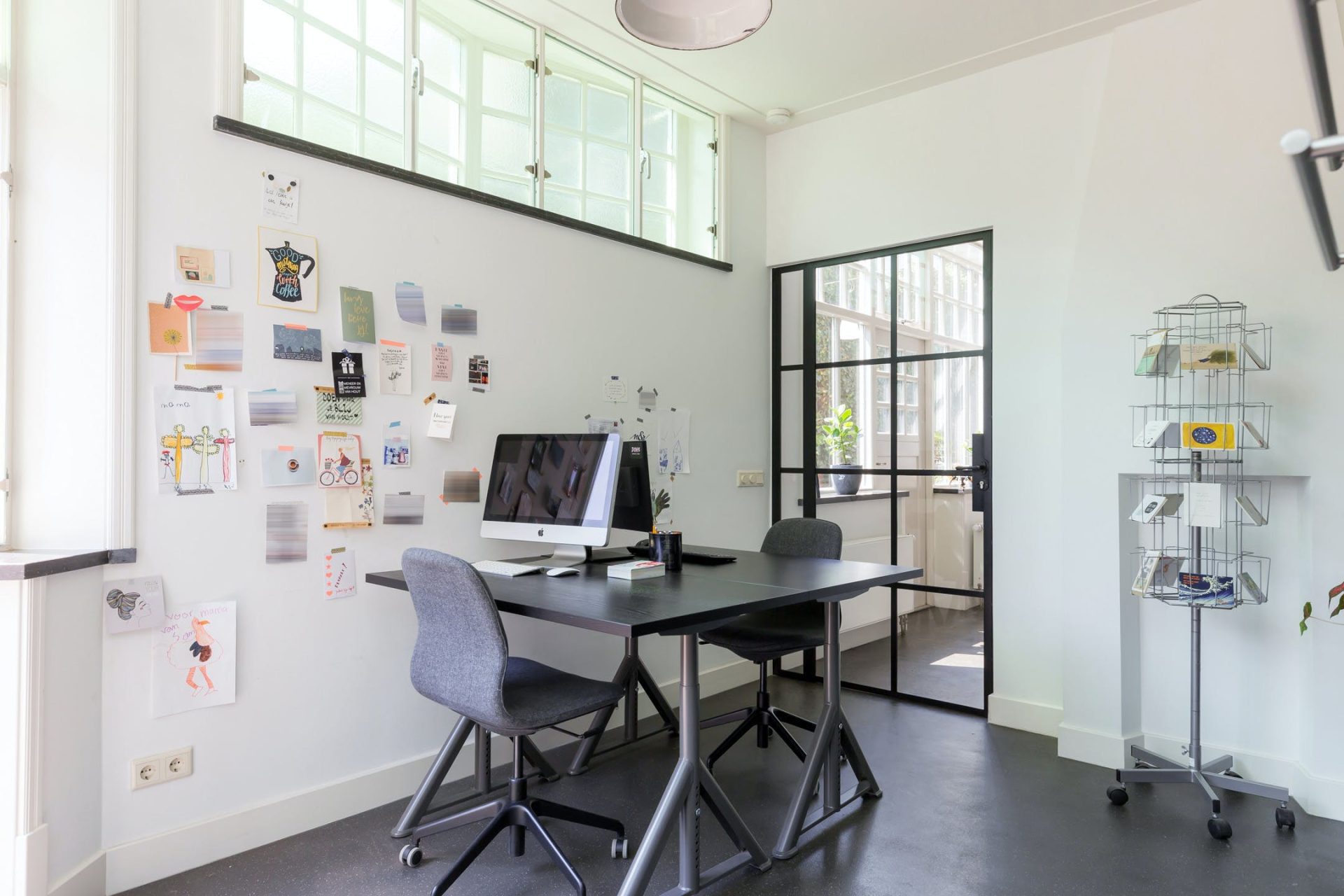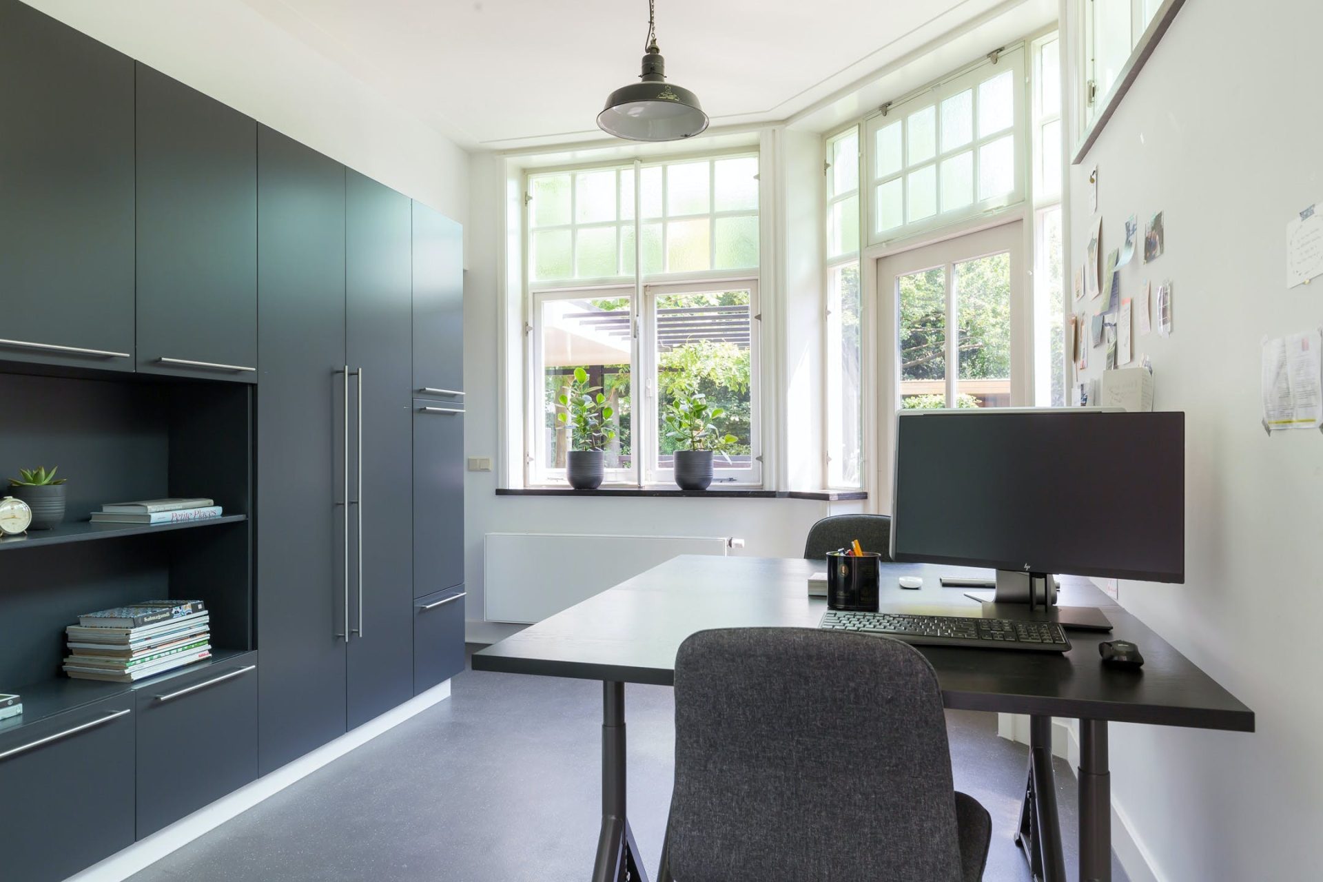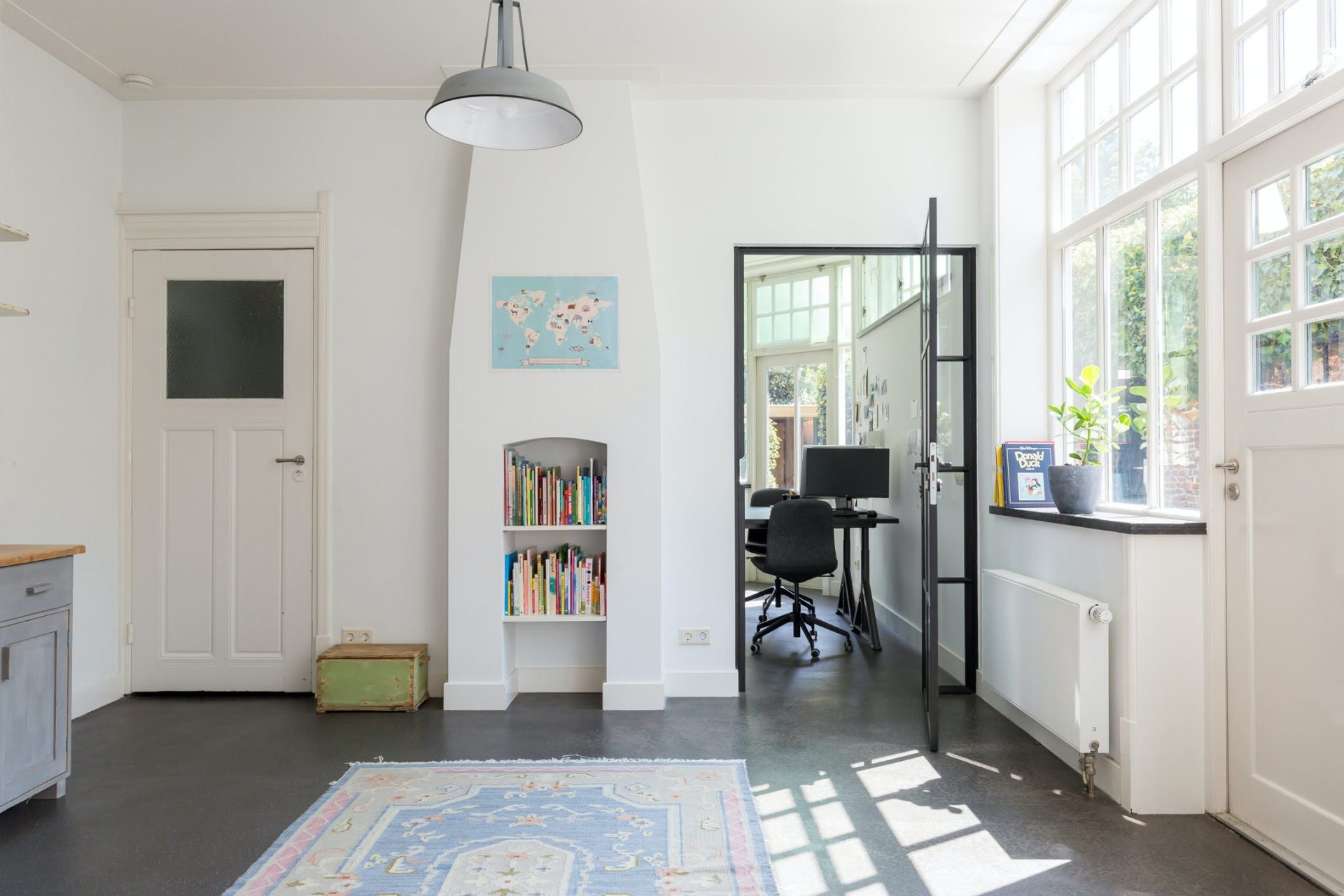De zwarte schuifdeur met glas verbindt de woonkeuken met de speelkamer met aansluitend een fijne werkkamer. In de speelkamer zie je een deur naar de tuin en links van de schouw is een deur naar de toiletruimte. De werkkamer heeft een op maat gemaakte kastenwand en, net als de speelkamer en keuken, een gietvloer met vloerverwarming. In de hoek van de werkkamer is de derde trap naar de eerste verdieping, waardoor het achterhuis zeer geschikt is als gastenverblijf.