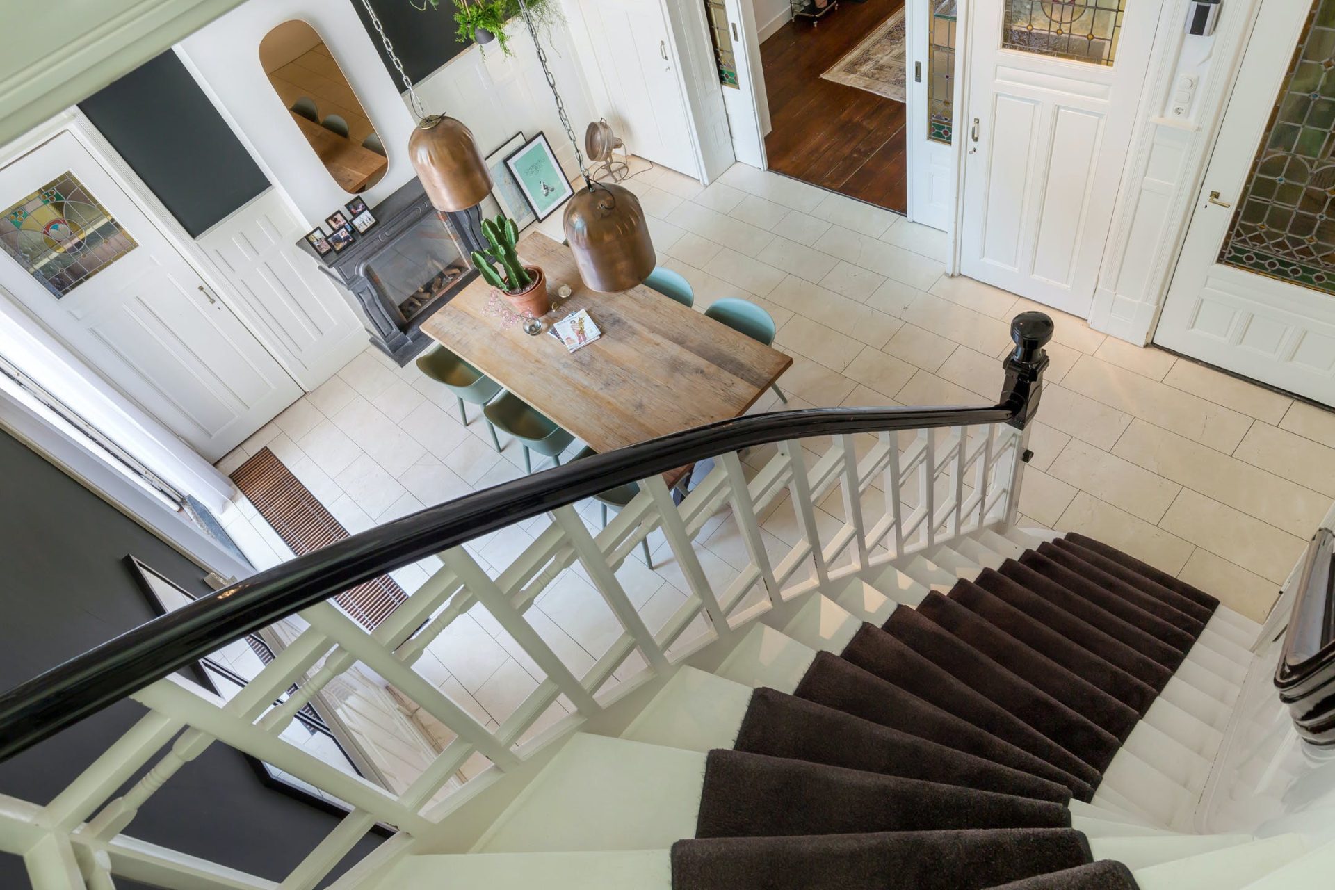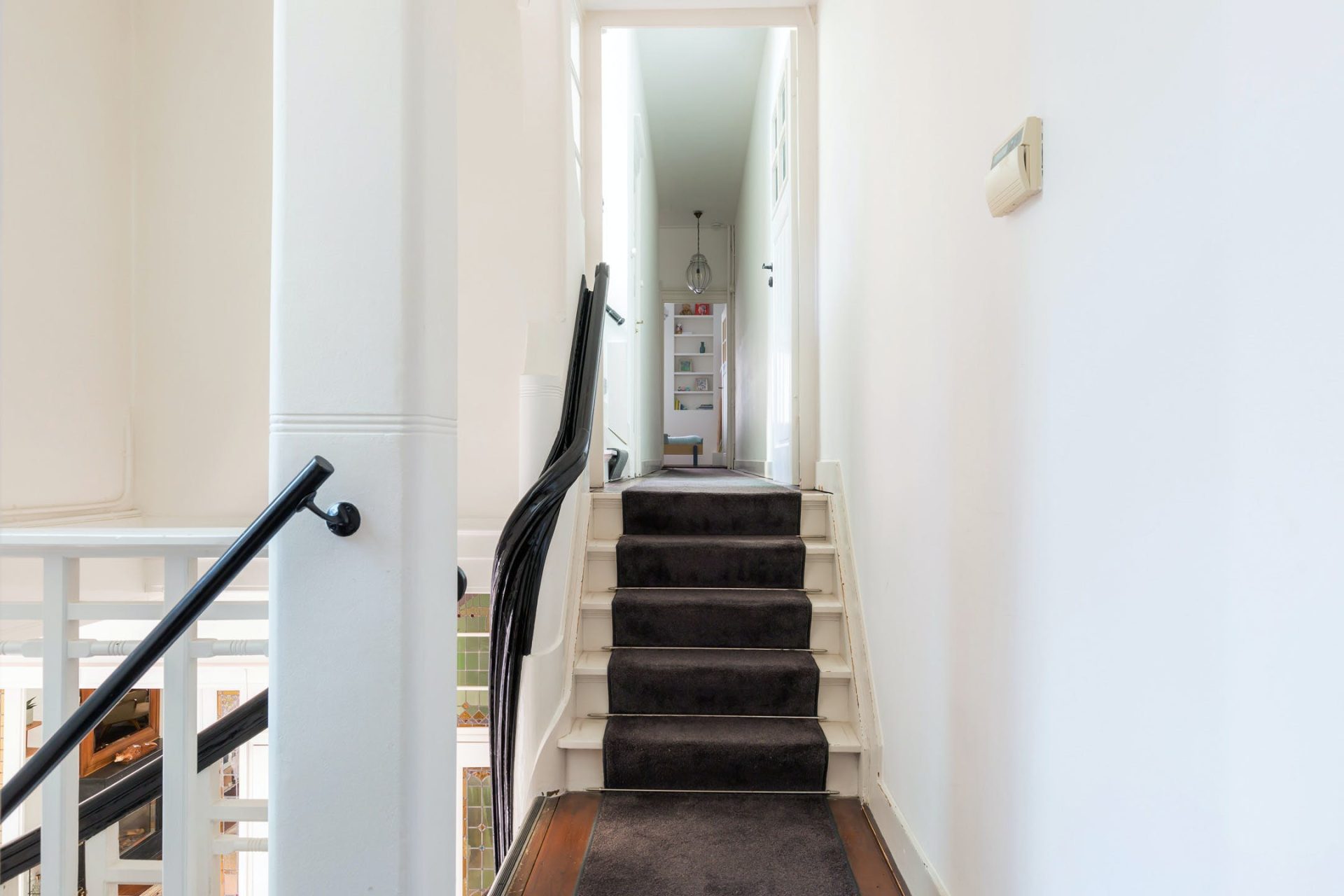 De bordestrap in de eetkamer en de diensttrap in de keuken geven toegang tot de statige overloop. De paneeldeuren, hoge plafonds, houten vloeren, glas-in-loodramen en de rijk gedetailleerde trap hebben een onweerstaanbare charme. In het voorste deel van het herenhuis zijn vier slaapkamers, waarvan een in gebruik is als walk-in-closet. Twee kamers zijn voorzien van een of meerdere vaste kasten en een wastafel. Ook zijn vanaf de overloop een toiletruimte en het dakterras te bereiken.