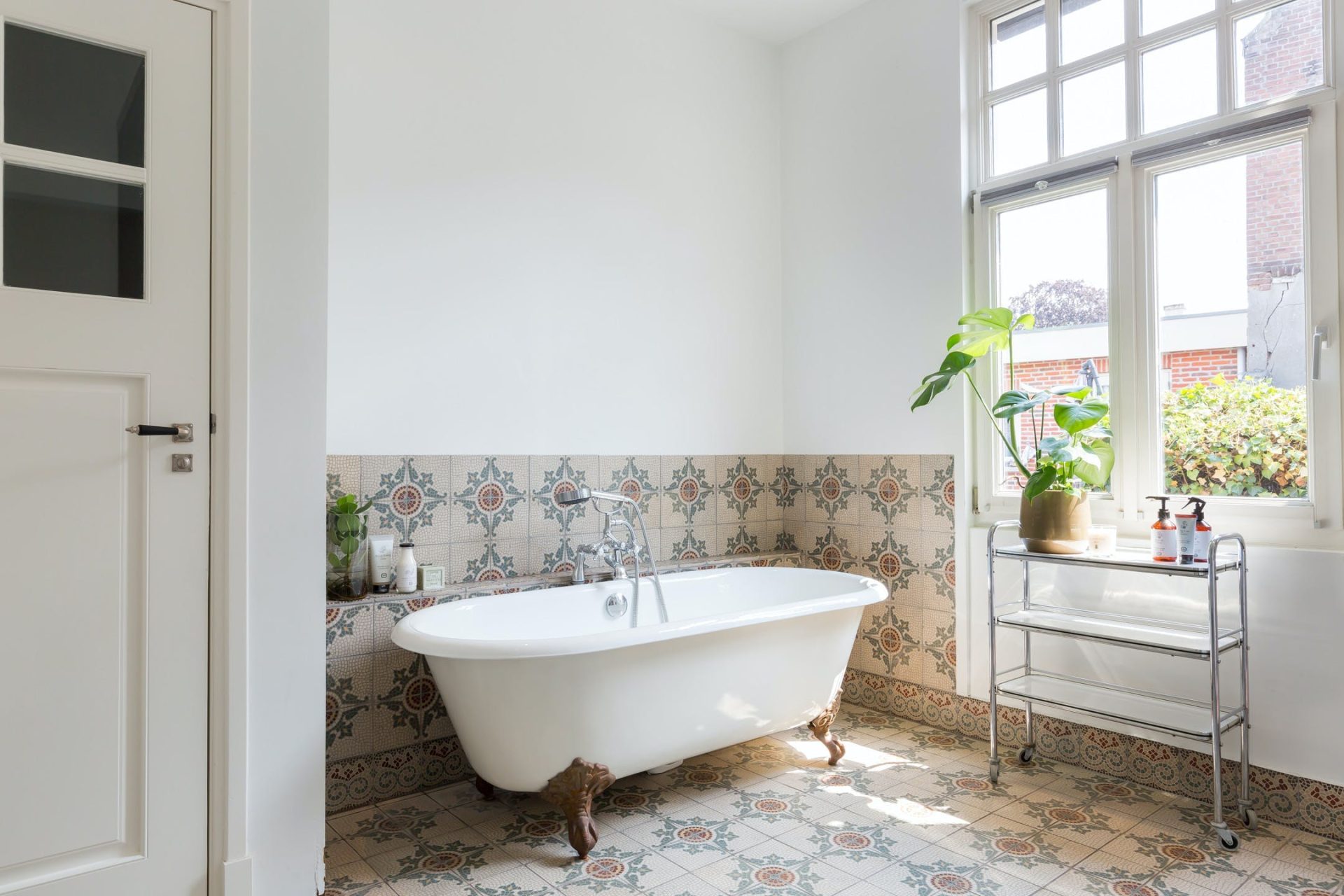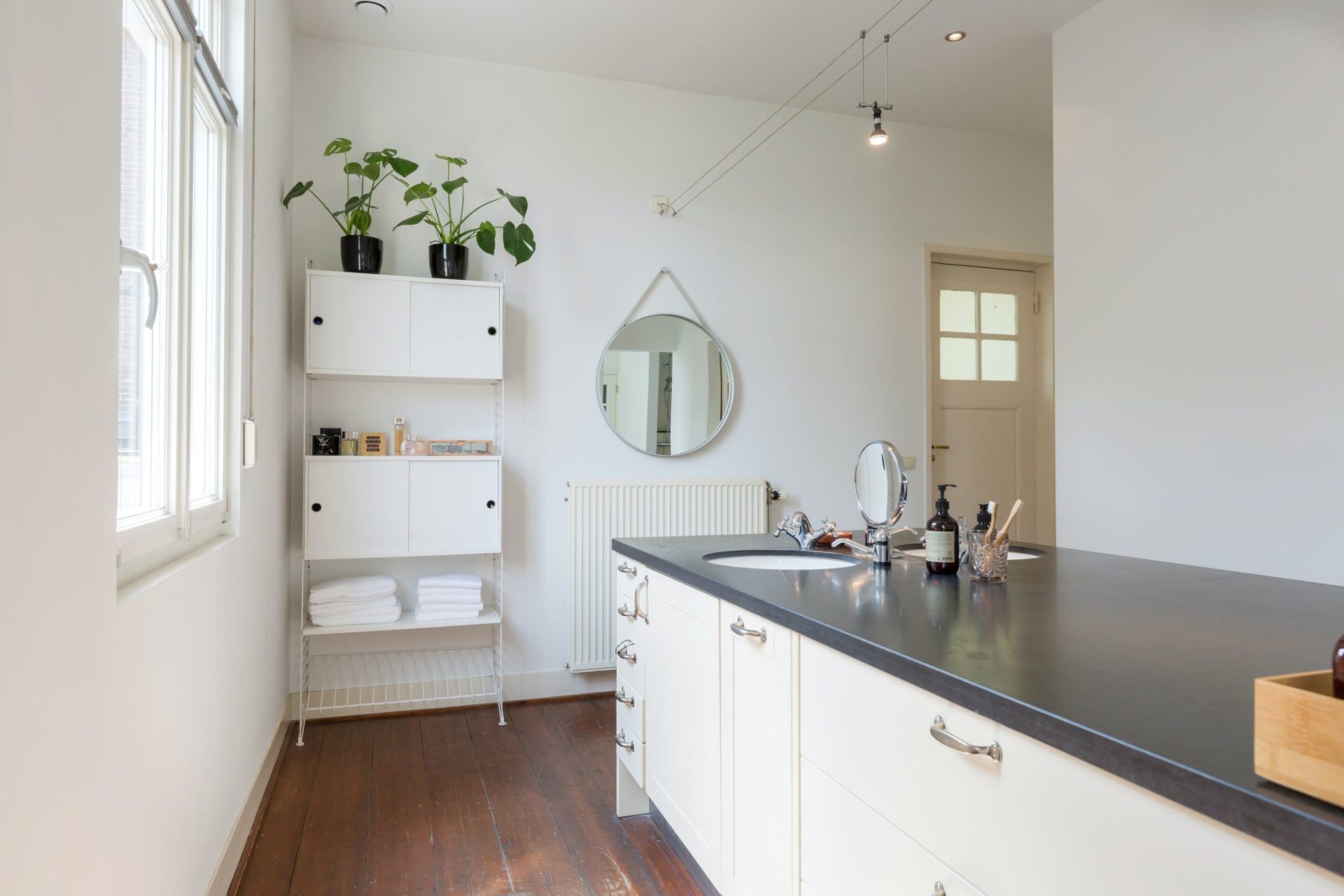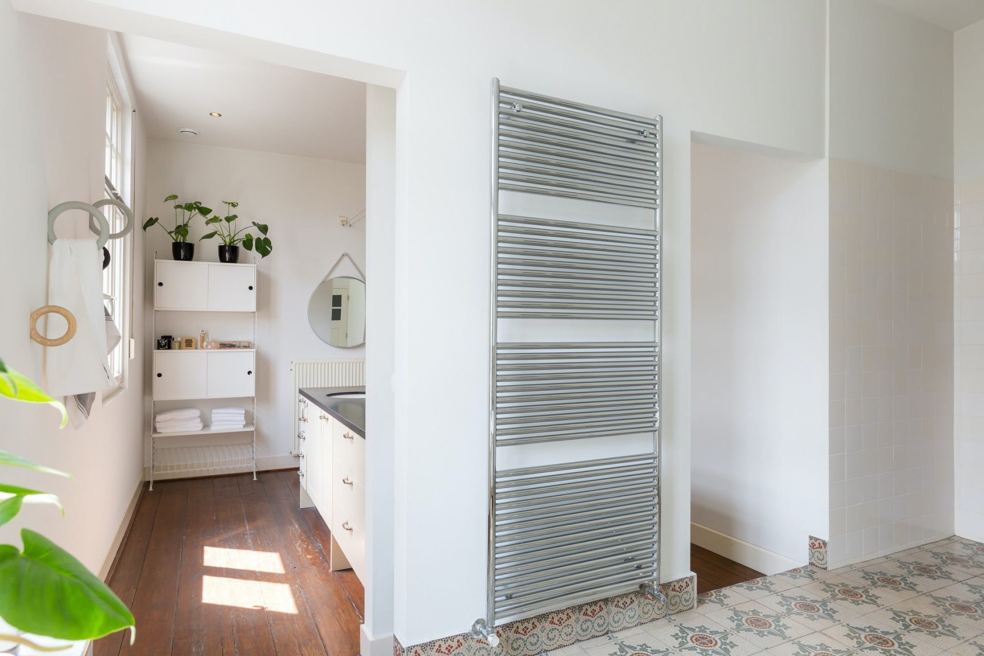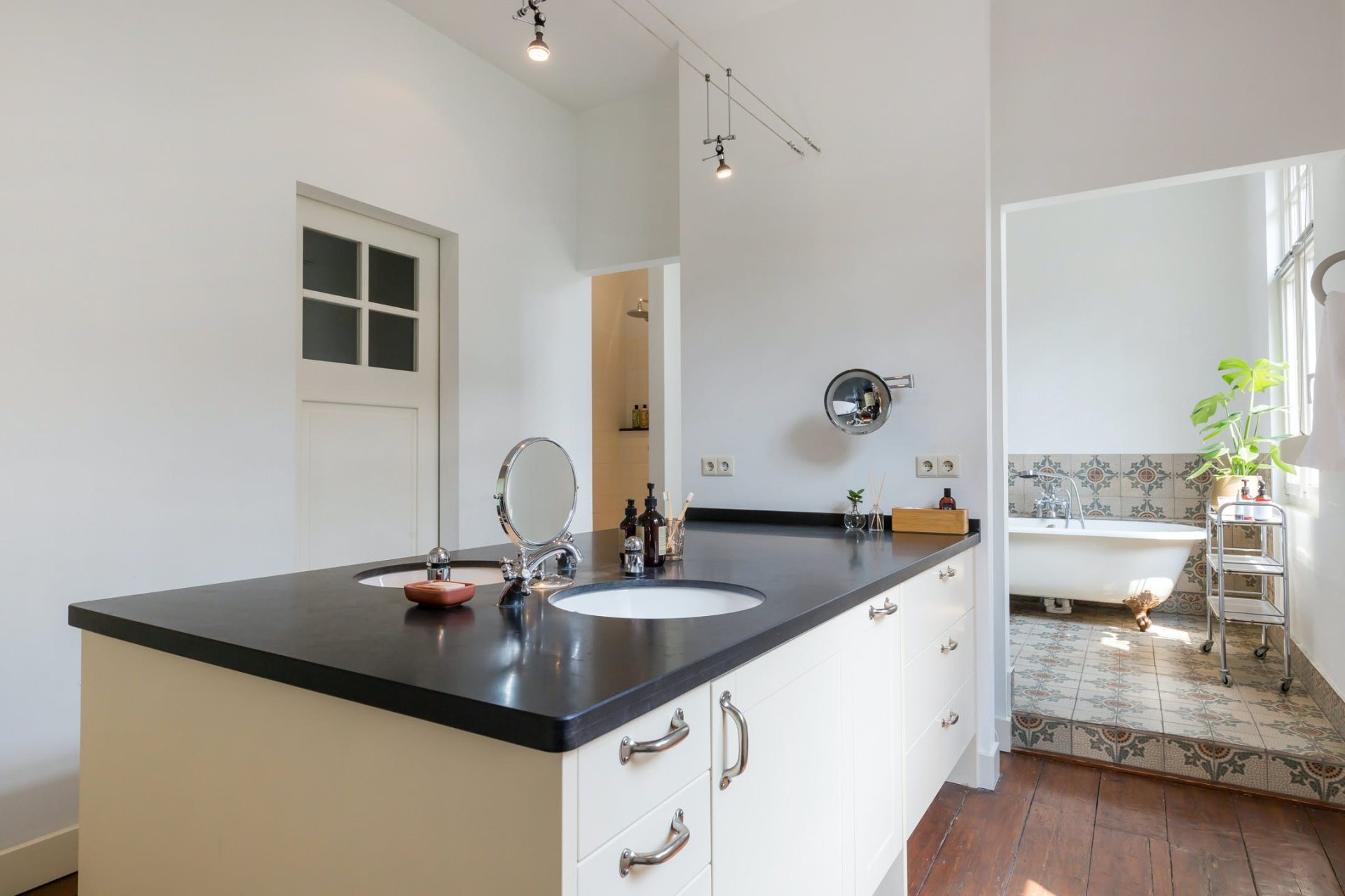 De badkamer bestaat uit twee aaneengesloten ruimtes waar alle benodigde voorzieningen aanwezig zijn. Blikvanger is het vrijstaande bad op pootjes en verder zie je een inloopdouche, afgesloten toiletruimte en een op maat gemaakt wastafelmeubel met twee wastafels. In een deel van de badkamer is de originele houten vloer zichtbaar en onder de tegelvloer ligt vloerverwarming.